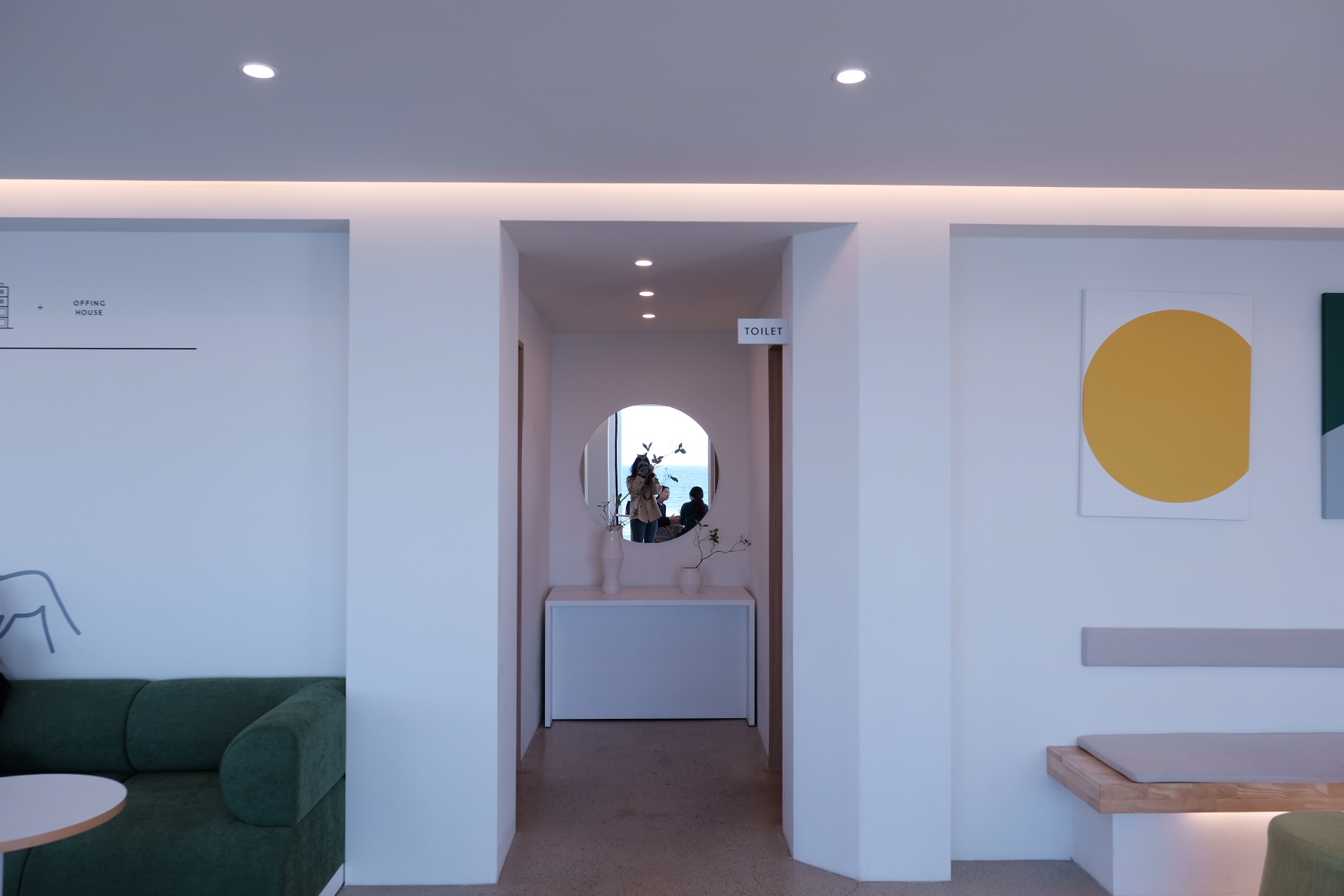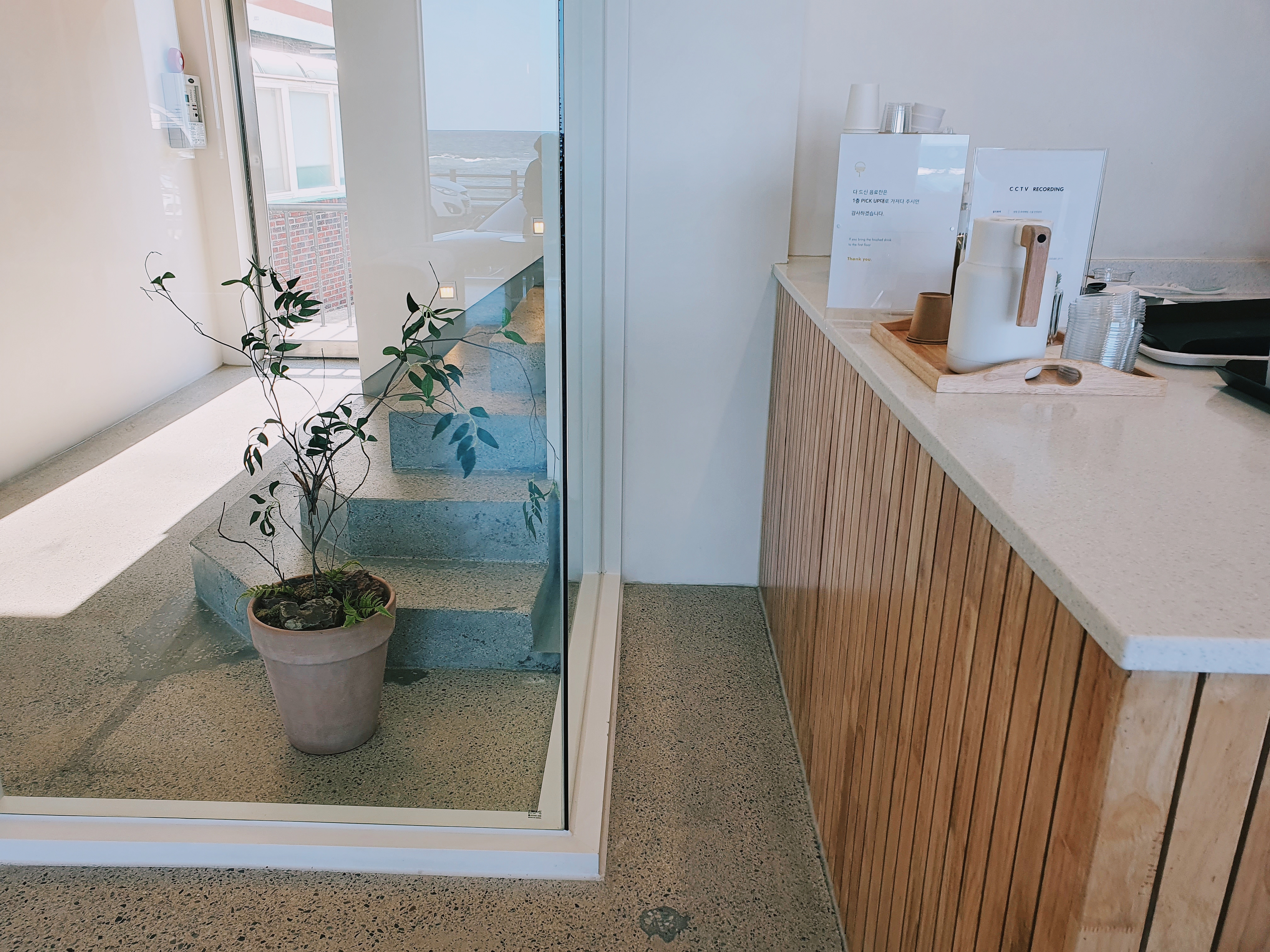 건물 외벽과 같은 화이트 인테리어에, 따뜻한 느낌을 주는 가구는 정말 잘 어울리는 것 같아요. 그리고 초록초록한 식물들도 적절히 배치되어 있어서 좋았습니다. 새파란 주문진 바다와 대비되어 포근함을 느낄 수 있었어요.