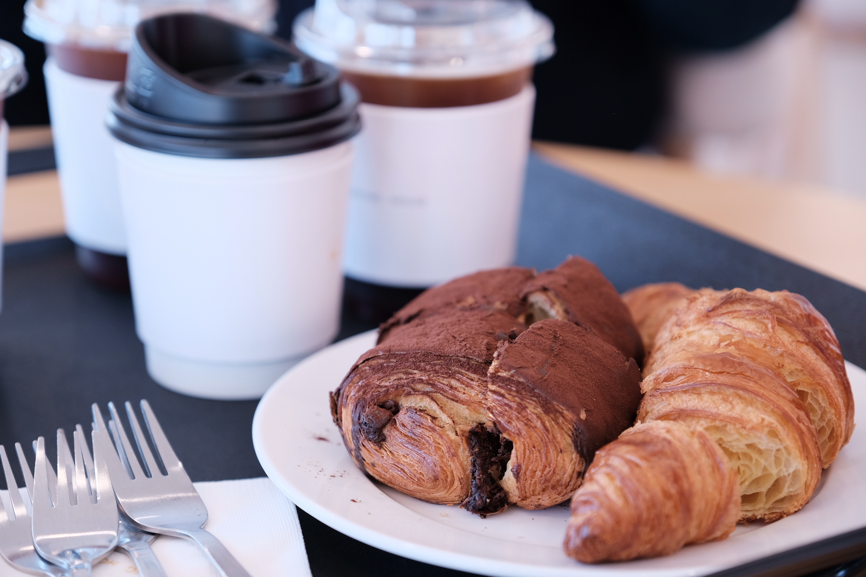 오핑하우스에서는 오리지널 크루아상, 앙버터 크루아상, 초코 크루아상, 뺑오쇼콜라 등 페이스트리 6종과 브라우니, 그리고 치즈케익을 팔고 있습니다. 빵과 커피를 주문하고 계단을 따라 2층으로 올라갔어요.
