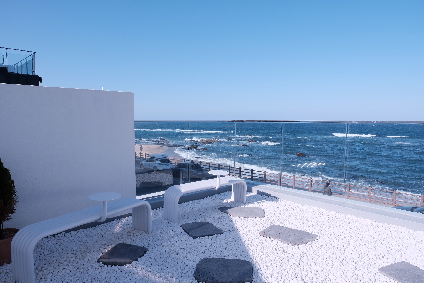 새파란 주문진의 바다와 어울리는 순백색의 예쁜 건물이 멀리서도 보였습니다. 멋진 바다를 감상할 수 있는 통유리로 된 1~2층이 카페이고, 3~4층은 펜션으로 운영 중이었어요. 건물 바로 앞에 주차 공간이 있고, 왕복 2차선의 해안 도로 옆을 따라 주차할 수 있습니다. 사람들이 많이 찾는 관광지는 아니기 때문에 주차는 어느 정도 여유가 있는 편이었지만, 차가 많이 지나다니기 때문에 주차할 때 조심할 필요는 있습니다.
