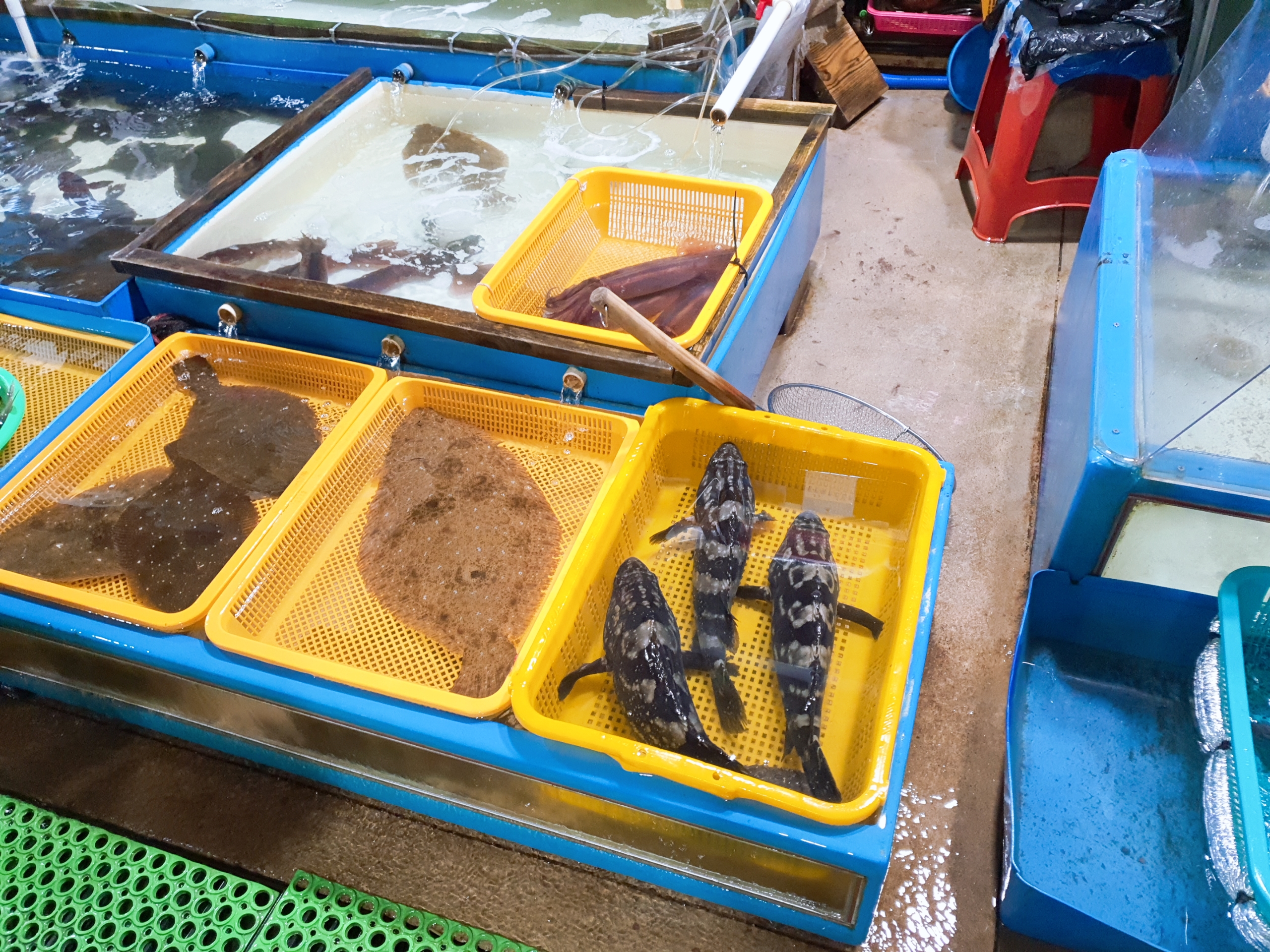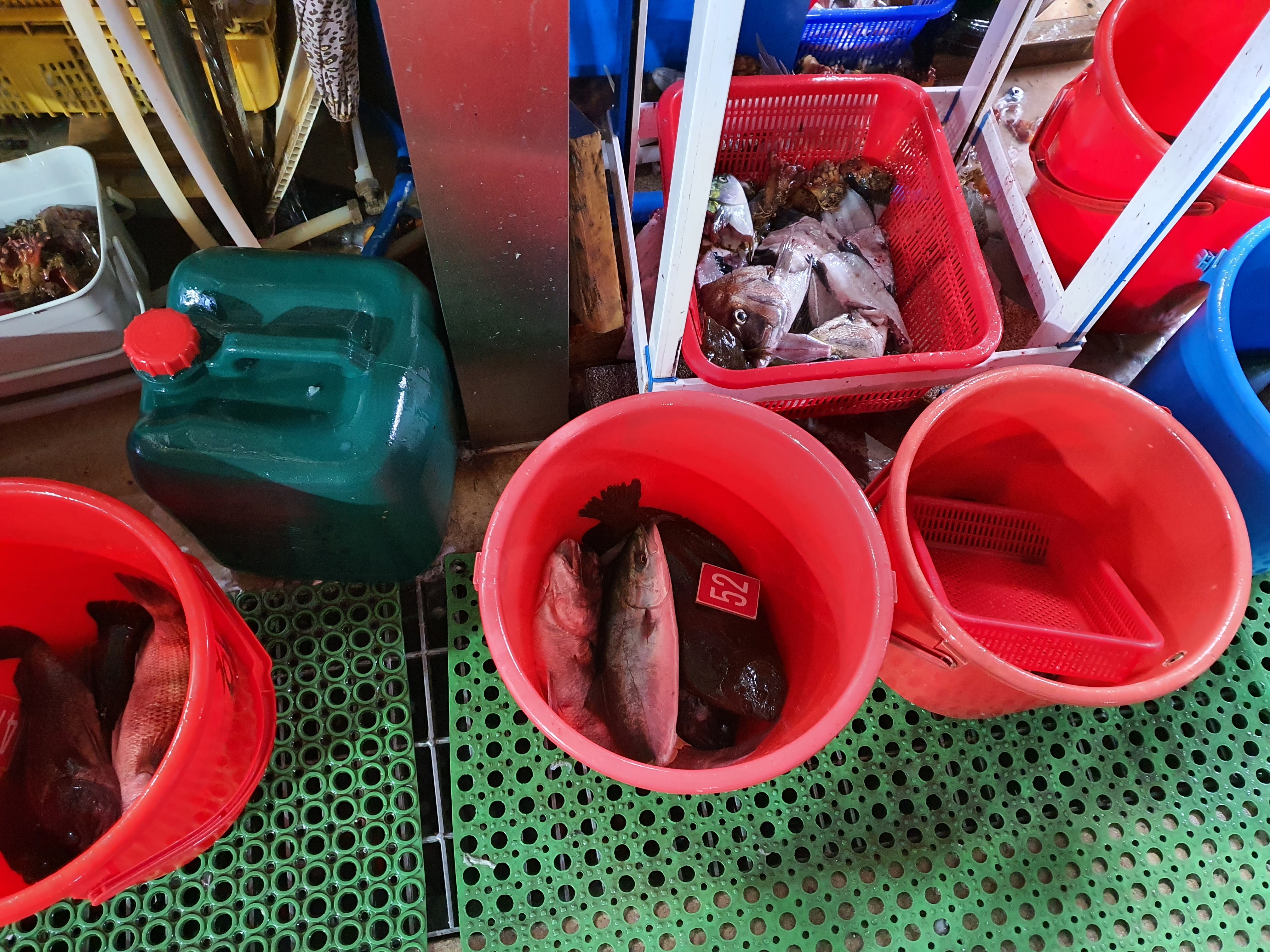 앞에서 언급한 빨간 통의 정체는 바로...! 회를 뜰 생선을 담아두기 위한 것입니다. 풍물시장 입구에 회를 떠주는 장소가 있습니다. 가격 흥정이 끝나면, 가게 주인과 함께 입구 쪽에 갑니다. 가게 주인이 횟감을 빨간 통에 담고 번호표도 함께 넣습니다. 손님은 이때 물고기 값을 지불하는데, 할복비는 별도입니다. 아주머니들이 순서대로 손질하기 때문에 번호를 꼭 기억해야 합니다.