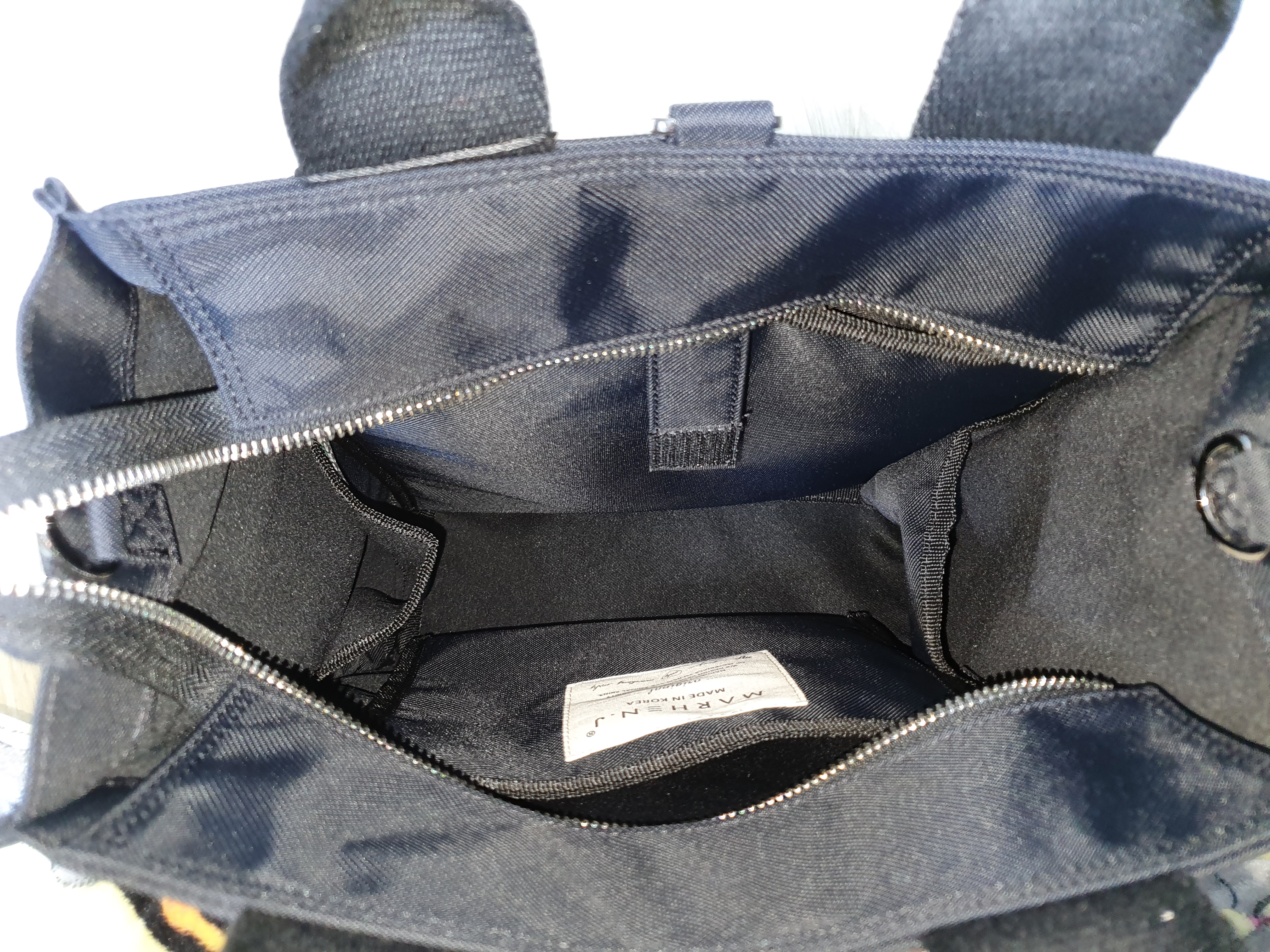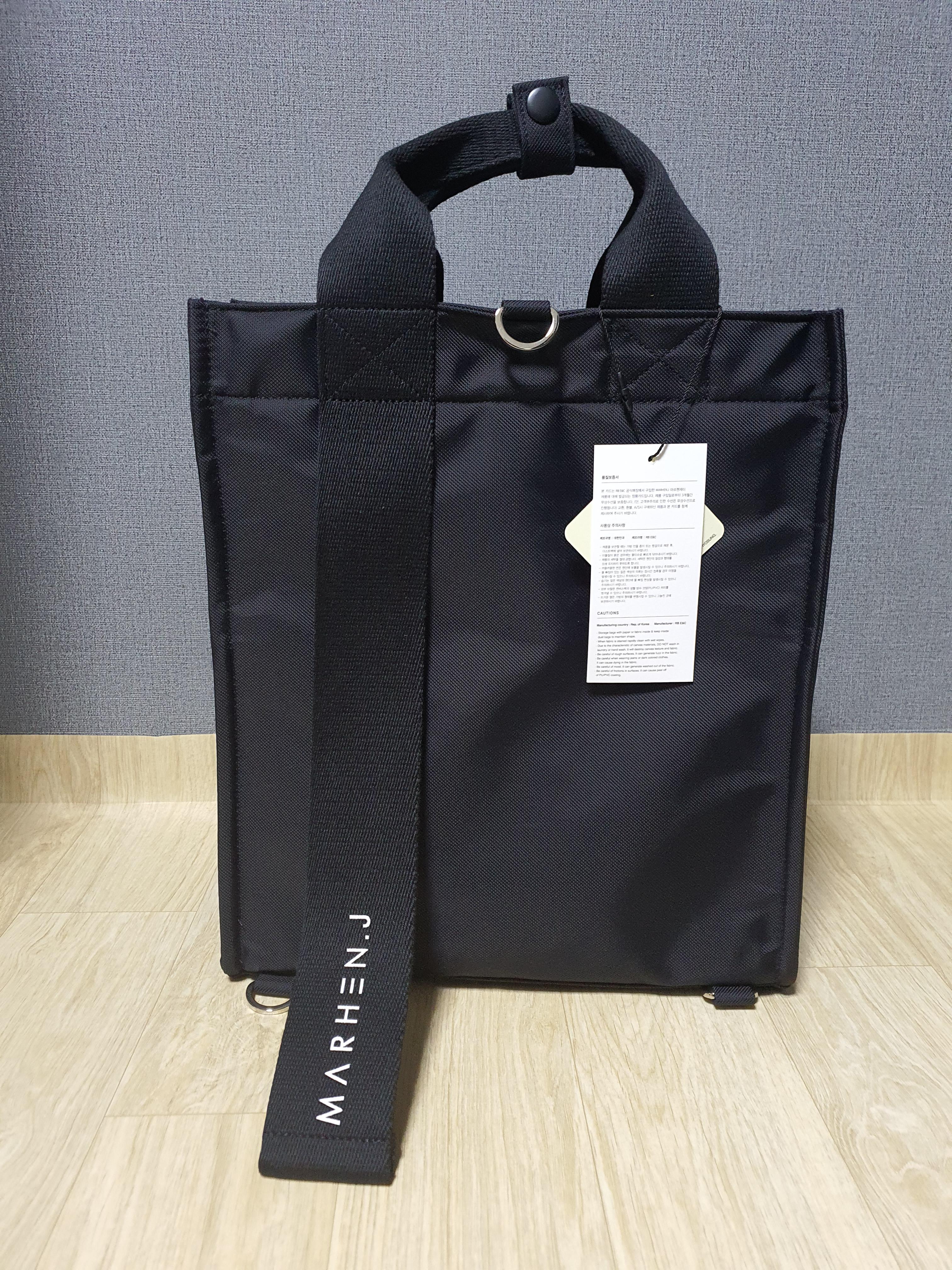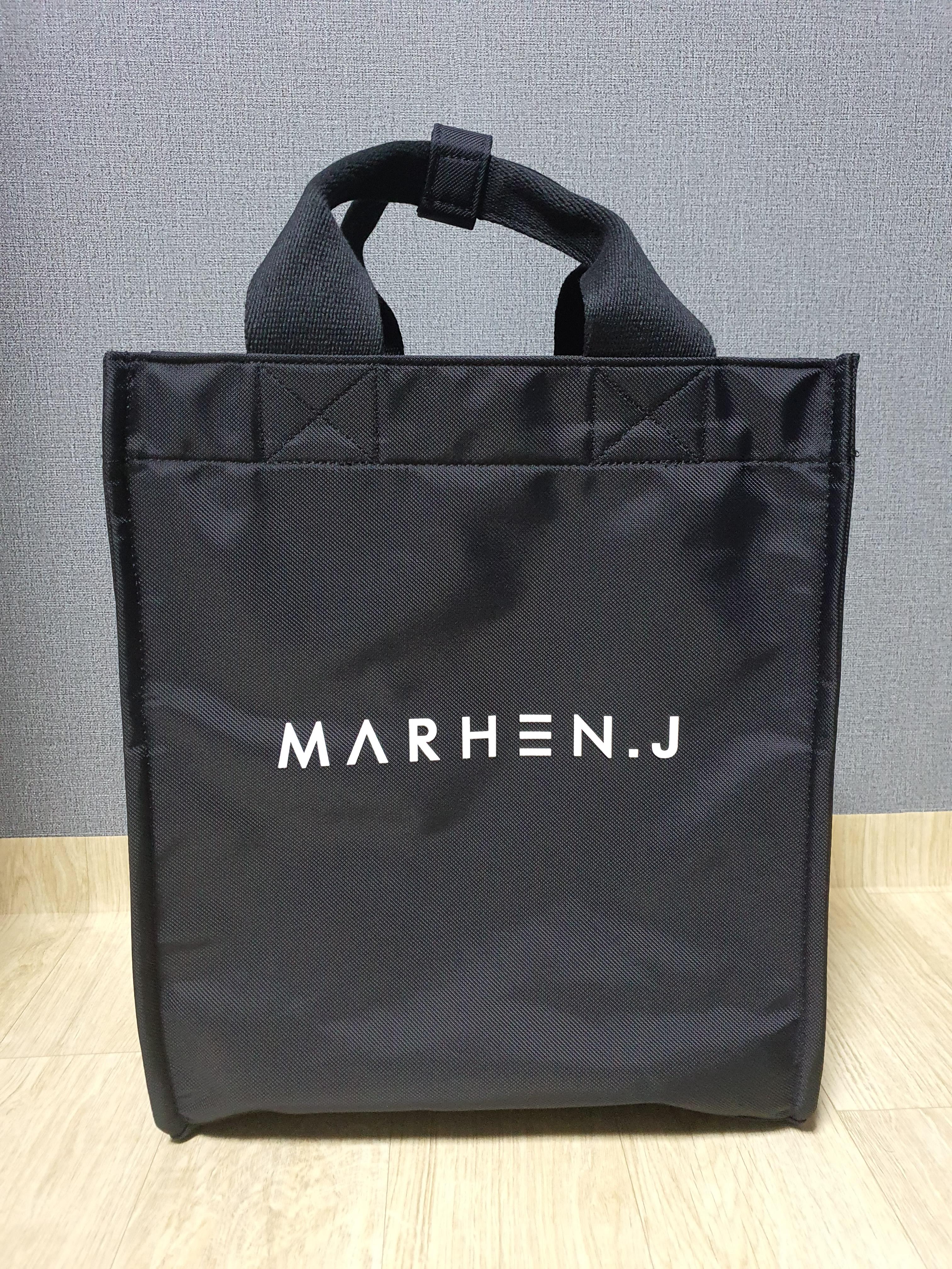 앞모습입니다. 올블랙 제품이라 손잡이도 까맣습니다. 완전 직사각형 제품으로, 사이즈는 높이 32.5cm x 가로 28.5cm x 세로 13cm입니다. 가운데 부분에 하얀색으로 MARHEN.J가 쓰여 있어요.