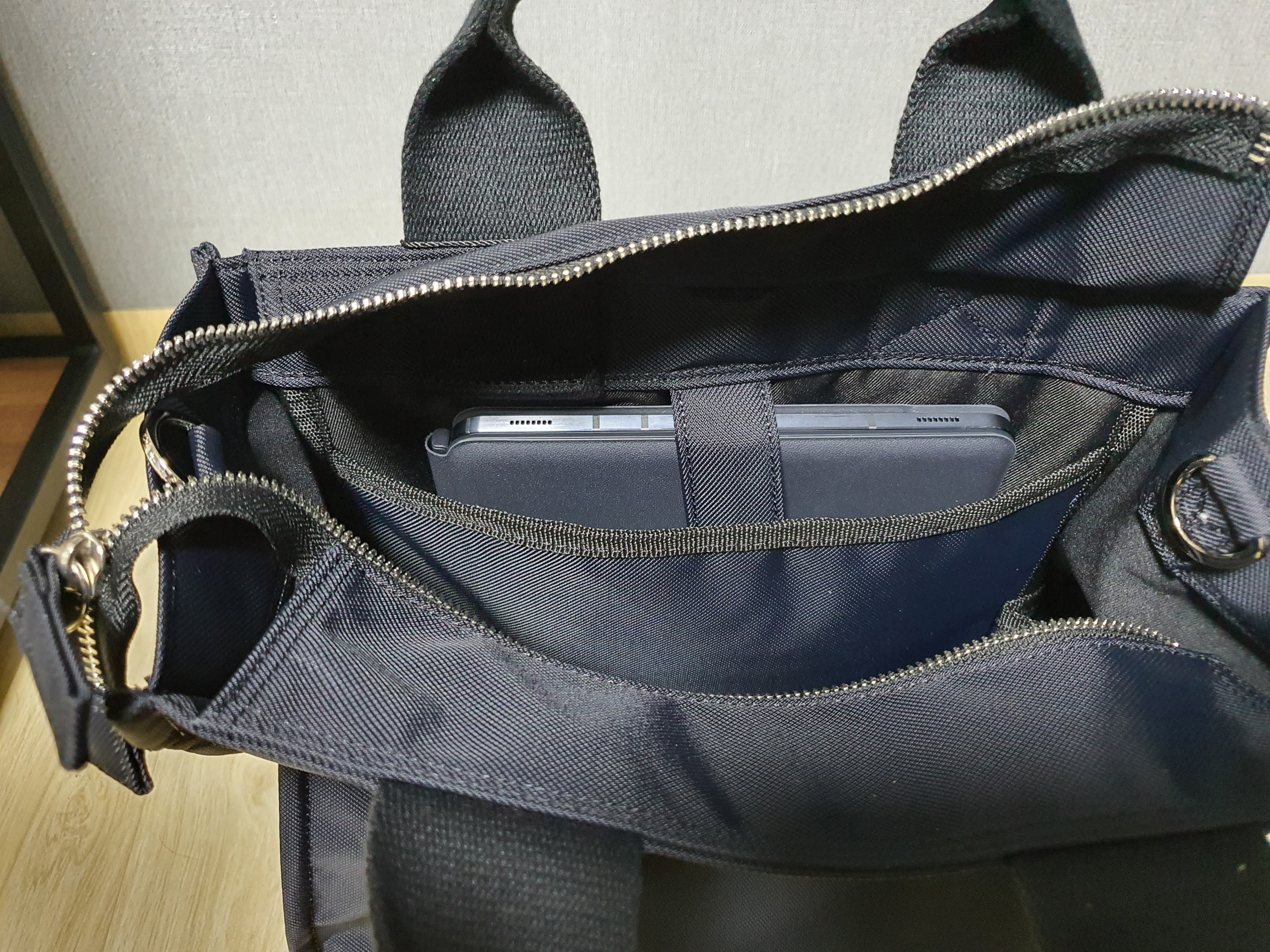 가방 지퍼를 열면 먼저 등이 닿는 쪽에는 깊은 안주머니가 있습니다. 이번에 산 갤럭시탭 S7과 13인치 노트북을 한 번 넣어봤어요.