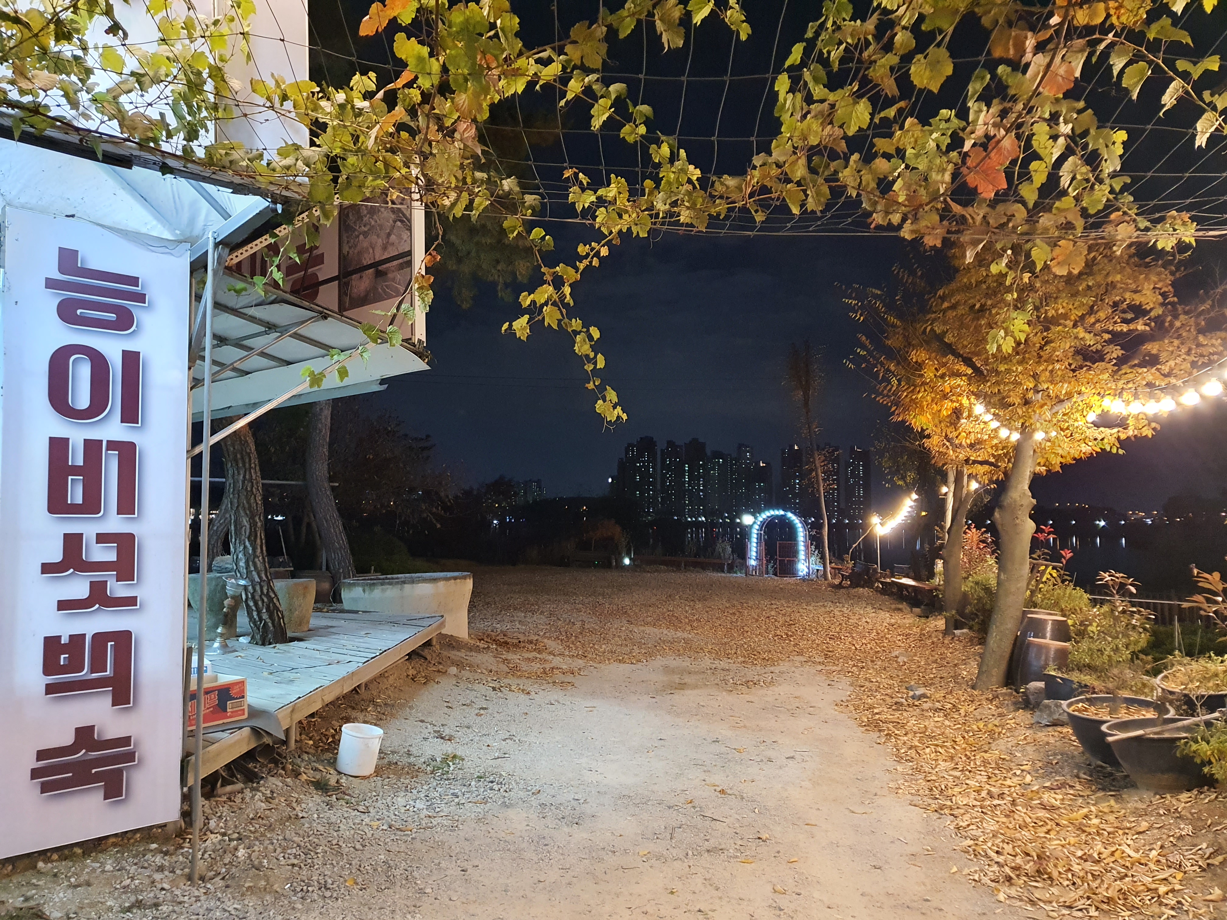식사를 끝내고 나오니 해가 지고, 달이 떴습니다. 왕송호수 너머 보이는 도시의 아파트 불빛과 새우대농장의 시골 풍경이 대조되며 저절로 감성에 젖어들게 되었어요. 조명도 너무 예뻐서 오랜만에 엄마와 사진을 잔뜩 찍었구요.