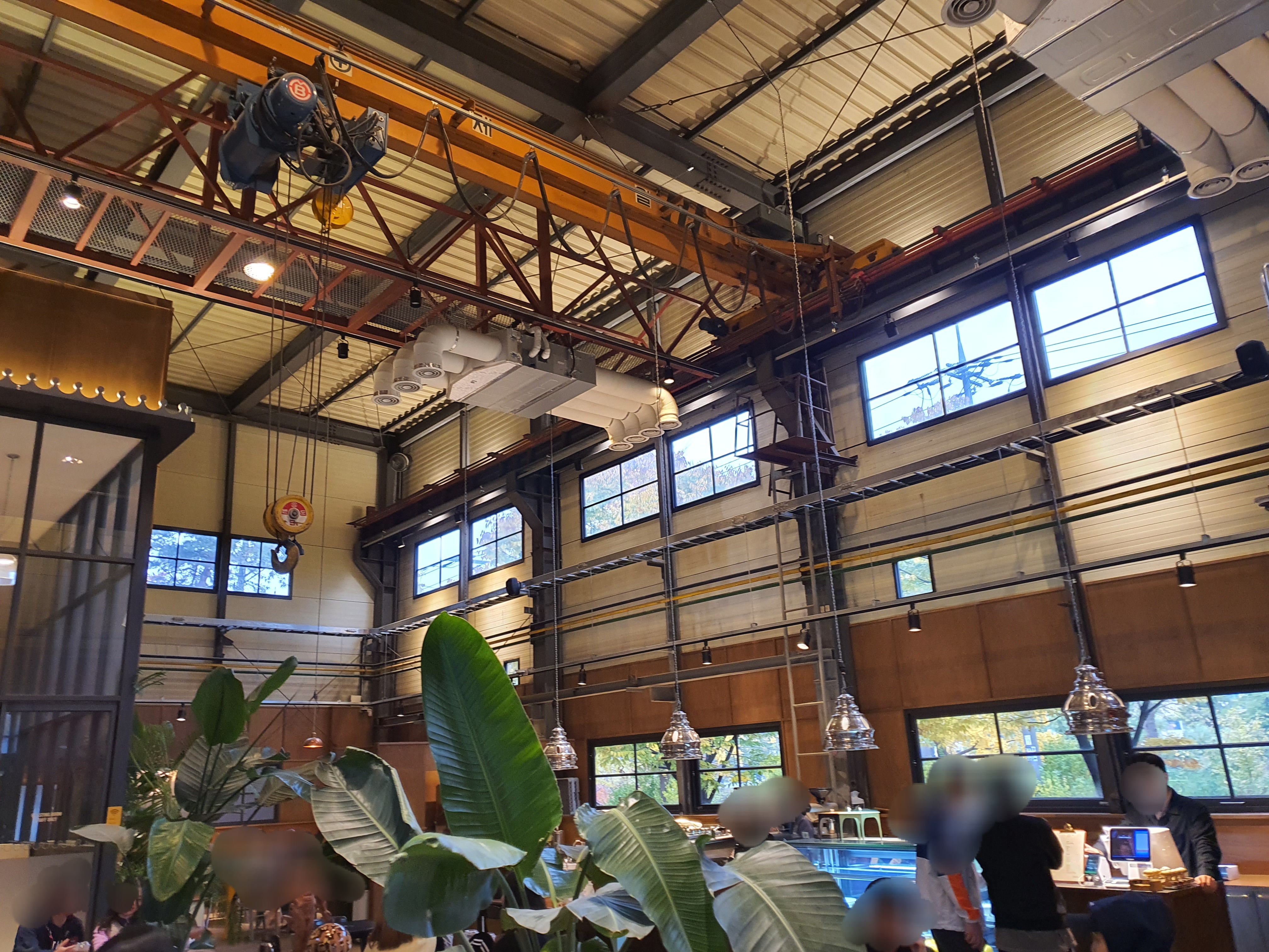카페 내부도 공장의 특징을 잘 살려서 빈티지하면서 독특한 느낌이 납니다. 내부에는 대형식물이 많은데요, 특히 여인초가 많아요. 저도 여인초를 기르고 있는데, 까다롭지 않고 잘 자라면서 기르기 편한 식물이에요. 카페에서도 식물 상태를 보면 여인초 외에는 그닥 잘 지내는 것 같지는 않더라고요.