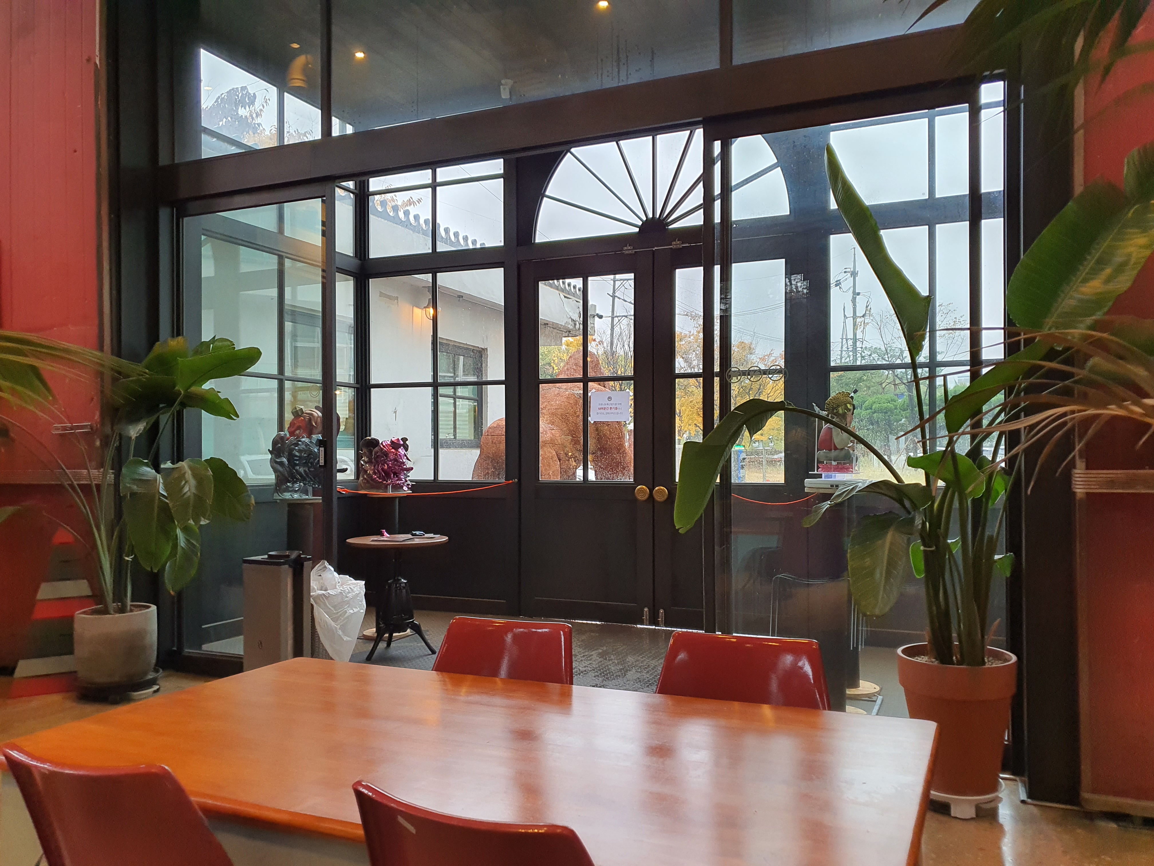 창밖으로 단풍이 든 나무가 보여서 계속 눈길이 갑니다. 유리창 모양도 평범한 것 같으면서도 옛스럽기도 한 묘한 매력이 있어요.
