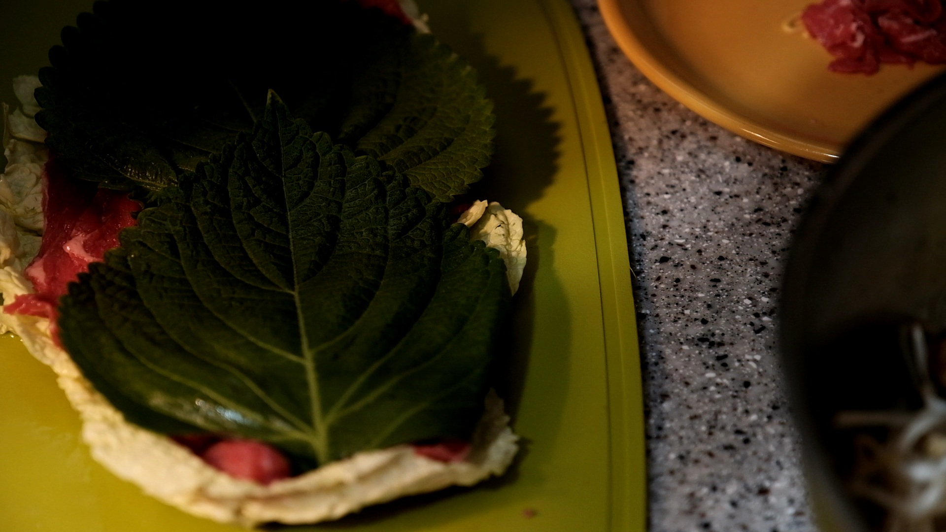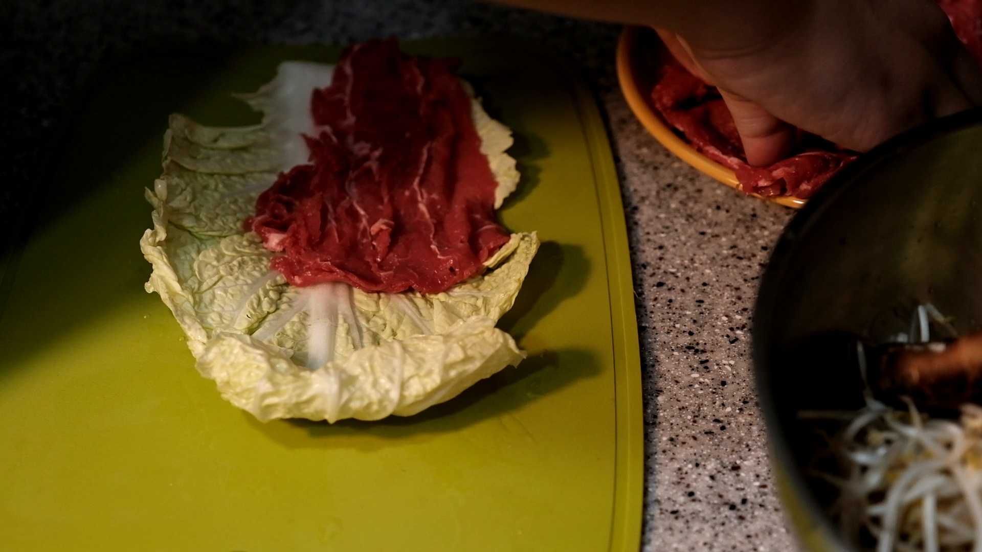 이제 밀푀유 나베의 꽃인 고기와 채소를 겹겹이 쌓는 작업을 합니다. 먼저 배춧잎을 바닥에 깔고 고기를 위에 올려 줍니다. 다음으로 깻잎으로 덮어주고 다시 배춧잎으로 덮어 줍니다. (배추잎→소고기→깻잎→배춧잎)