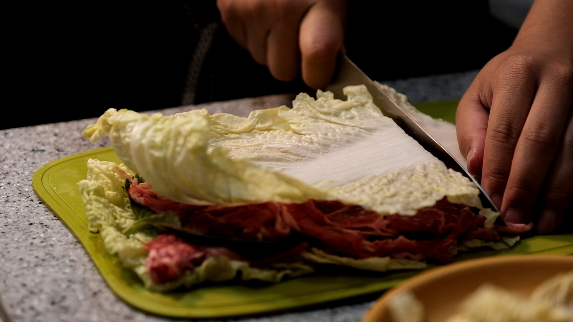 완성된 고기쌈(?)은 4~5cm 간격으로 잘라줍니다. 간격은 정해진 건 아니고, 사용하고자 하는 냄비의 높이에 따라 유동적으로 결정해 주시면 됩니다.