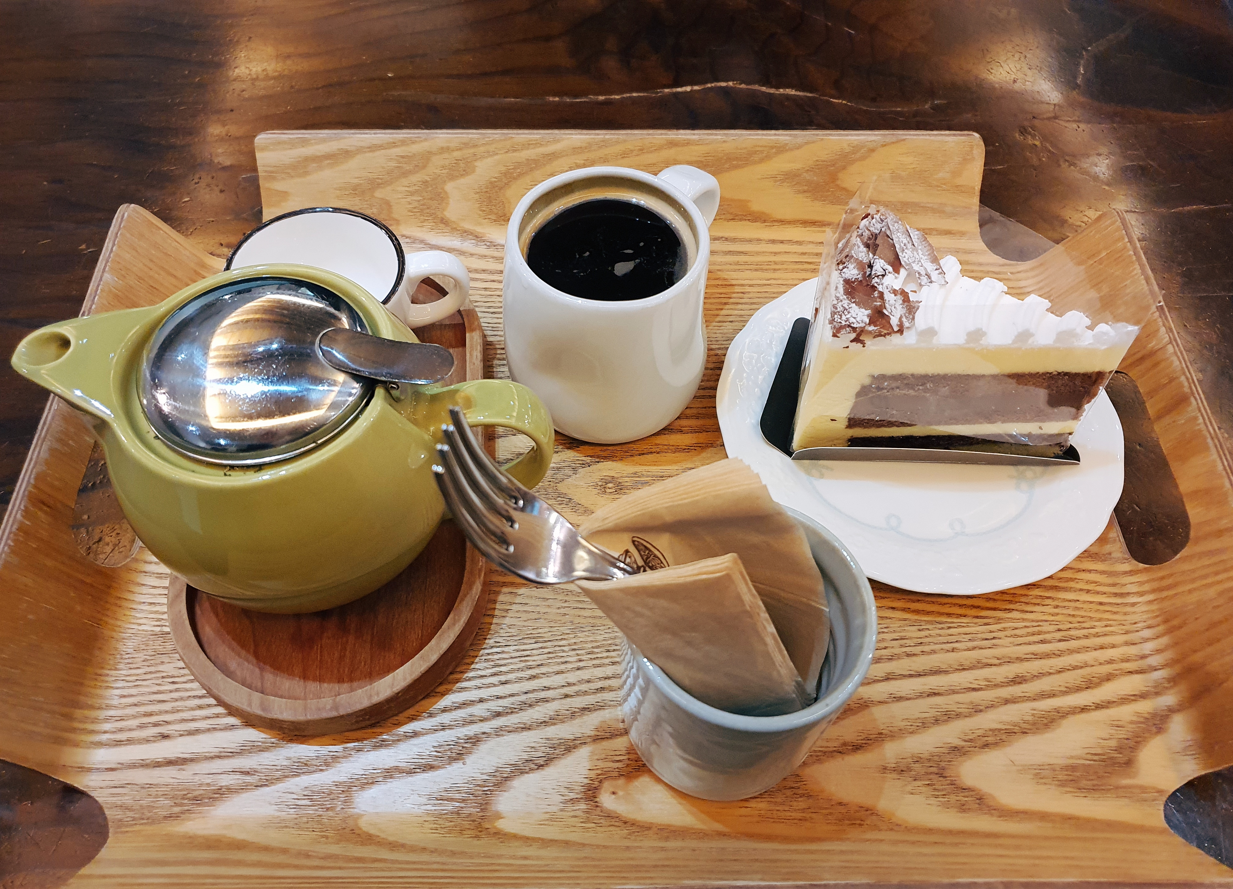 남편은 따뜻한 아메리카노를 시켰는데, 커피맛은 무난한 편이었다고 합니다. 자리에 앉아 블로그를 찾아보니 드립 커피가 정말 맛있다고 하네요. 케이크는 시간이 좀 지났는지, 겉이 약간 푸석한 느낌이었어요.