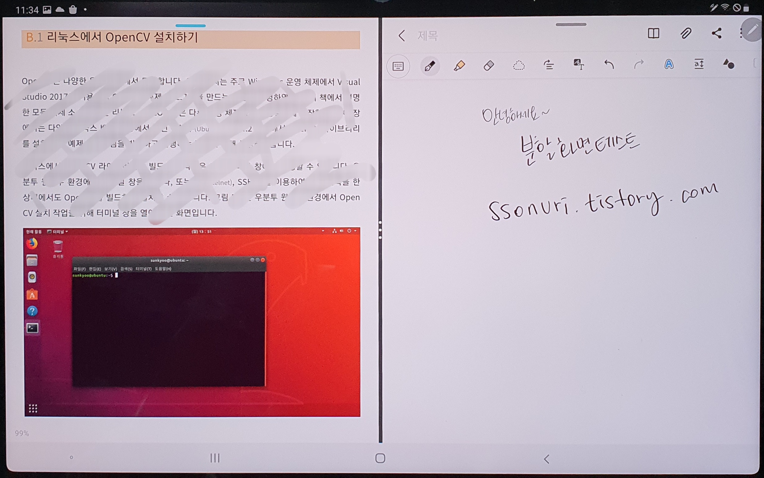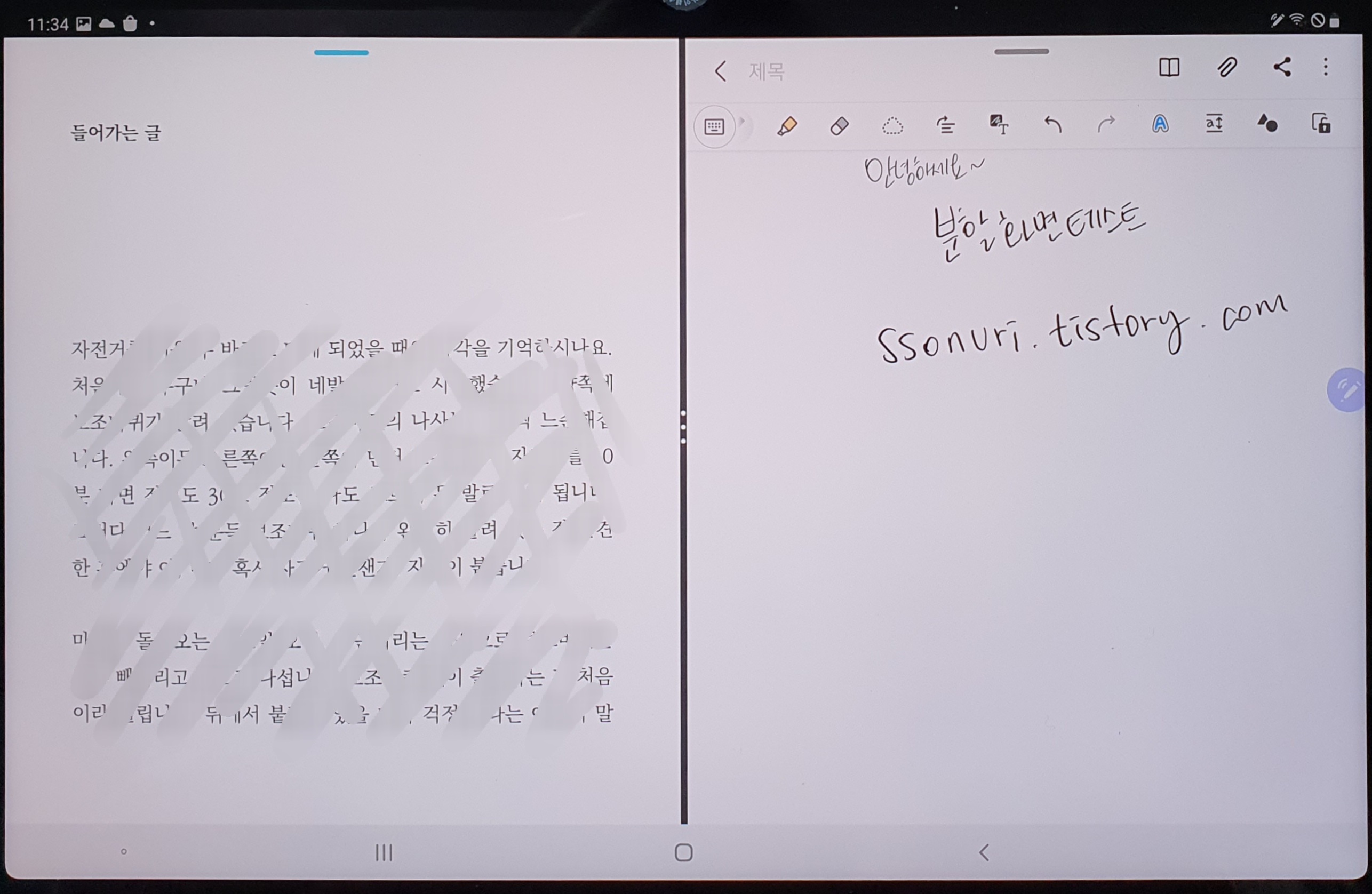 삼성 Notes 앱으로 멀티윈도우를 사용하는 화면을 보여드립니다. Noteshelf 와 큰 차이는 없네요. 저만 그런건지 모르겠는데, Noteshelf보다는 Samsung Notes가 실제 필기체와 유사하더라고요. 기능은 Noteshelf가 더 좋은데, 글씨를 쓰는 느낌은 Samsung Notes가 더 좋아서, 둘 다 쓰고 있습니다.