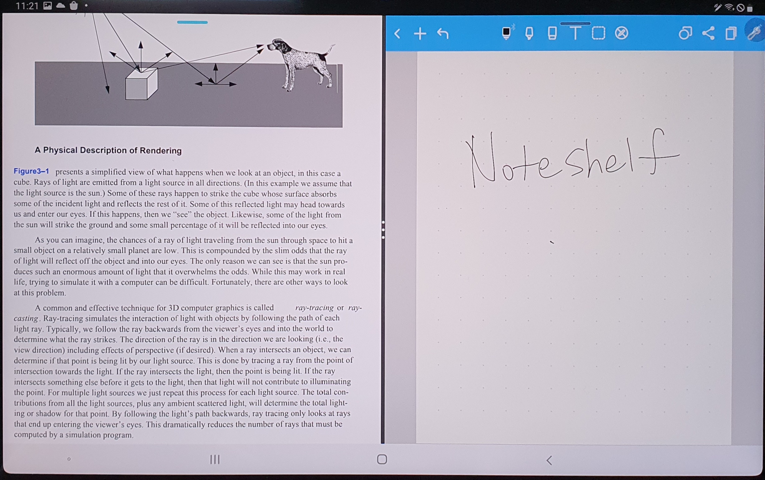 Noteshelf는 원래 유료 필기앱인데, 갤럭시탭 S7에 선탑재 되었습니다. 개인적으로 Noteshelf는 꽤 괜찮은 노트앱이라고 생각이 들어요. 저는 멀티윈도우 기능과 함께, Noteshelf 앱을 종종 사용합니다.