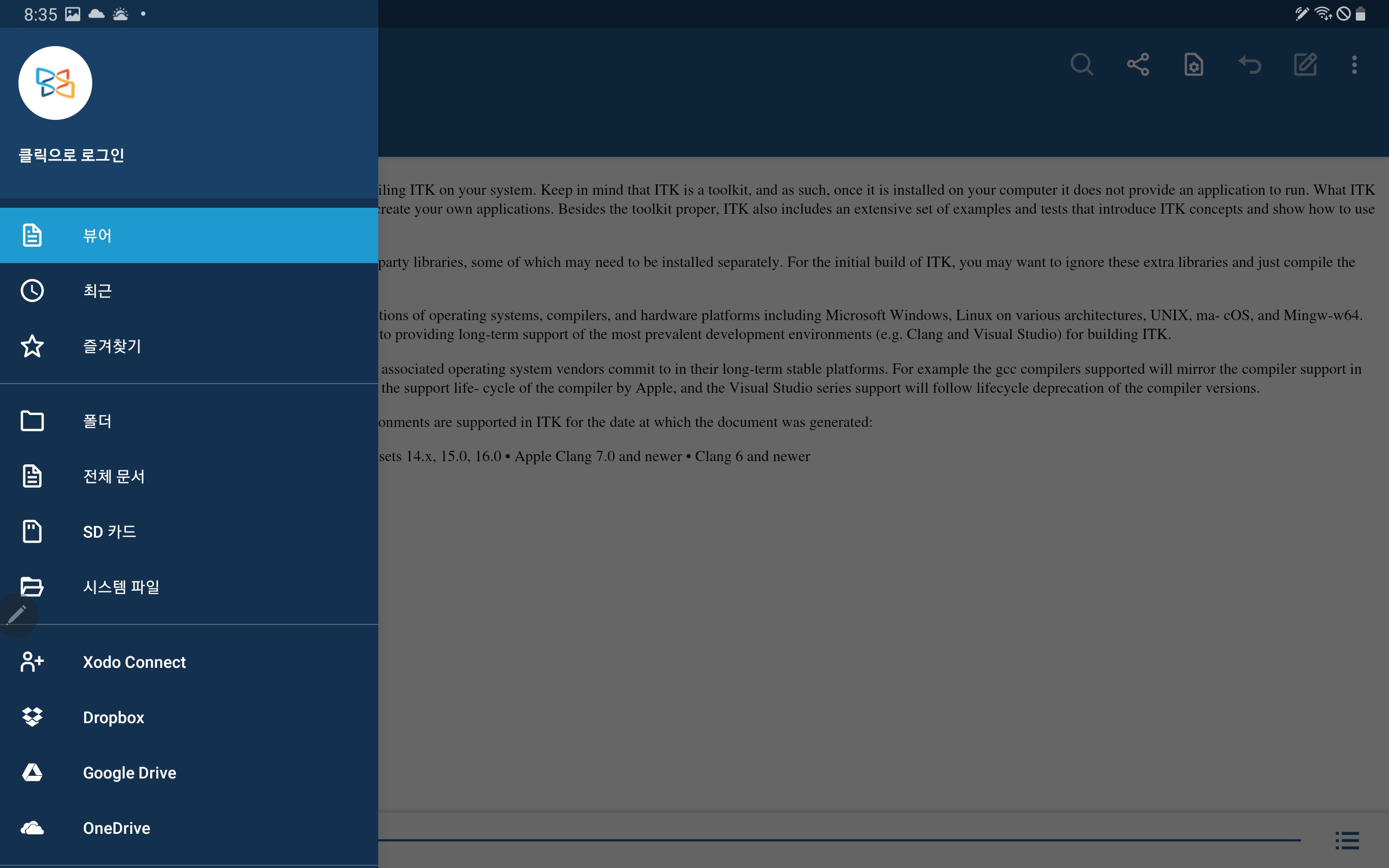 화면 왼쪽 상단에 작대기 3개 버튼을 누르면 왼쪽 화면에 메뉴가 뜹니다. 여기서 내부 폴더, SD카드 뿐 아니라 Xodo Connect, Dropbox, Google Drive, OneDrive와 같은 클라우드 서비스에서 나의 저장공간에 있는 pdf 파일을 불러올 수 있습니다. XODO 앱이 상당히 직관적이어서 자세한 설명은 생략합니다.
