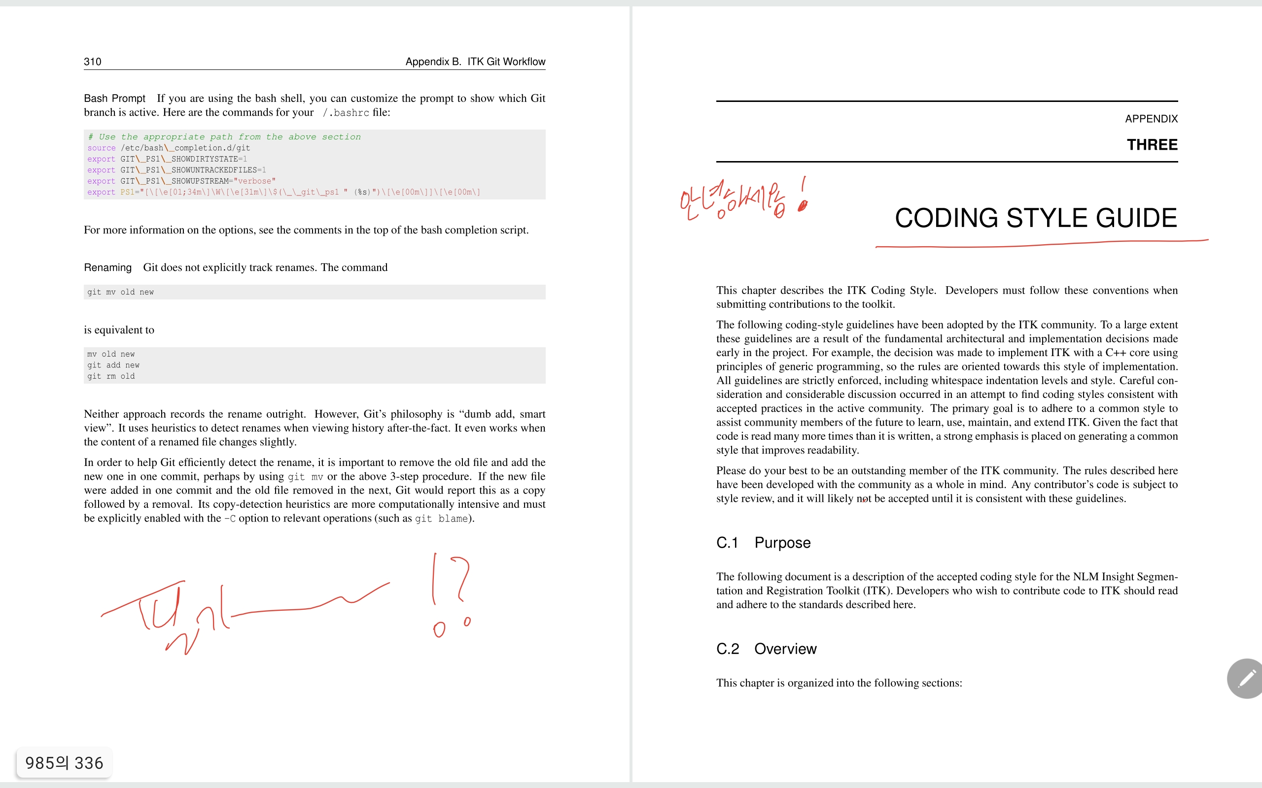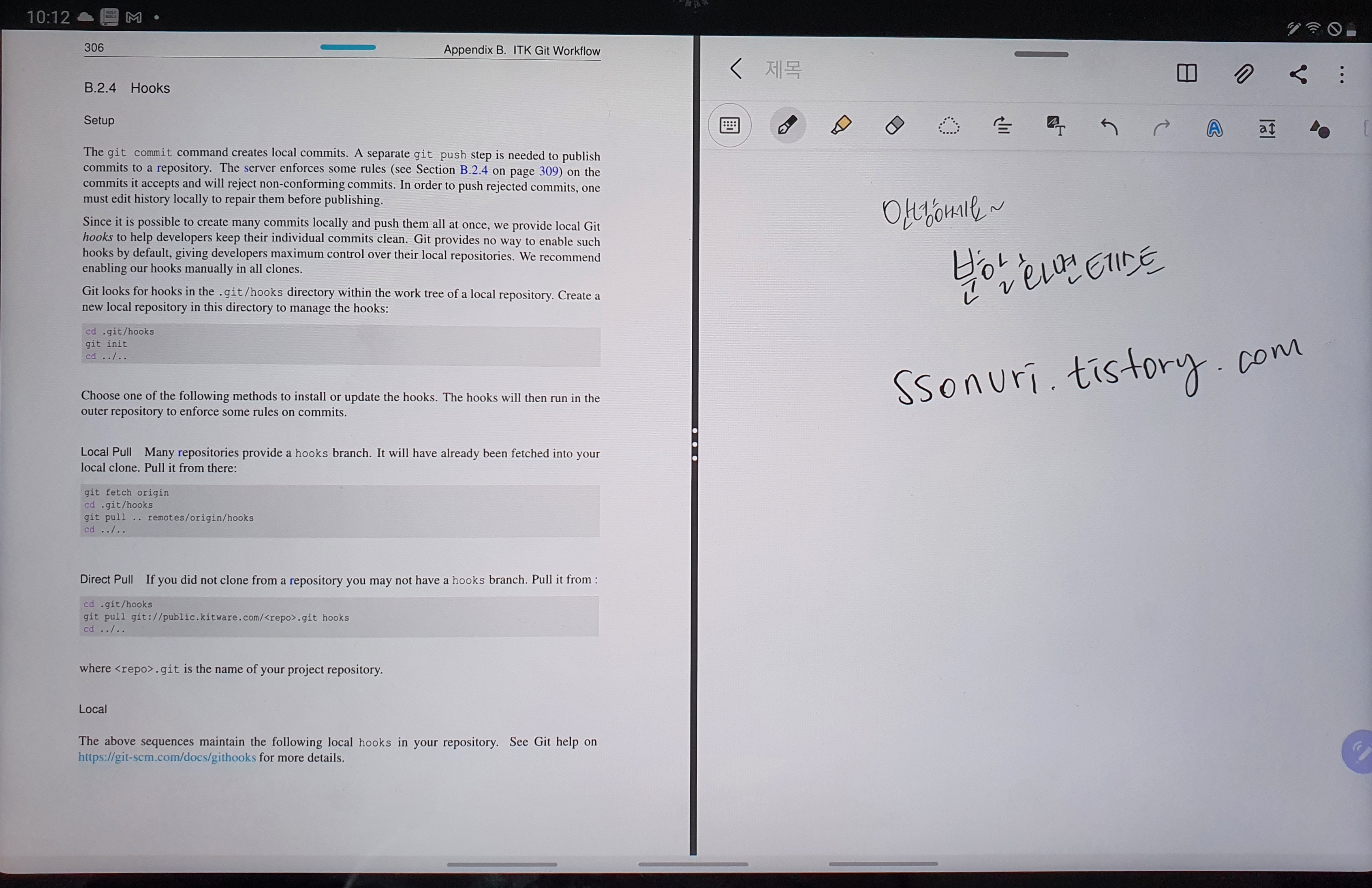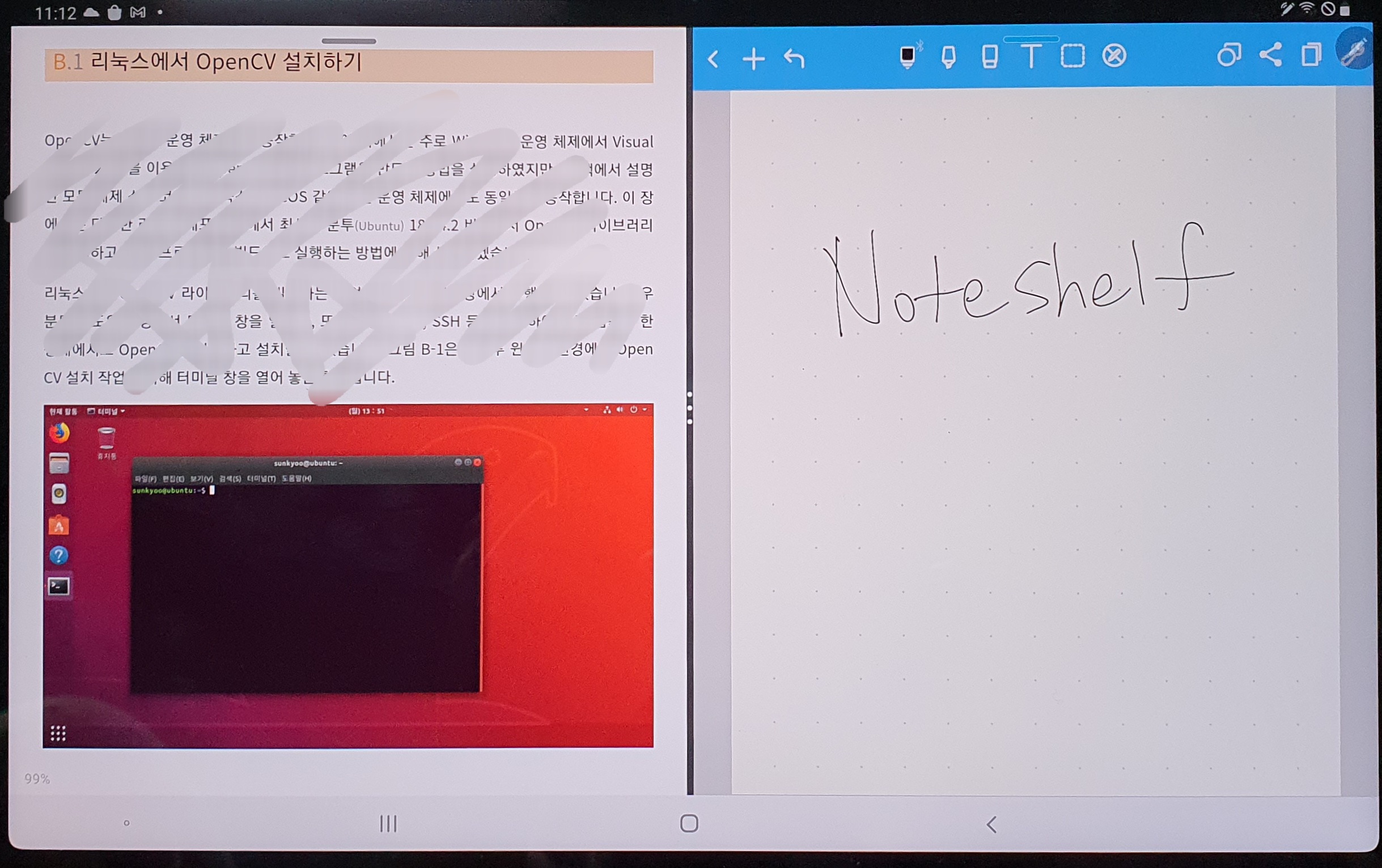 교보문고 e-book 앱을 멀티윈도우로 띄워보았습니다. 화면 왼쪽이 교보문고, 오른쪽이 Noteshelf 앱입니다. 저는 개발 관련 e-book은 교보문고에서 구입하고 있는데요, 태블릿이다 보니 예쁘게 필기하는 용도보다는, 책을 보다가 아이디어가 생각나거나 기억해두어야 할 내용들을 주로 개발새발 적어두는 편입니다.