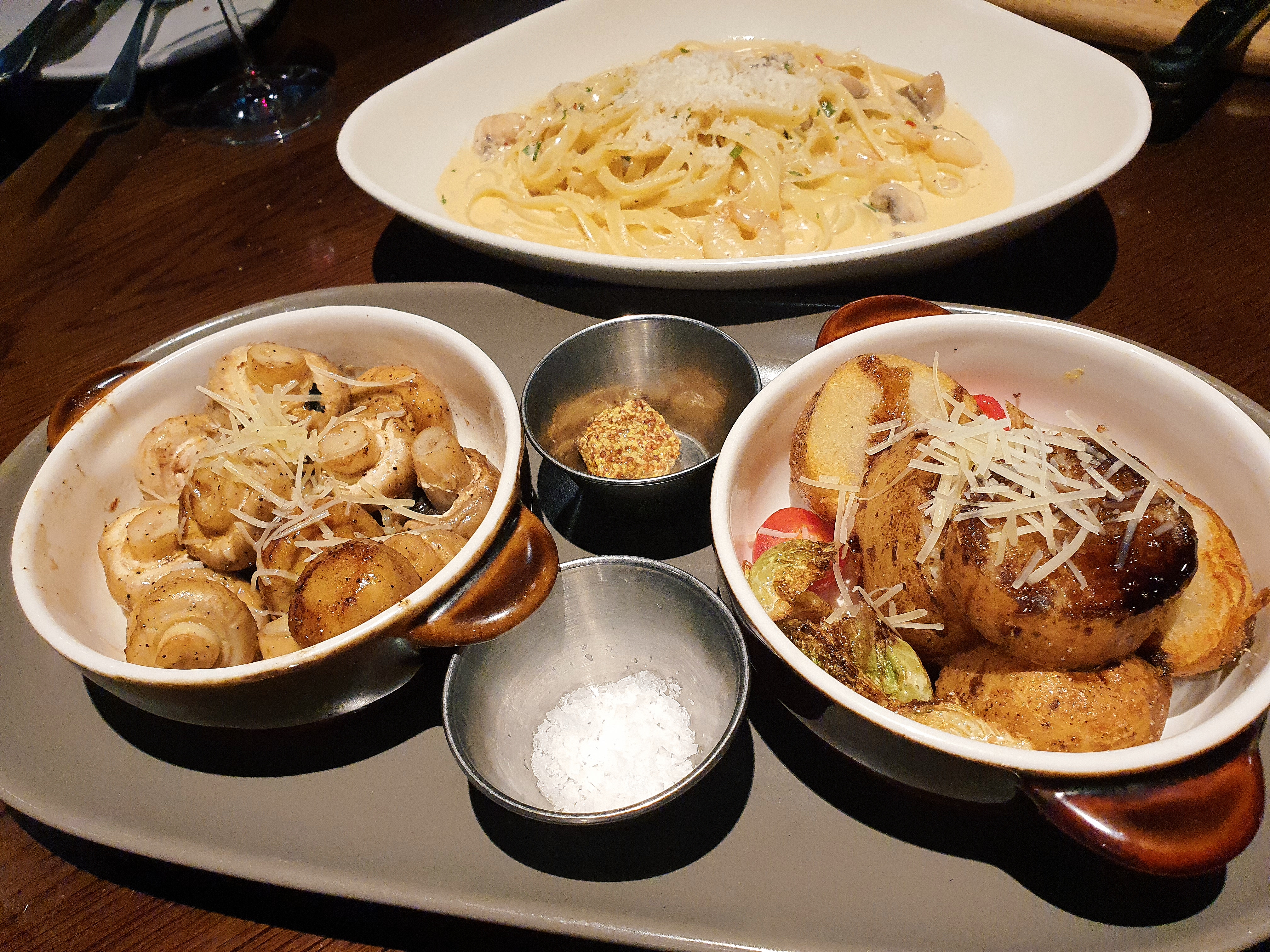 먼저 프리미엄 사이드가 나왔습니다. 큰 그릇에 담겨있는 요리는 그릴드 머쉬룸과 브뤼셀 스프라우트&포테이토입니다. 그리고 고기에 찍어 먹을 소금(말돈솔트)과 홀그레인 머스터드도 함께 나왔습니다.