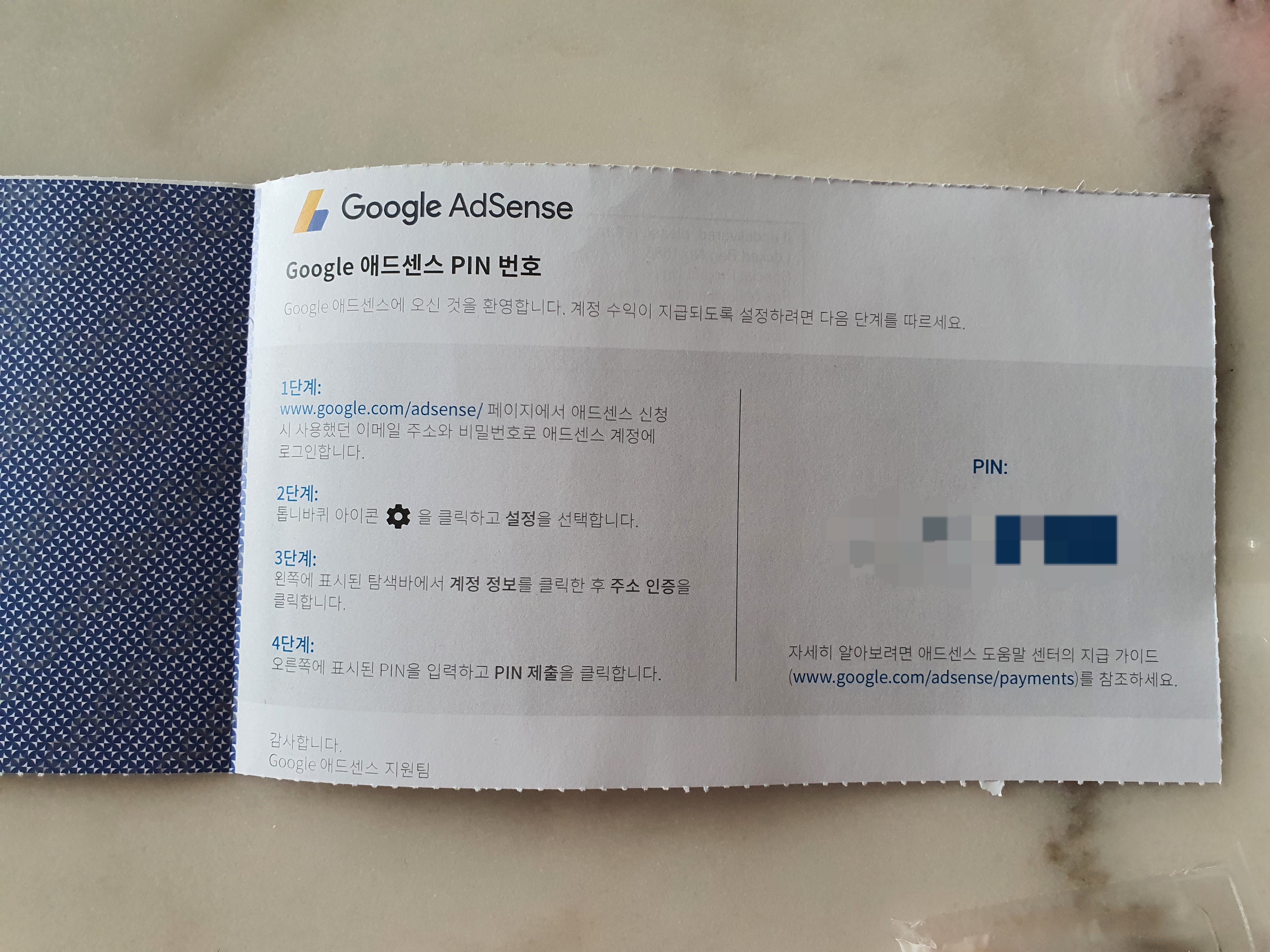 드디어 핀번호가 도착했습니다. 10월 15일 산청했는데 한 달 반이나 걸렸습니다. A5 사이즈의 커다란 흰 종이가 우편함에 꽂혀있길래, 대출 홍보물인 줄 알고 버릴 뻔했어요. 재미있는 건 우리 아파트에 애드센스 핀번호를 받은 사람이 저 말고 또 있었어요!!!. 아무래도 비슷한 주소는 모아 보내는 건 아닌가 하는 합리적(?) 의심이 듭니다.