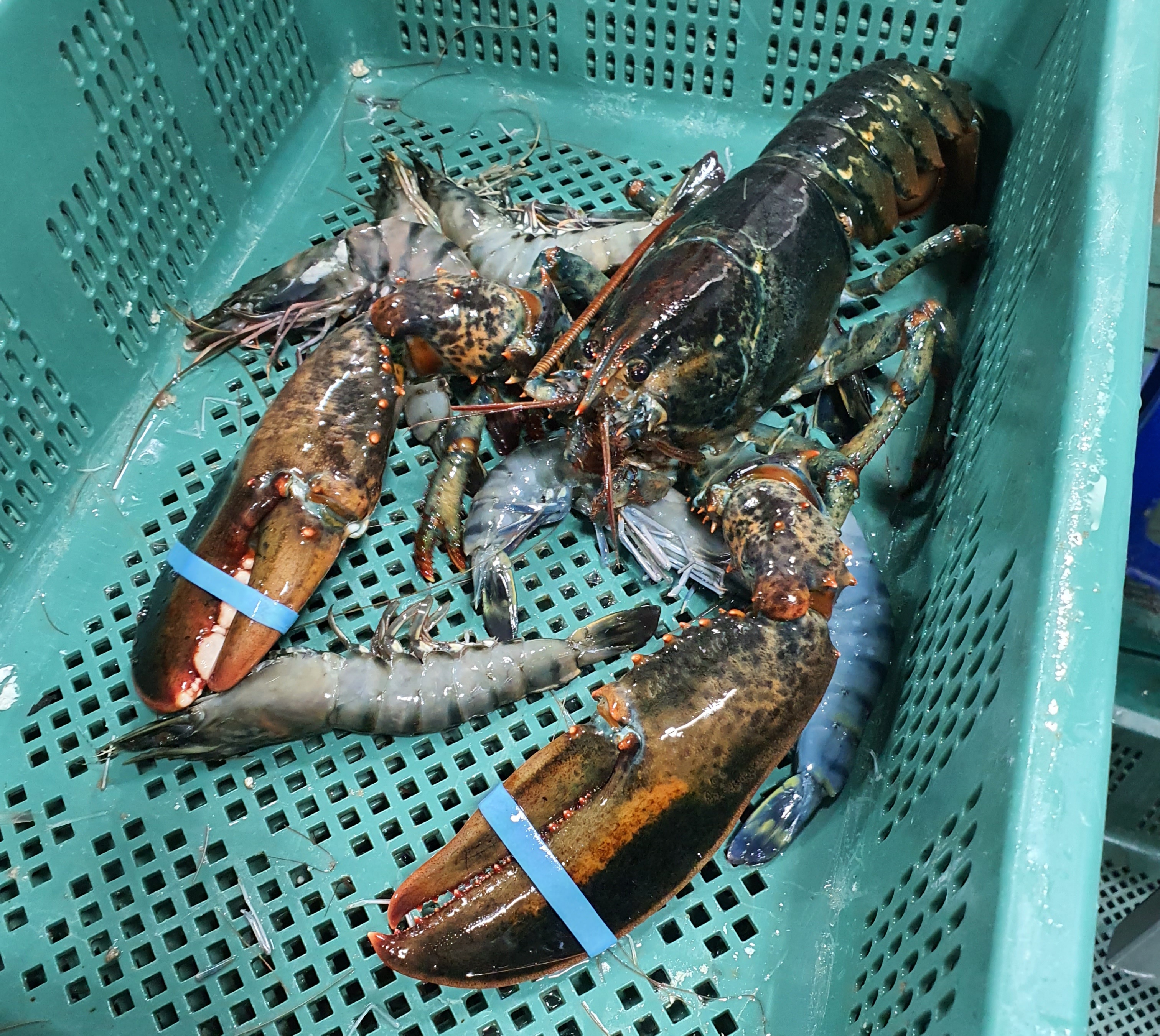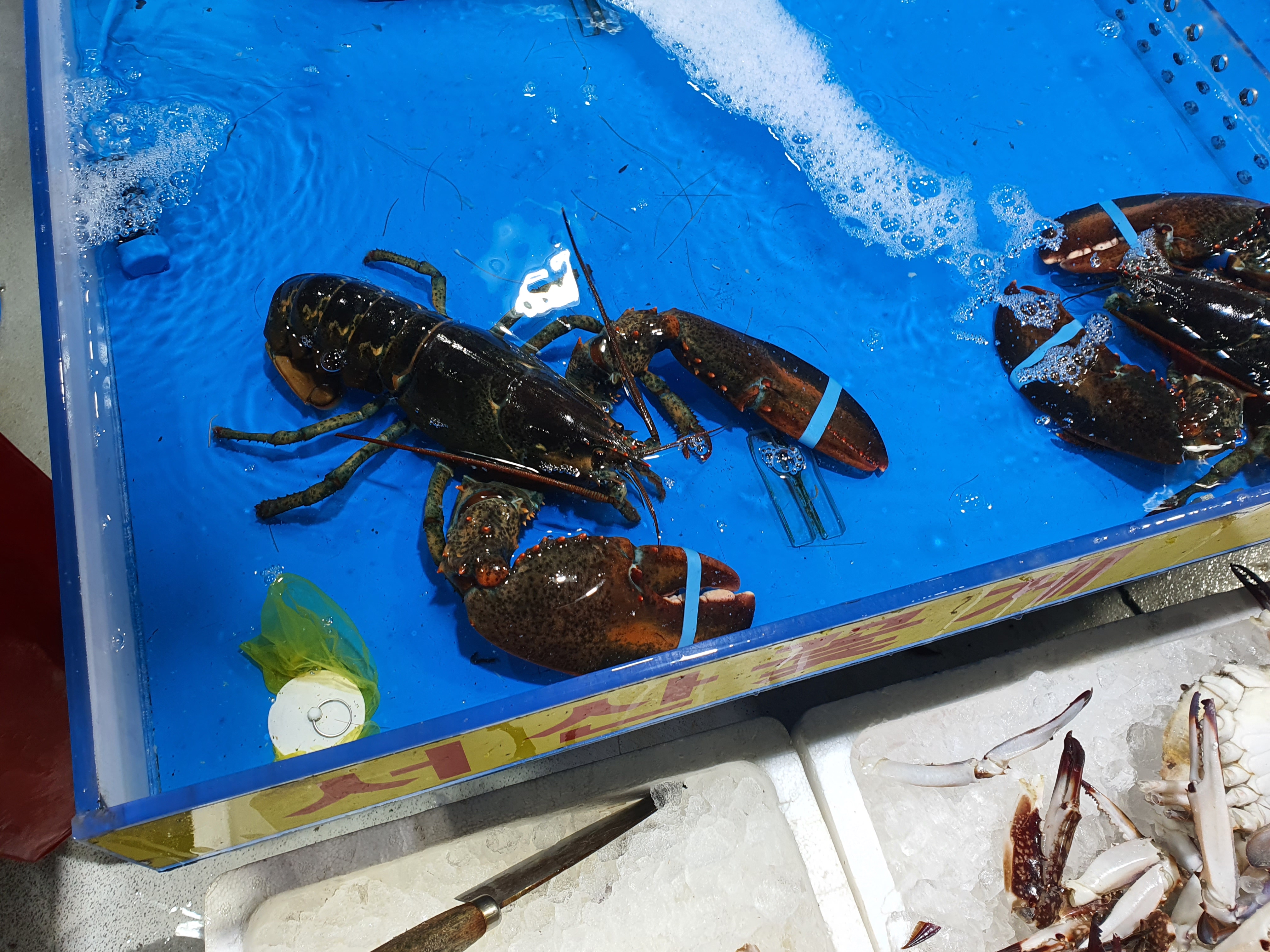 둘이서 먹을 것이라, 랍스터는 약 1.8kg 짜리를 먹을 예정이었습니다. 1.8kg는 아주 푸짐하게 먹을 수 있는 크기는 아니지만 다른 음식들도 있었거든요. 그런데 대부분 2kg를 훌쩍 넘는 큰 랍스터만 팔고 있더라고요. 대도수산에는 아직 작은 랍스터가 남아 있었습니다. 위 사진의 랍스터가 약간 작은 녀석인데요, 저희가 고른 랍스터는 이것보다는 약간 더 큽니다.