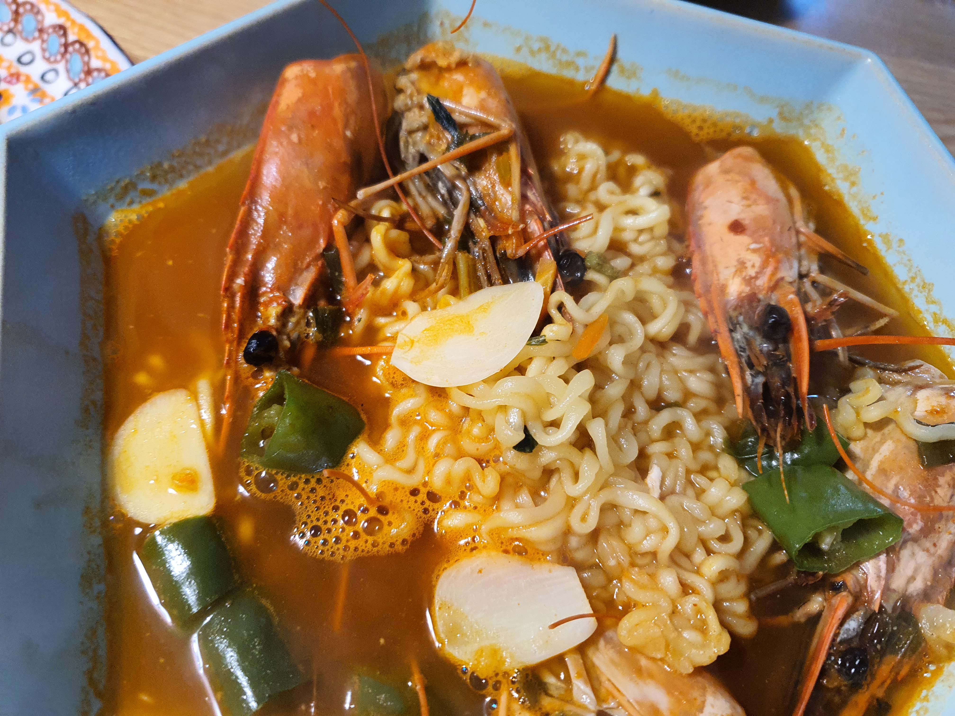 새우 머리는 모아서 푹 끓인 다음, 라면을 끓여먹었지요. 새우맛이 제대로 우러나와서 라면이 진짜 맛있었습니다! 남편이 진정한 새우탕면이라면서 아주 만족스러워했습니다. (라면은 제가 유일하게 자신있는 요리(?)입니다. 흐흐)