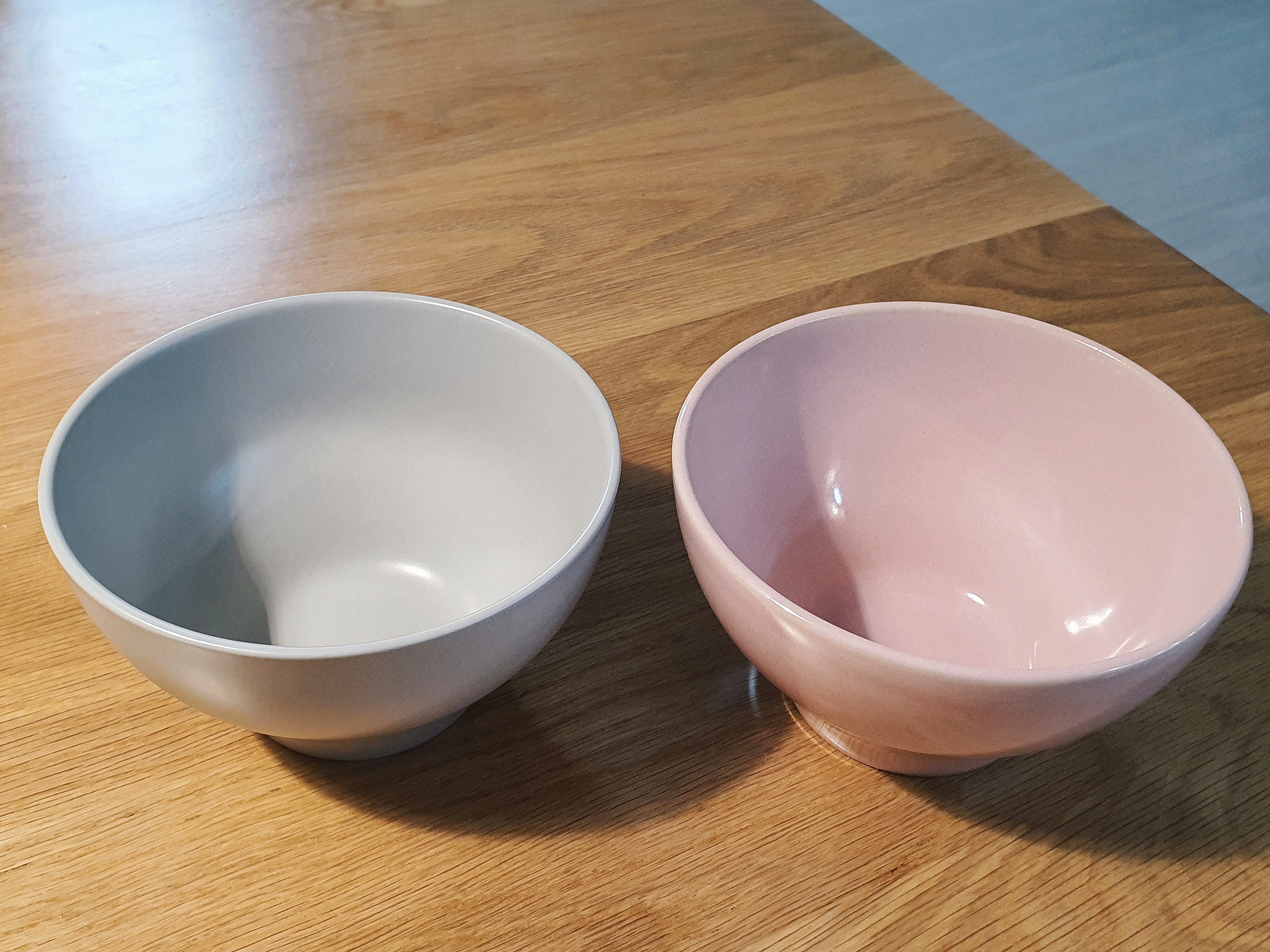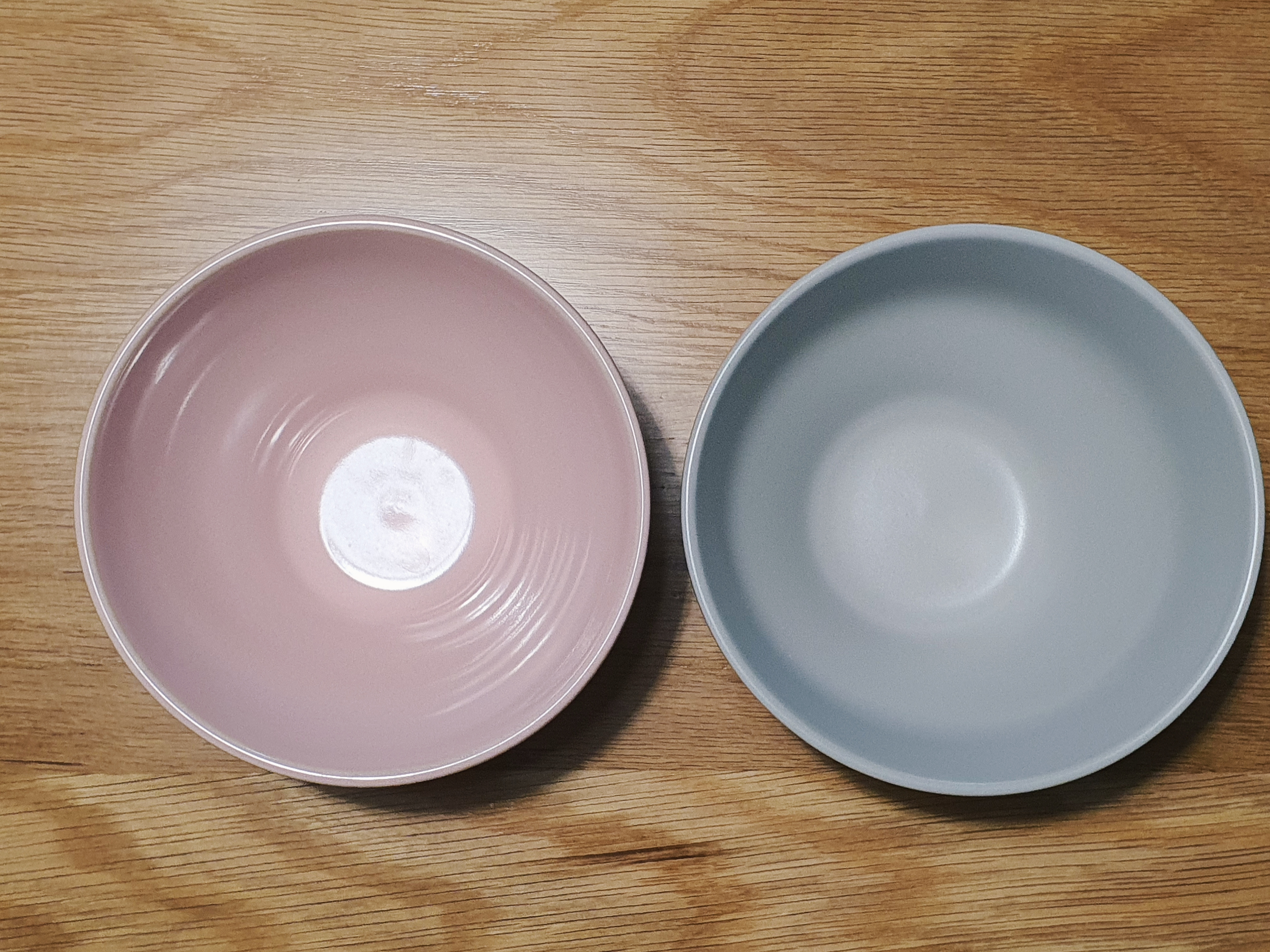 핑크색 그릇은 작년에 구입한 그릇이에요. 비교를 하기 위해 나란히 놓아보았습니다. 재질 상의 차이가 느껴지긴 하지만, 색상이 달라서 그래도 나쁘지는 않아보입니다.