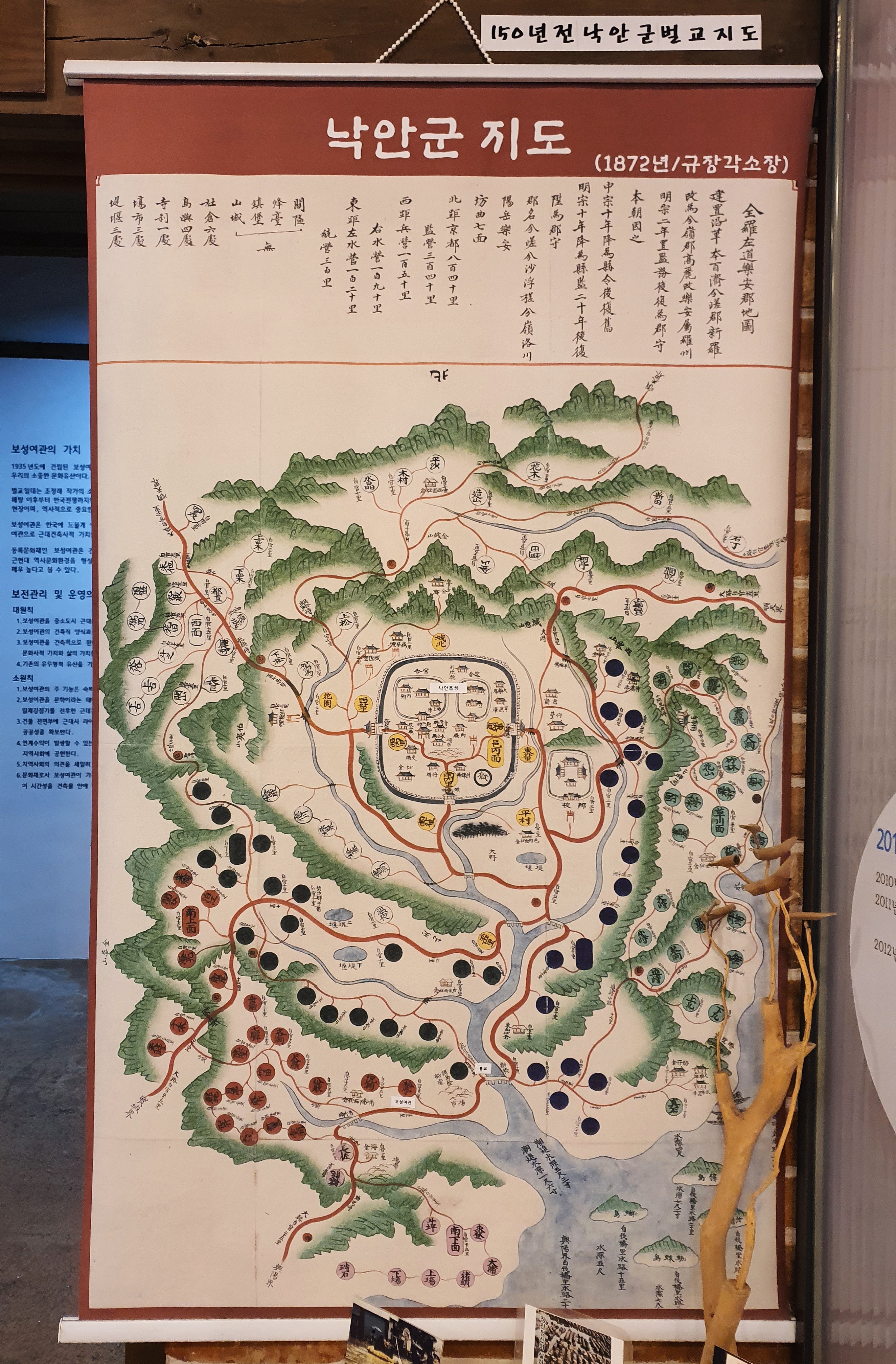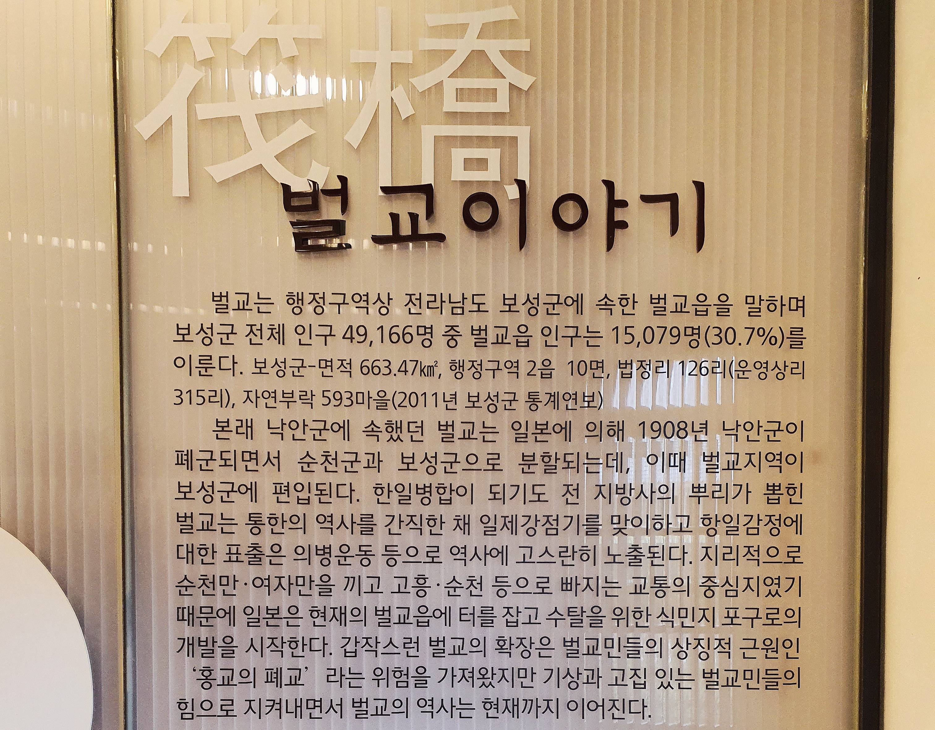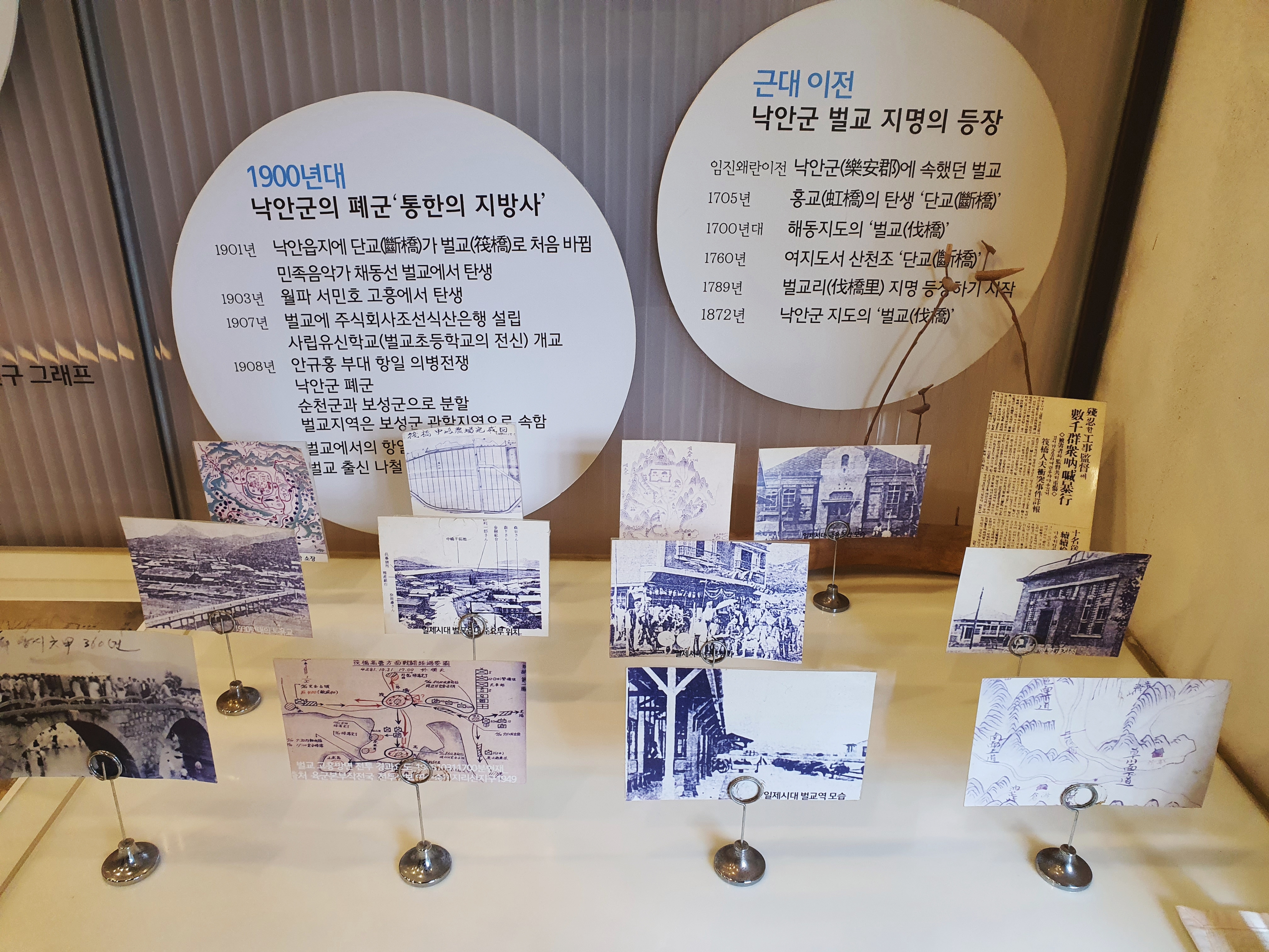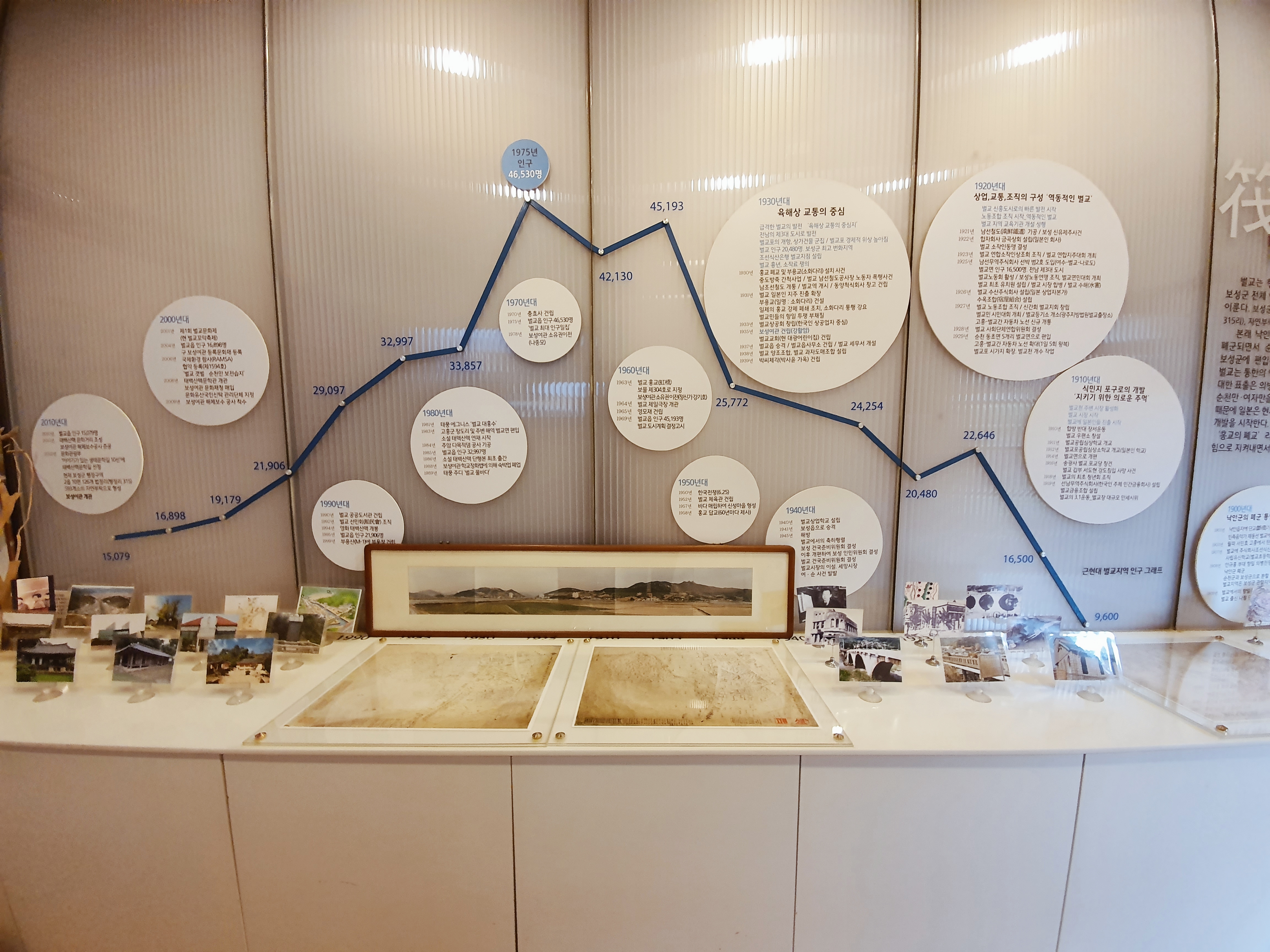 여관에서 좀 더 들어가면 전시실이 나옵니다. 벌교에 대한 이야기, 현재 인구 추이, 일제 수탈의 역사 등이 소개되어 있습니다. 원래 벌교는 낙안군에 속했는데, 일본에 의해 1908년 낙안군이 순천군과 보성군으로 분할 되면서 보성군에 편입되었다고 합니다. 그리고 벌교가 지리적으로 교통의 중심지였기 때문에, 수탈을 위한 식민지 포구로 개발되었다고 합니다. 그러면서 보성군 최고의 번화지역이 되고, 인구도 점점 늘어나서 1975년에는 46,000명이 되는데요, 그 이후 다시 인구감소세로 돌아서서 현재는 15,000여명 정도 되는 것 같습니다.