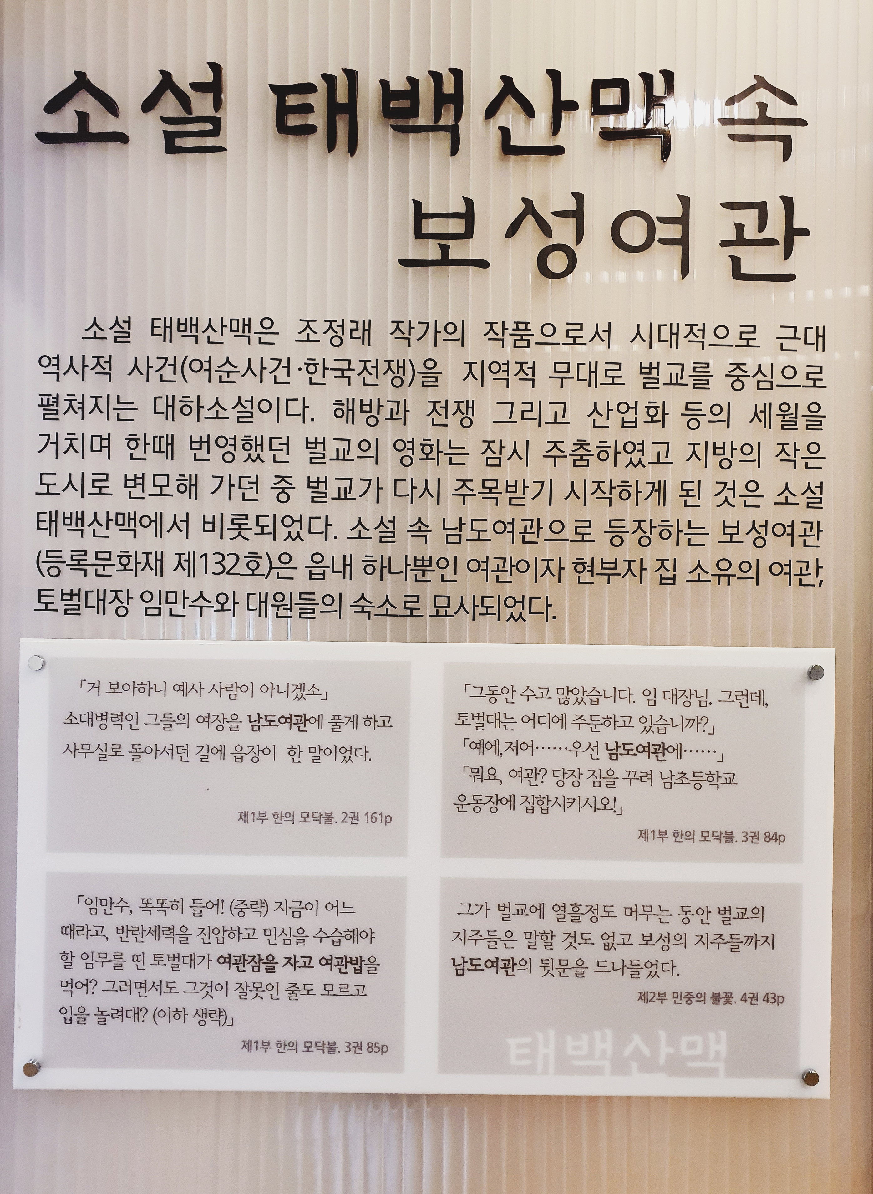 태백산맥을 읽어보지 않았어도, 책의 존재를 모르는 사람은 아마 없을 것 같아요. 저도 사실 태백산맥을 읽어보진 않았습니다. 보성여관은 소설에서 남도여관이라는 이름으로 등장한다고 합니다.
