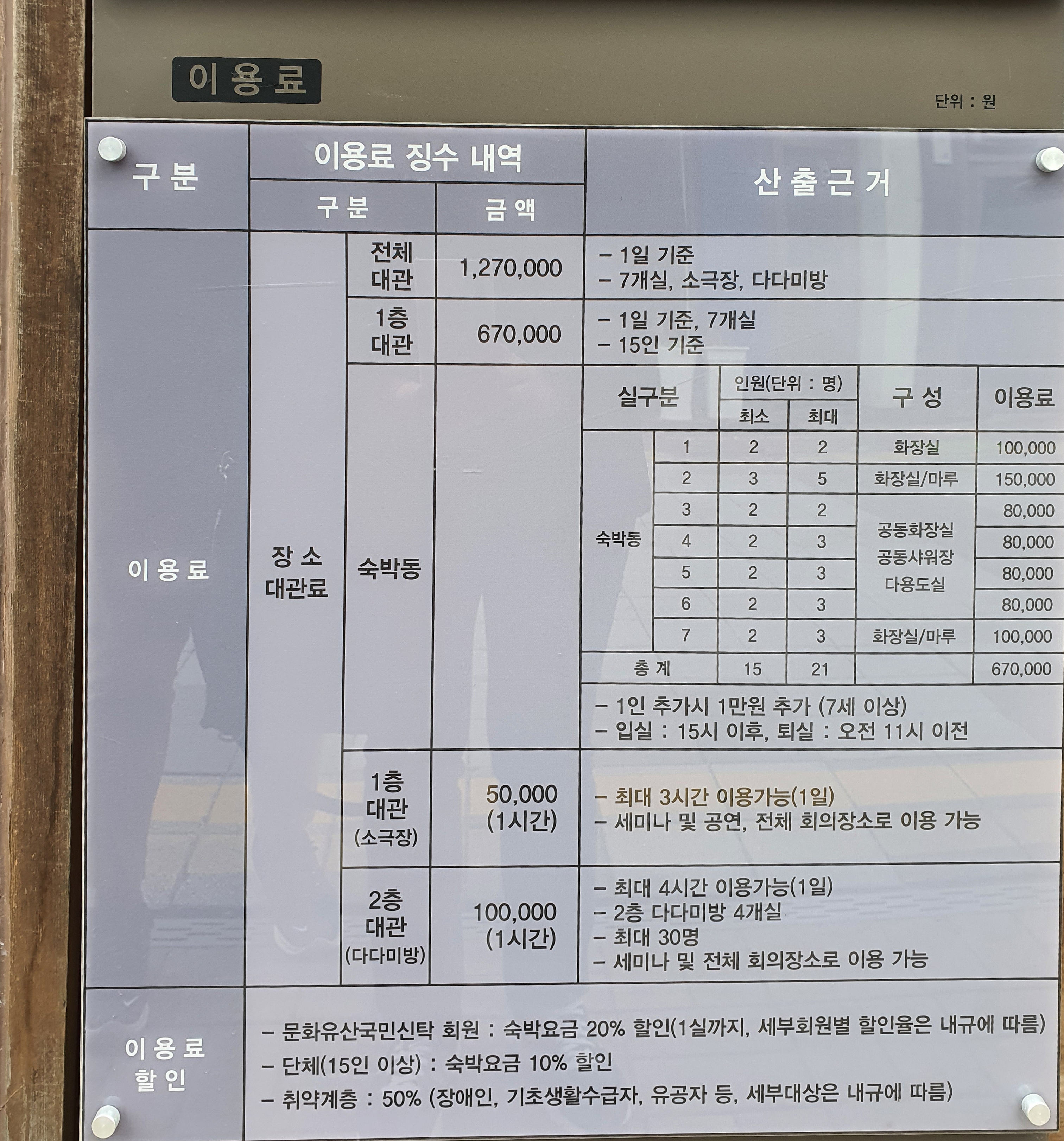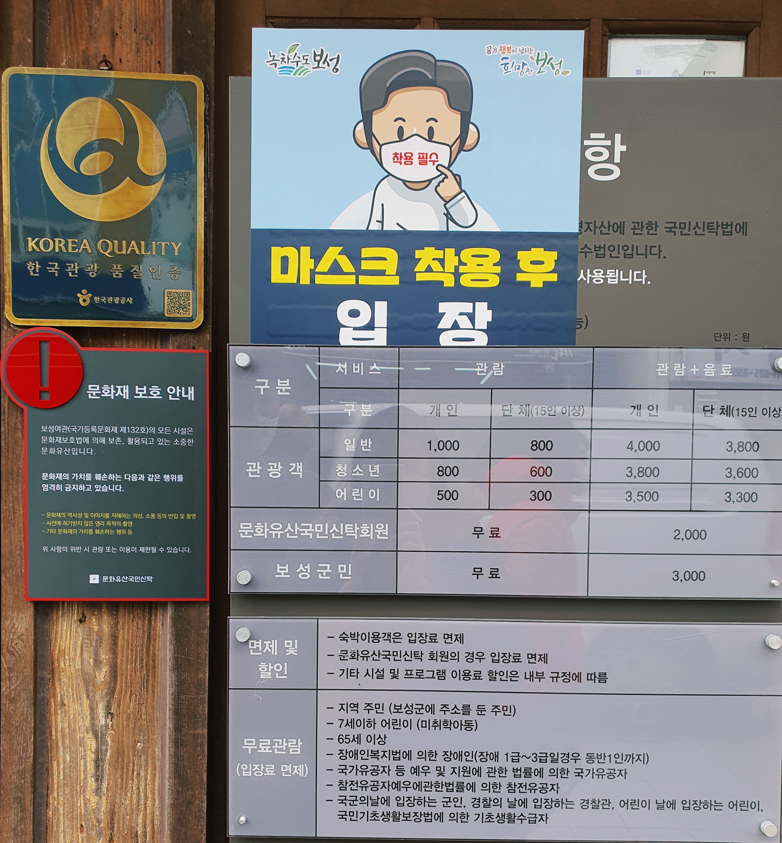 보성여관은 문화재이기 때문에, 문화재보호법에 의해 보존 및 활용되고 있는 문화유산입니다. 보성여관은 입장료를 받고 있는데요, 일반 1,000원 / 청소년 800원 / 어린이 500원이고, 음료를 먹을 경우 여기에 3,000원이 추가됩니다. 할인이나 면제 대상 확인은 위 이미지를 확인해 주시기 바랍니다 :)