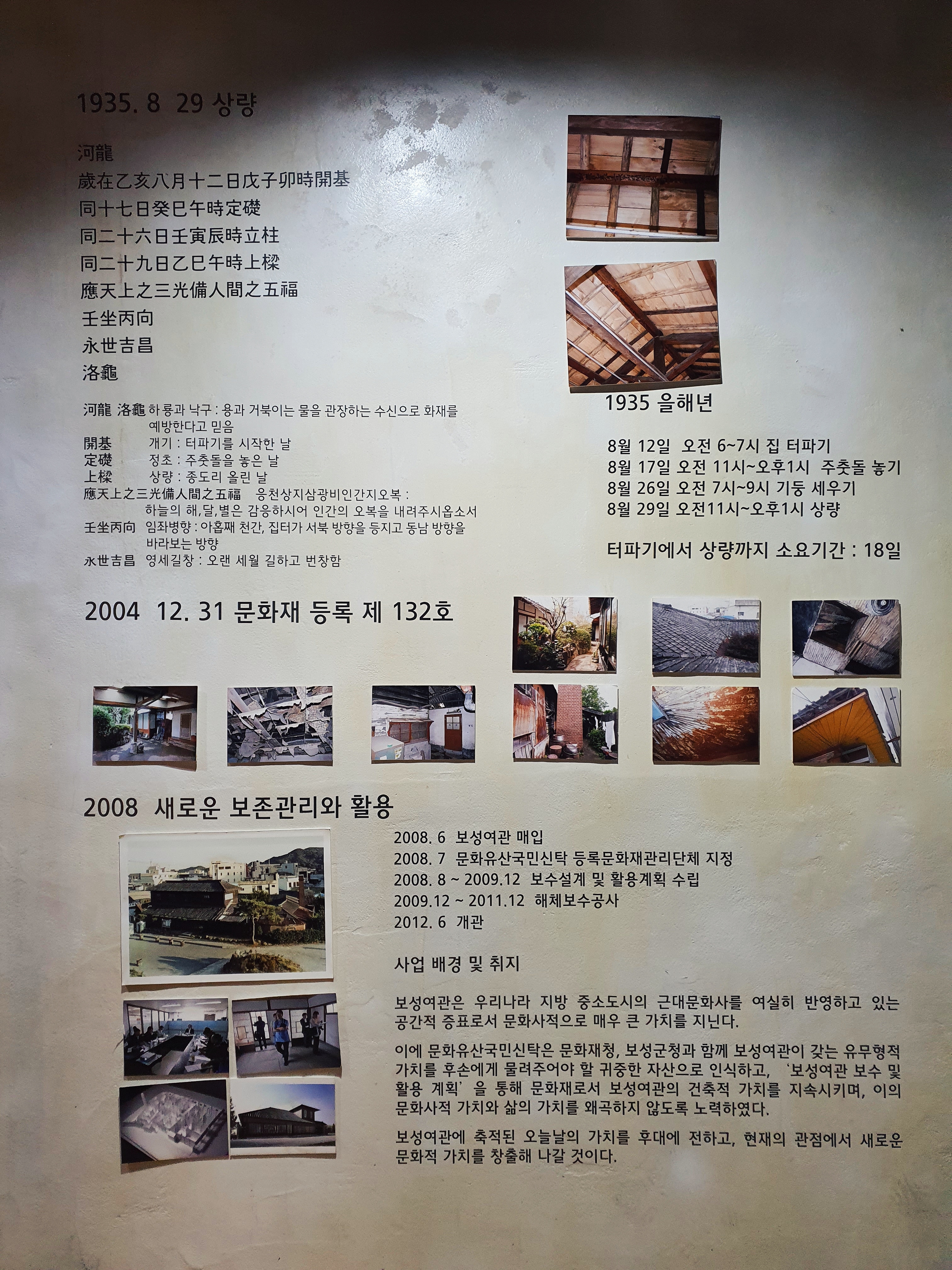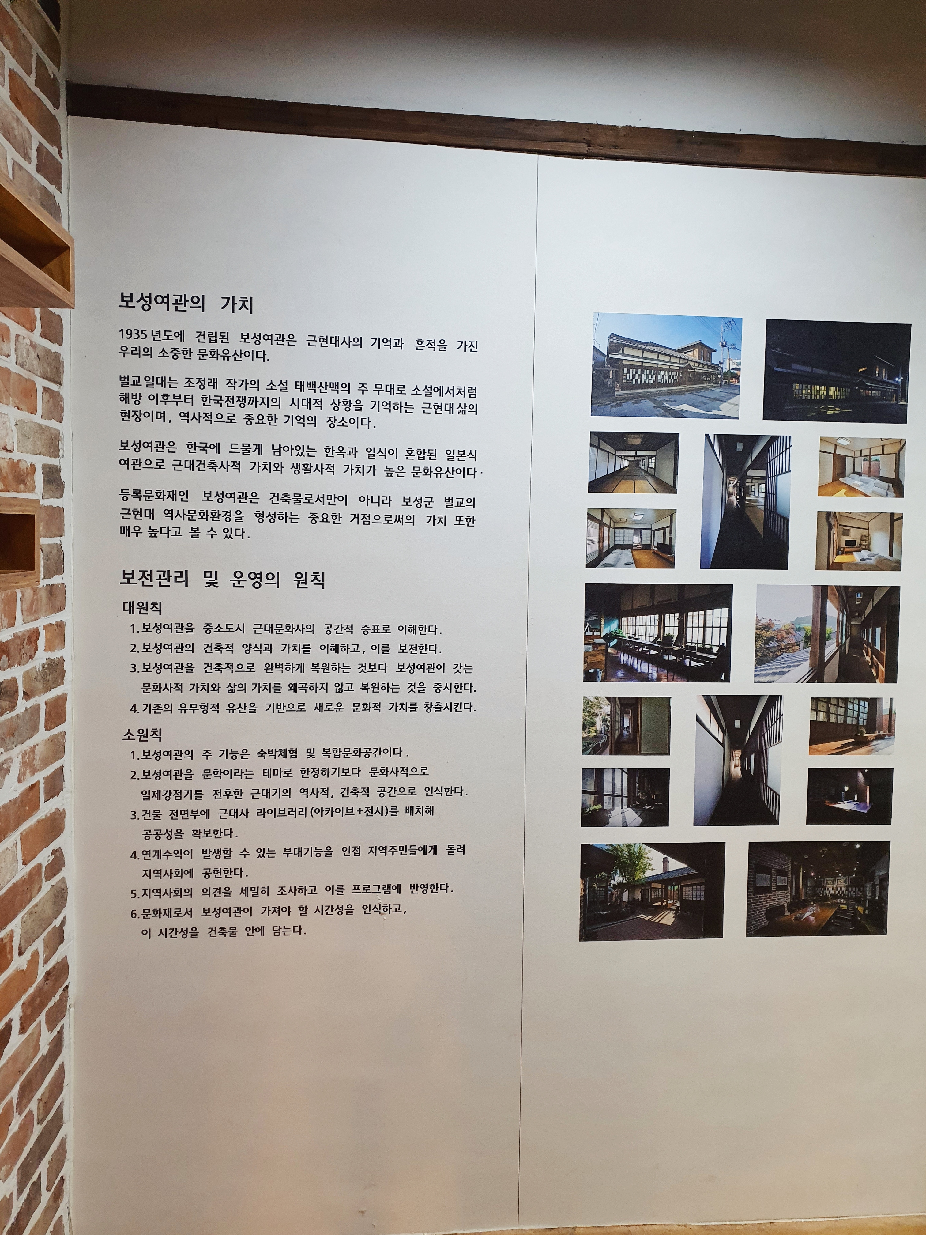 보성여관에 대한 소개와 운영 원칙이 쓰여 있습니다. 보성여관은 1935년에 지어졌으며, 한옥과 일식이 혼합된 근대건축물이자 적산가옥입니다. 뼈아픈 일제강점기 역사를 기억하게 하는 건축물이기에, 잘 운영되고 보존되었으면 합니다.