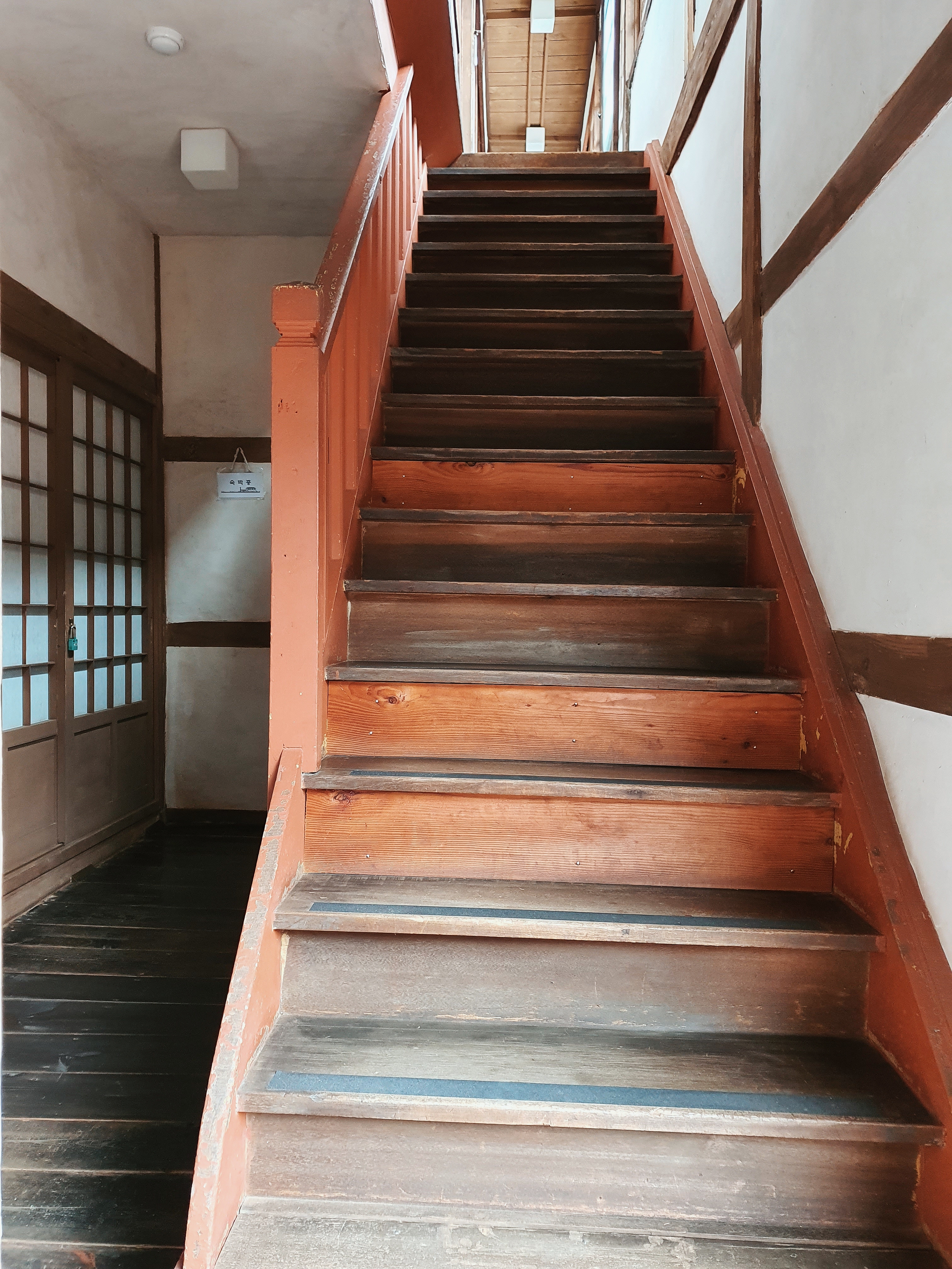 2층으로 올라가 보았습니다. 나무 계단에서 삐걱 소리가 조금 나길래, 살금살금 올라갔습니다. 2층 다다미 방은 최대 30명까지 수용할 수 있다고 해요. 2층으로 올라가면서 눈에 들어오는 복도의 모습은 뭐랄까... 어떤 오래된 영화의 미장센을 보는 듯 했습니다. 설명할 수 없는 묘한 느낌이 들었습니다.