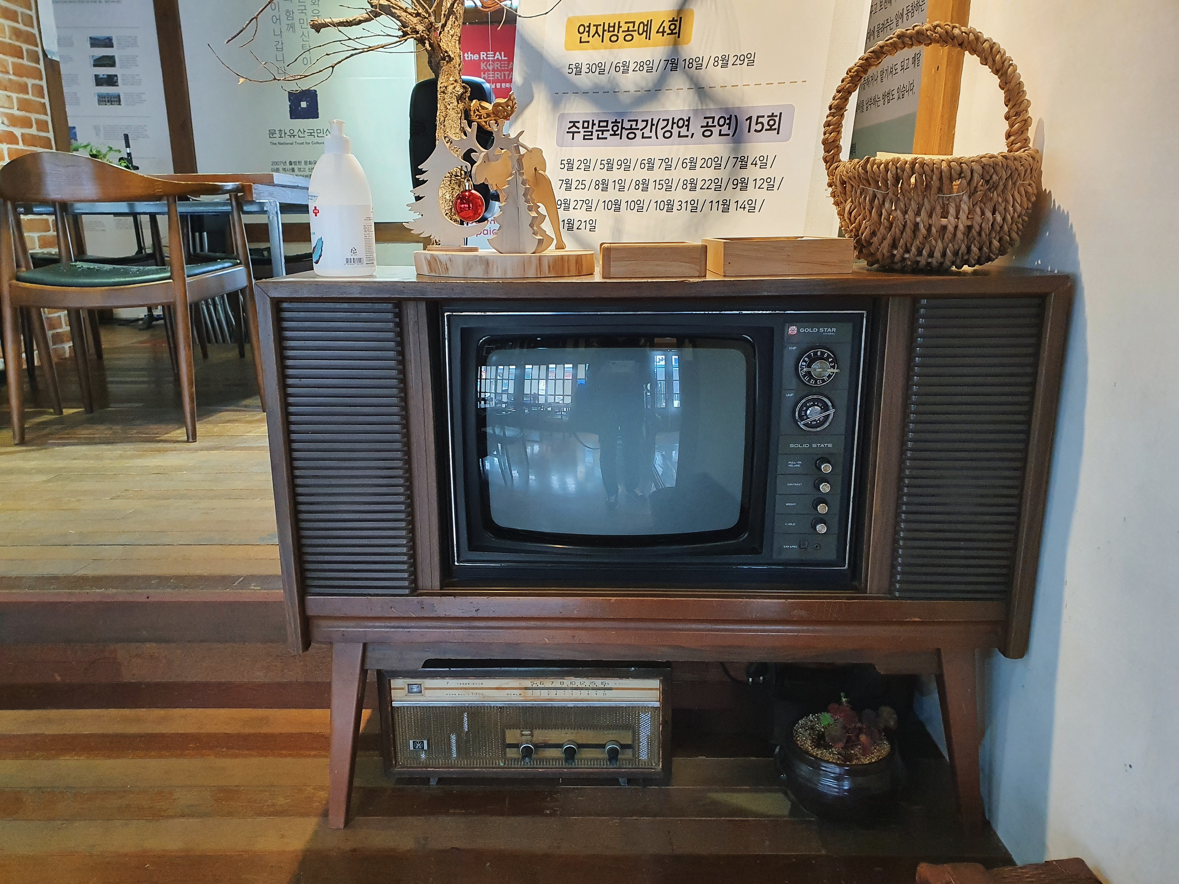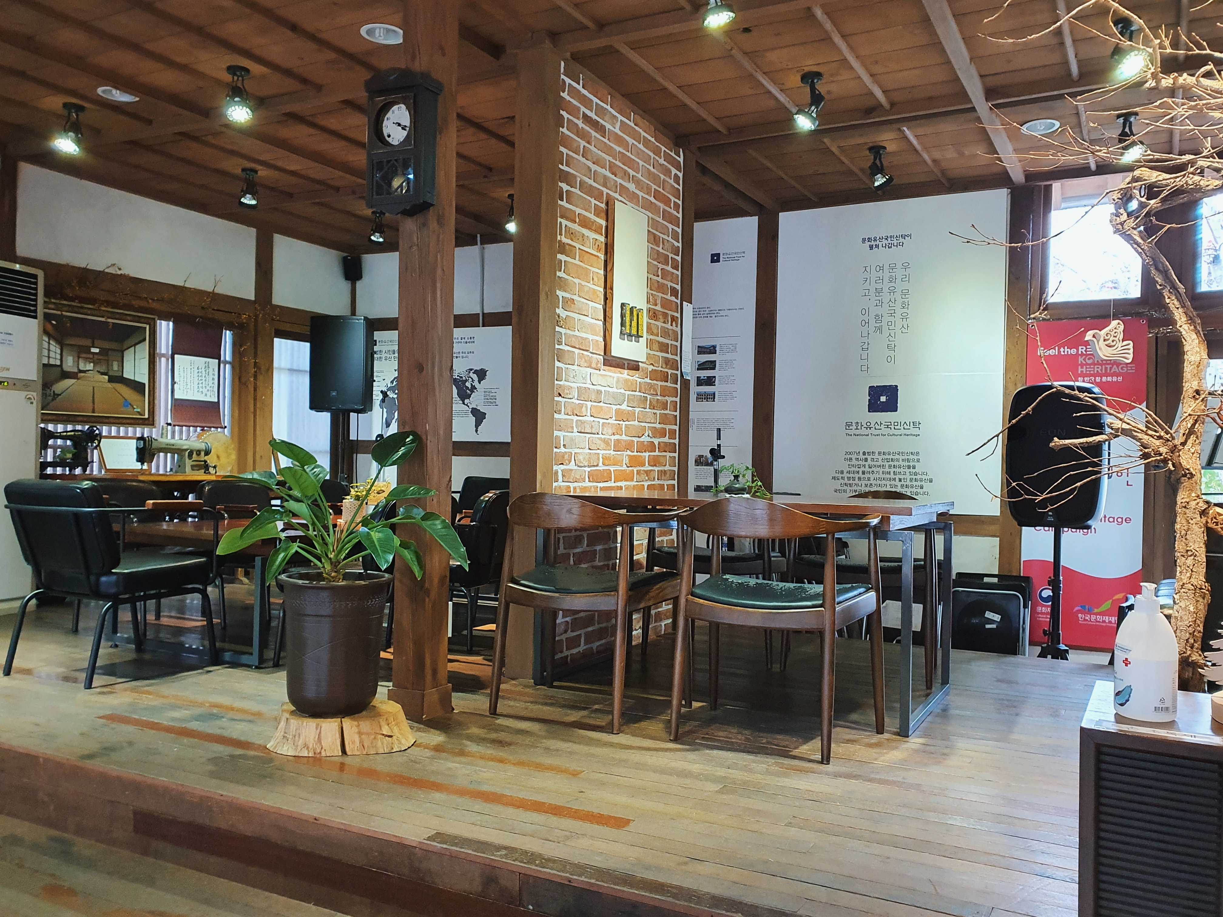 사무실 반대편에는 빈티지스럽게 꾸며진 넓은 공간이 있었습니다. 공연이나 문화 프로그램이 있을 때는 소극장으로 꾸며지고, 평소에는 카페 좌석으로 운영되는 것 같습니다.
