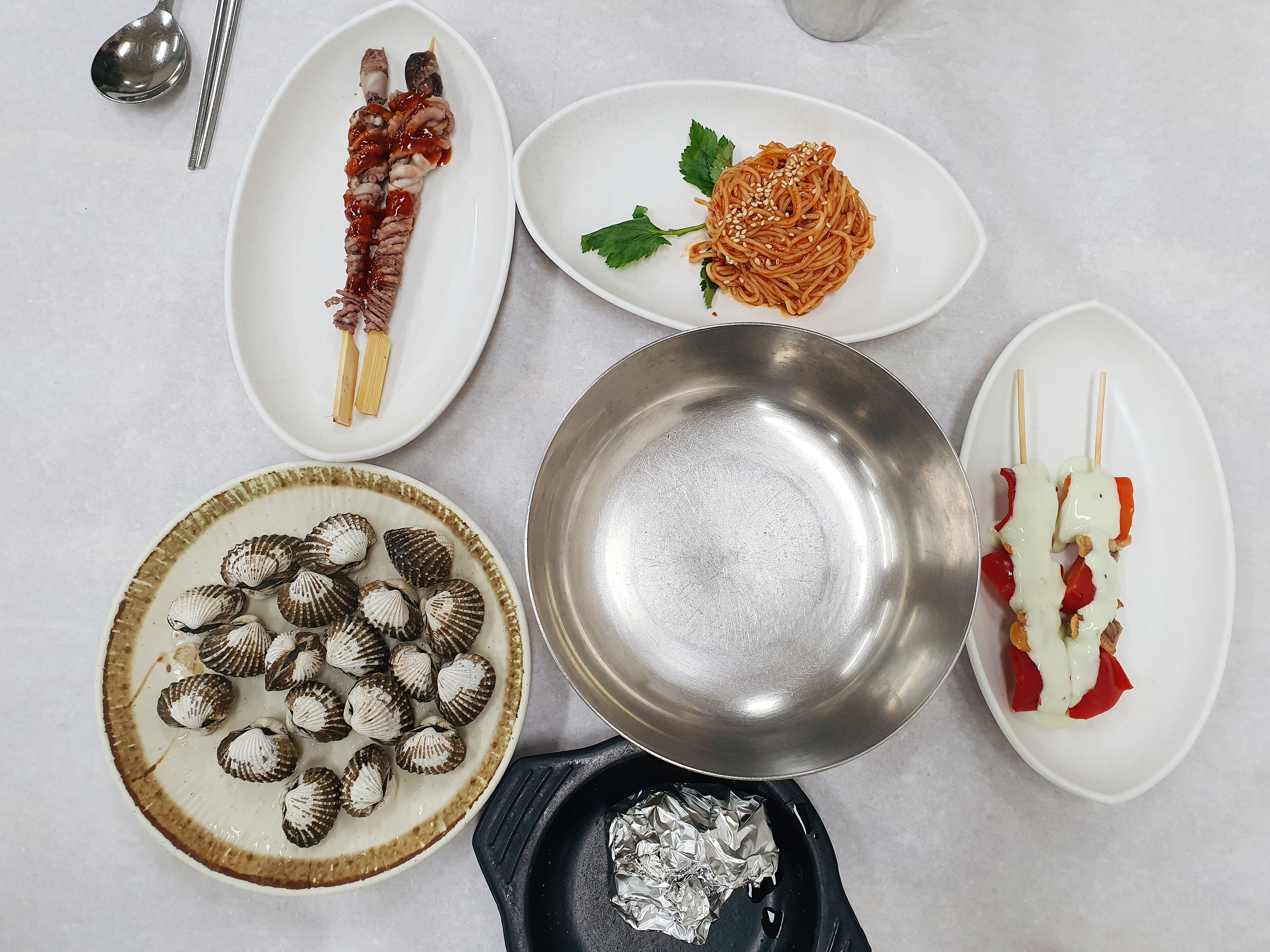 드디어 정식 메뉴가 하나씩 도착했습니다. 먼저 참꼬막찜과 꼬막 구이, 낙지호롱구이, 꼬막 꼬치와 쫄면이 나왔습니다.