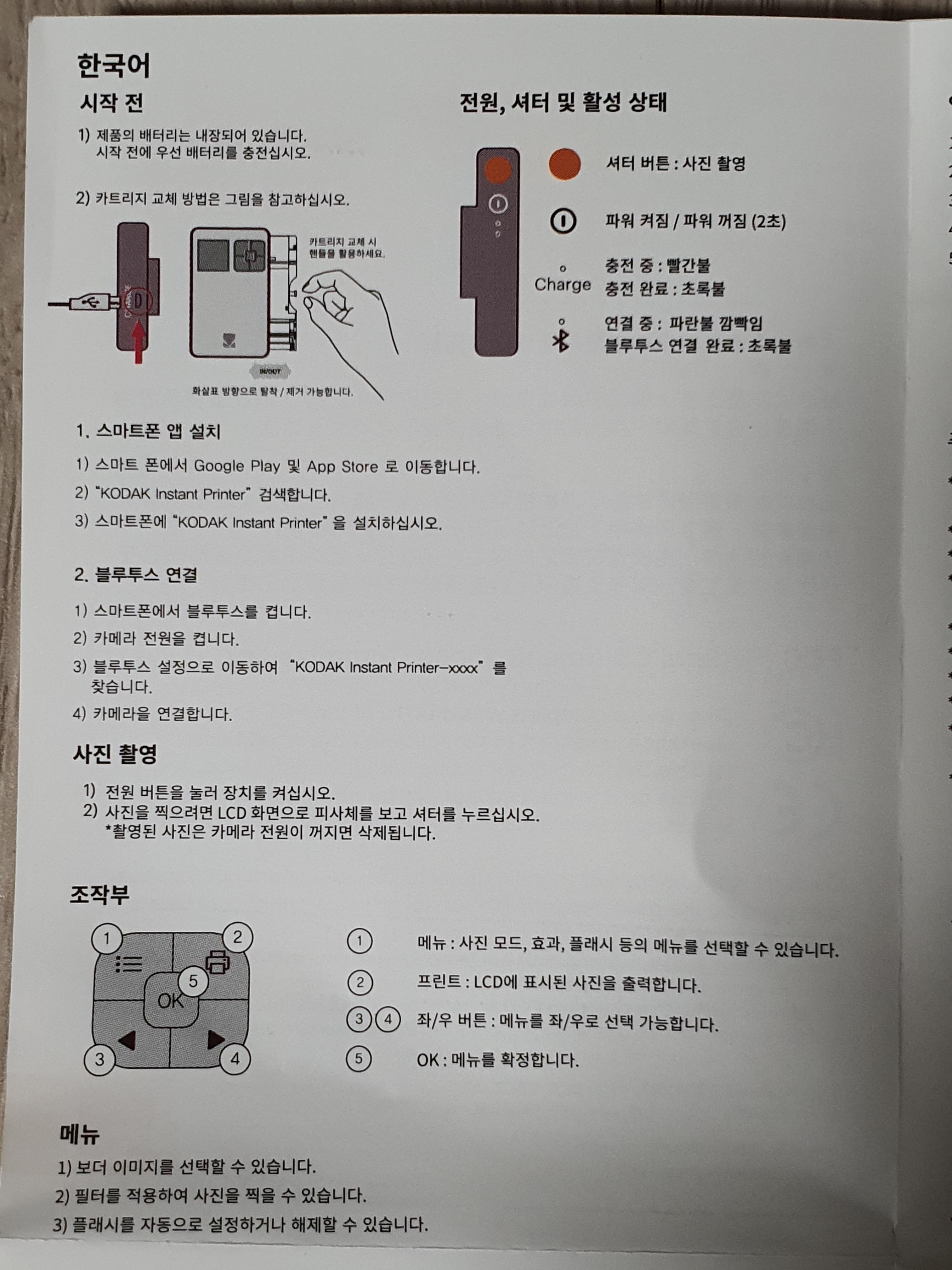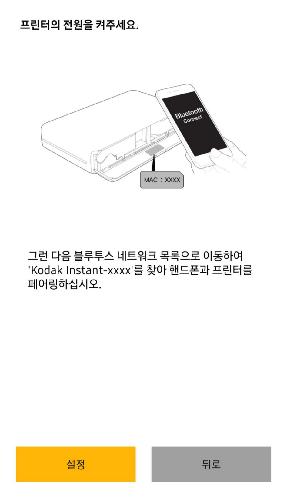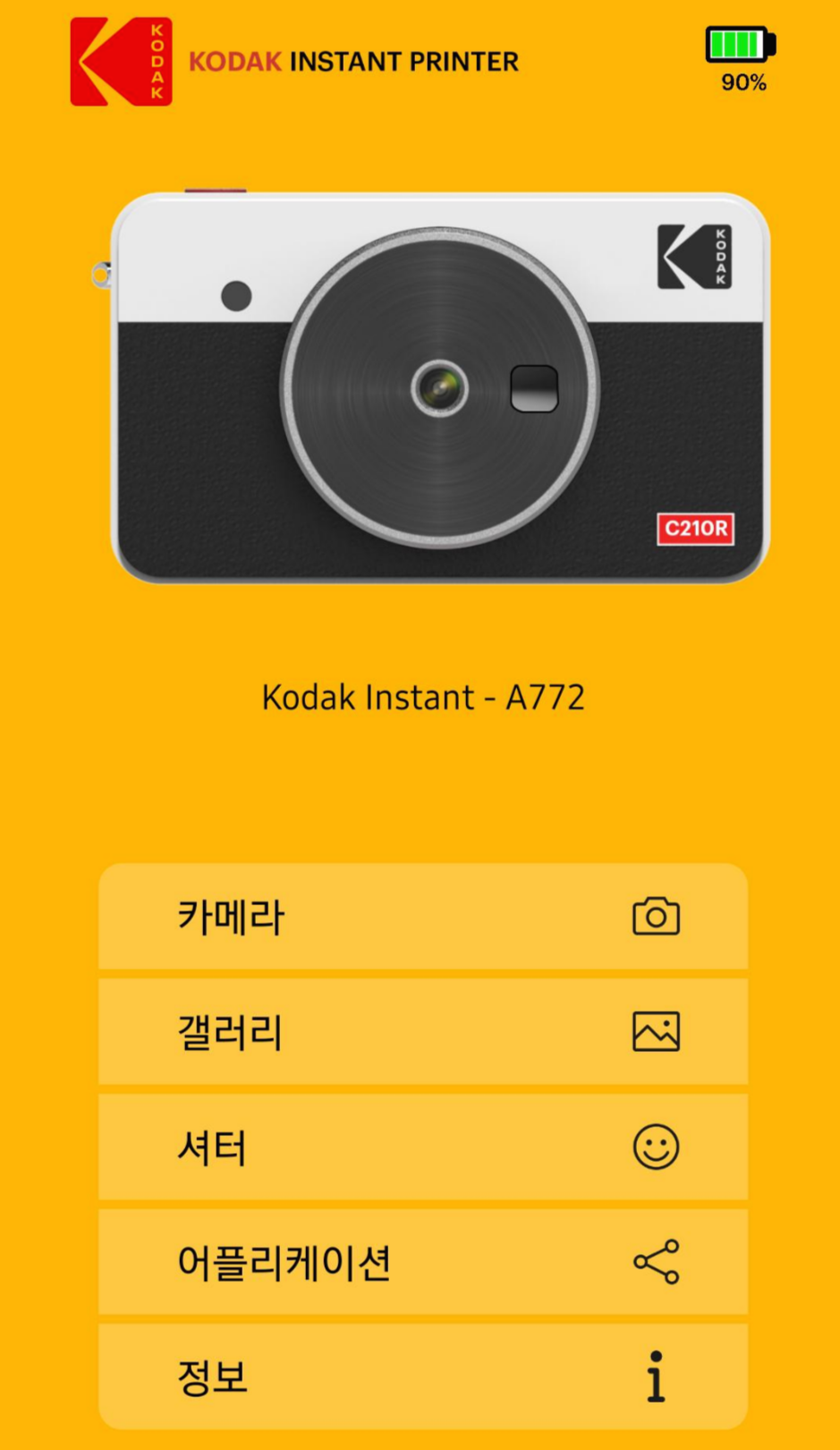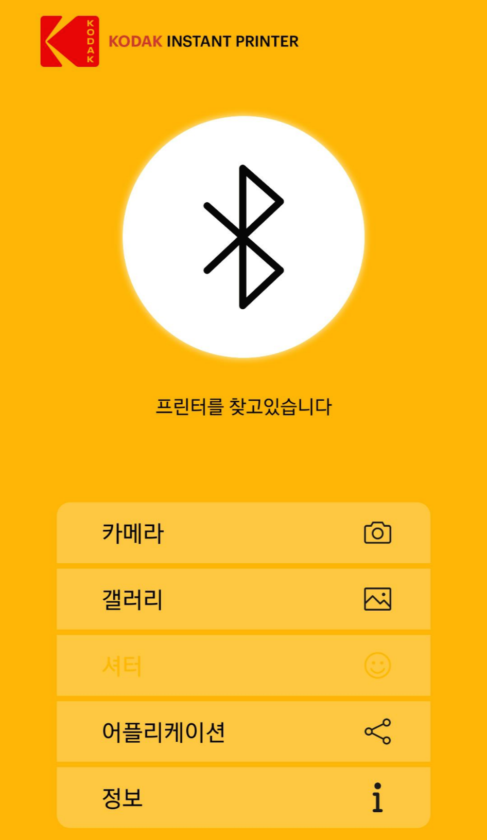 블루투스 설정에 들어가서 Kodak Instant-xxxx를 찾아 휴대폰과 카메라를 페어링합니다. 연결이 완료되면 오른쪽 사진처럼 카메라가 앱 메인화면에 뜹니다. 휴대폰 사진을 프린트하려면 갤러리를 선택하시면 됩니다.
