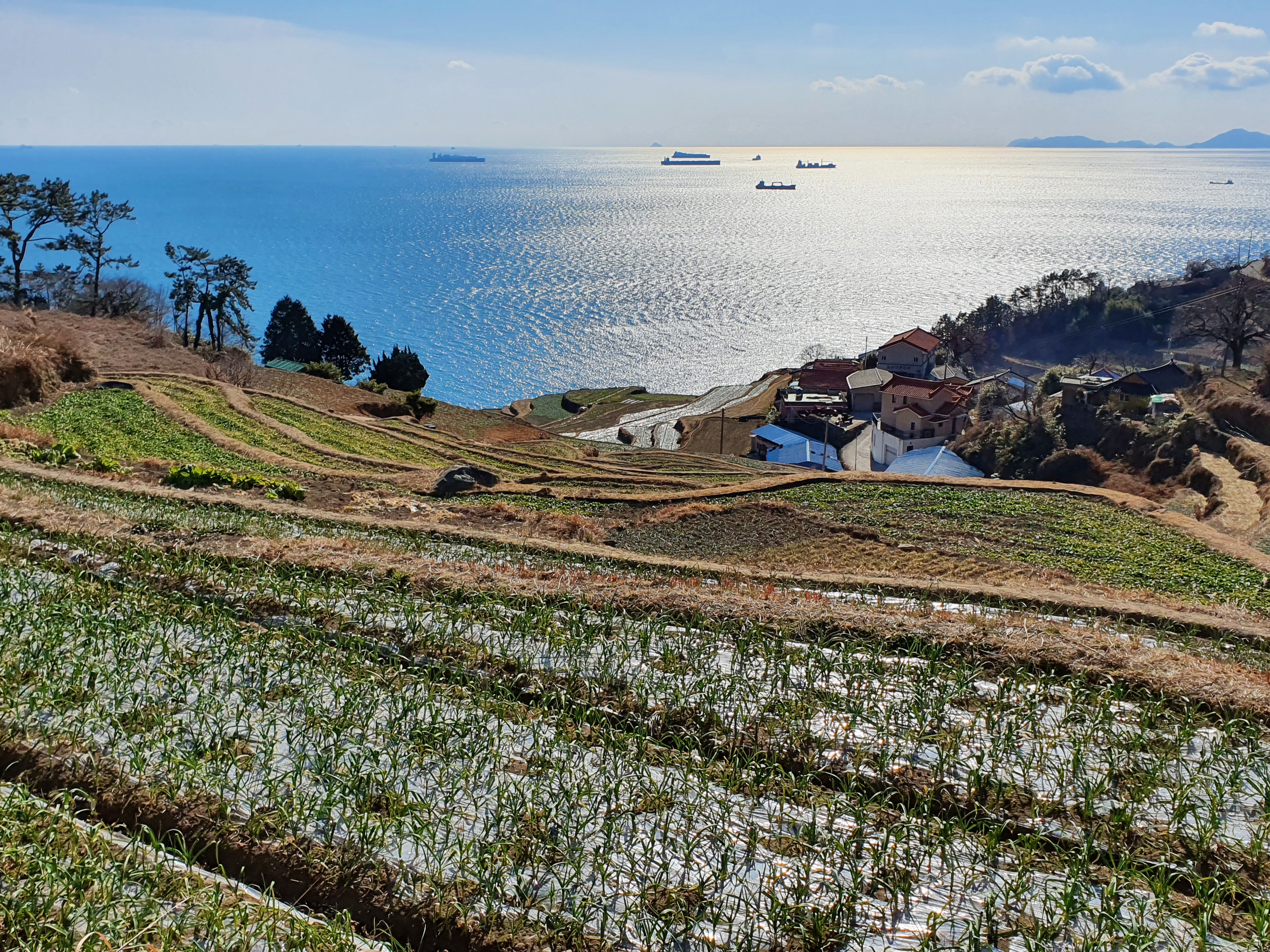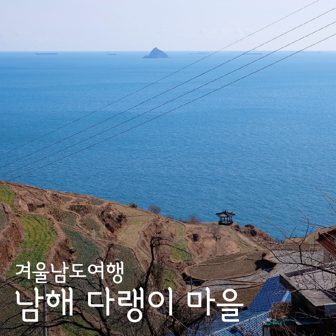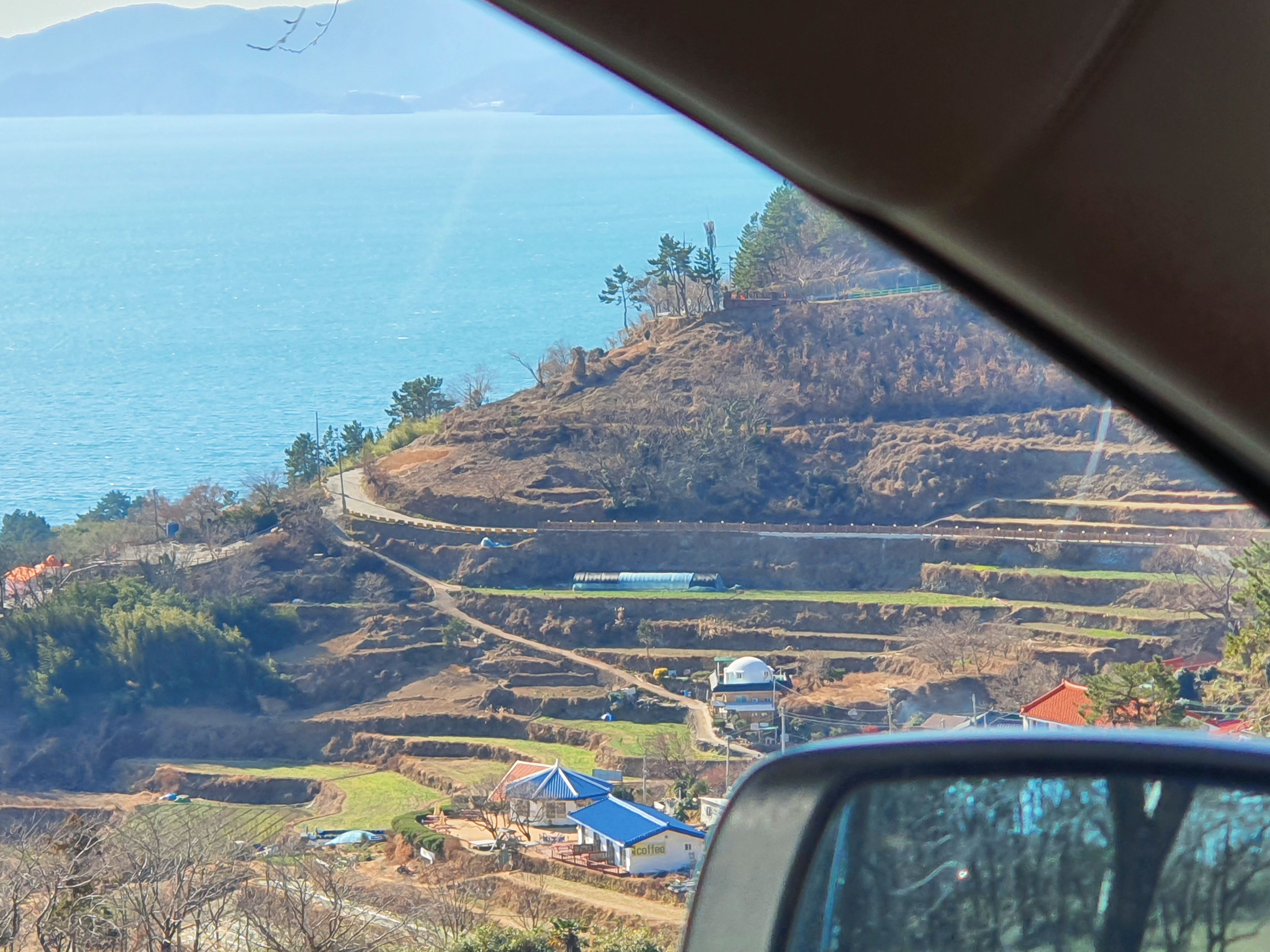 처음 가본 남해군은 바다와 산세의 풍경이 굉장히 잘 어울리는 매력적인 곳이었습니다. 특히 다랭이마을로 가는 길은 해안선을 따라 이어져 있어서 정말로 예뻤어요. 바다 색깔도 정말 예쁘고, 따뜻한 지역이라 겨울답지 않게 푸릇푸릇했습니다.