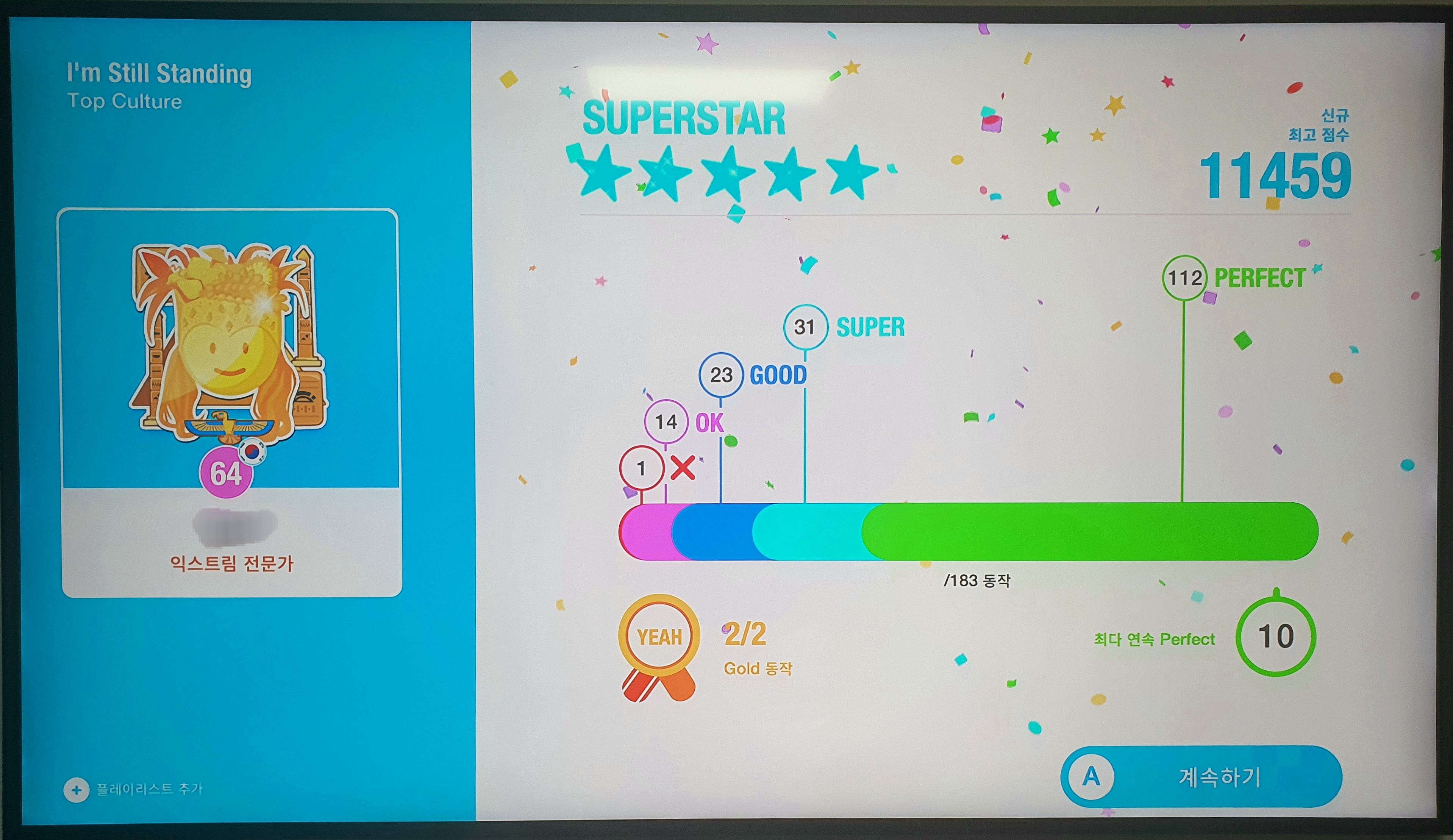 춤을 얼마나 잘 췄는지 점수로 나옵니다. 2000점을 넘길 때마다 별이 하나씩 나오고, 10000점 이상이면 별이 총 5개가 됩니다. 그리고 11000점을 넘으면 수퍼스타(파란별 5개), 12000점을 넘으면 위 사진처럼 메가스타(붉은별 5개)가 주어집니다. 처음 출 때는 별 4개도 신기했는데, 점점 추다보니까 반응속도가 빨라져서 왠만하면 별 5개는 따더라고요! 근데 메가스타는 받기 정말 힘드네요.