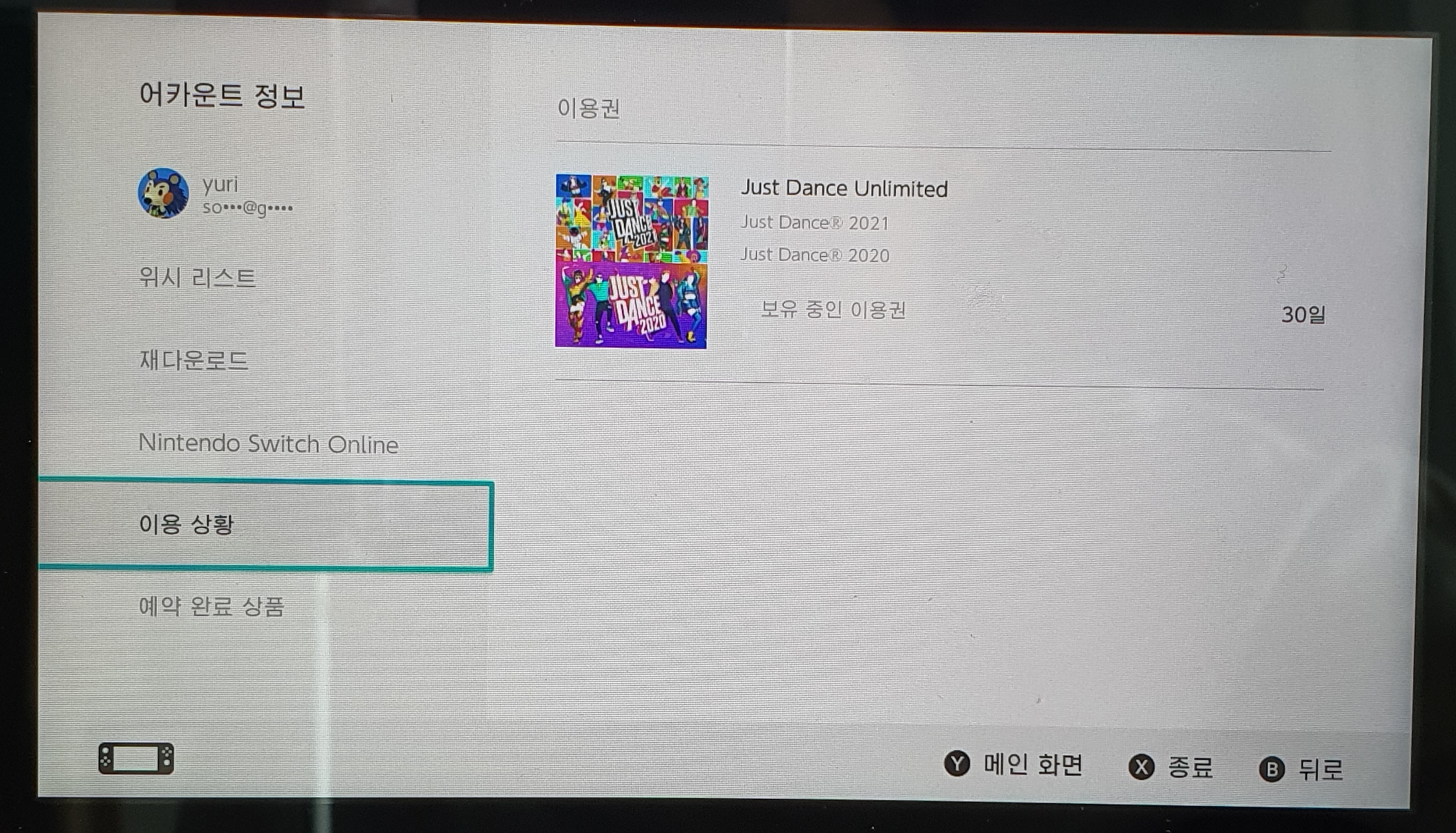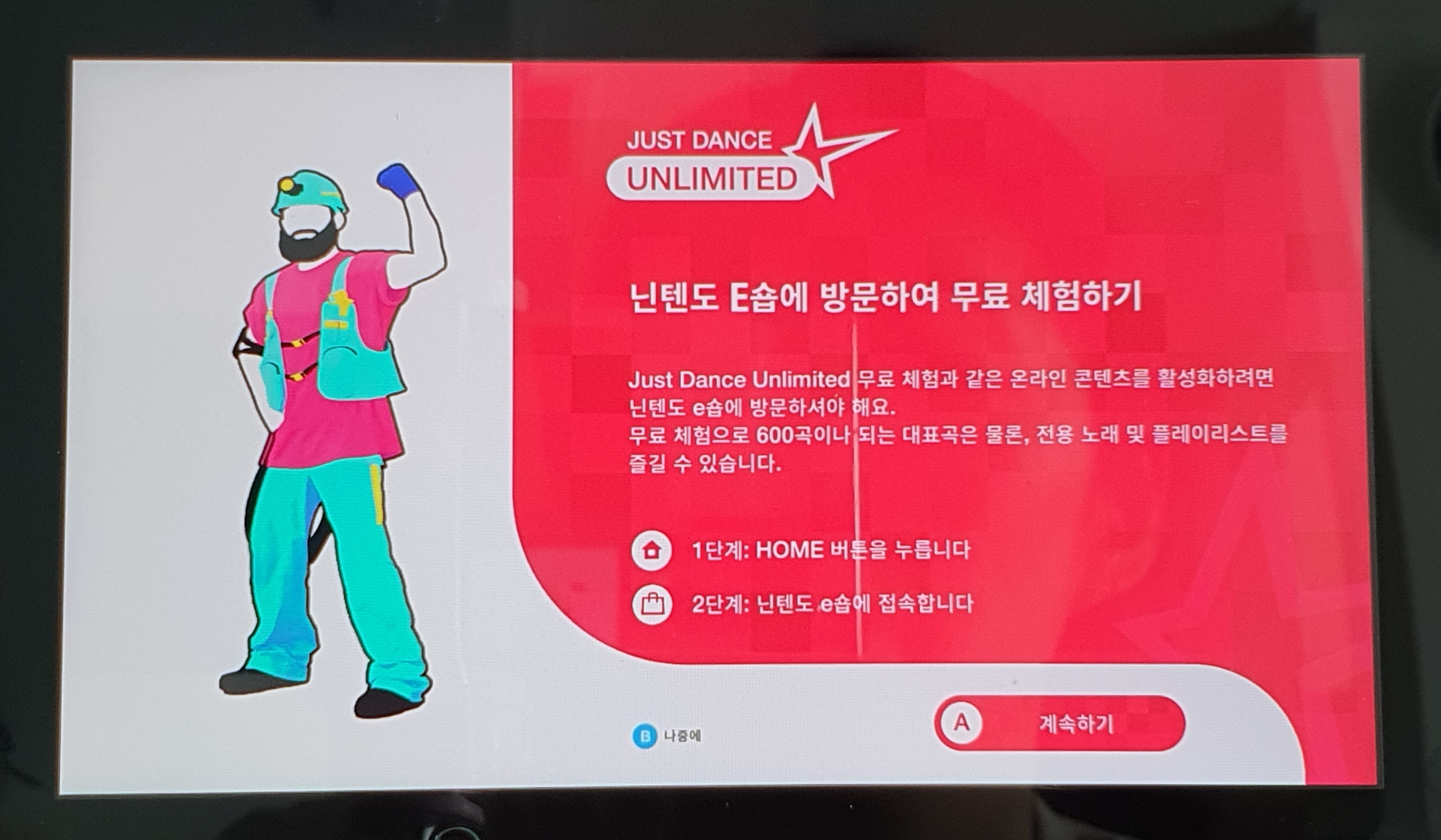 e숍에 들어가서 로그인을 하면 Just Dance Unlimited 1달 이용권을 확인할 수 있습니다. 이제 e숍에서의 볼 일은 끝났고 다시 저스트댄스로 돌아갑니다. 아까처럼 저스트댄스 메인 화면 내 잠금 해제로 들어가서 체험판 활성화를 시도합니다.