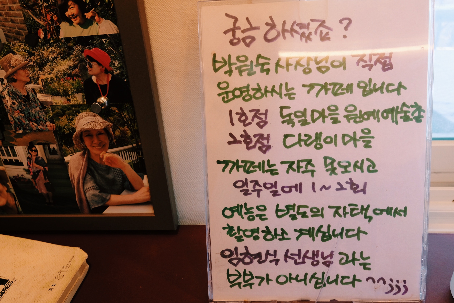 카페 한켠에는 박원숙 배우님이 동료 배우분들과 찍은 사진들이 걸려 있습니다. 그리고 그동안 배우님이 출연했던 드라마 대본도 같이 놓여 있었습니다. 제가 재밌게 봤었던 황후의 품격 대본도 있어서 반가웠네요.