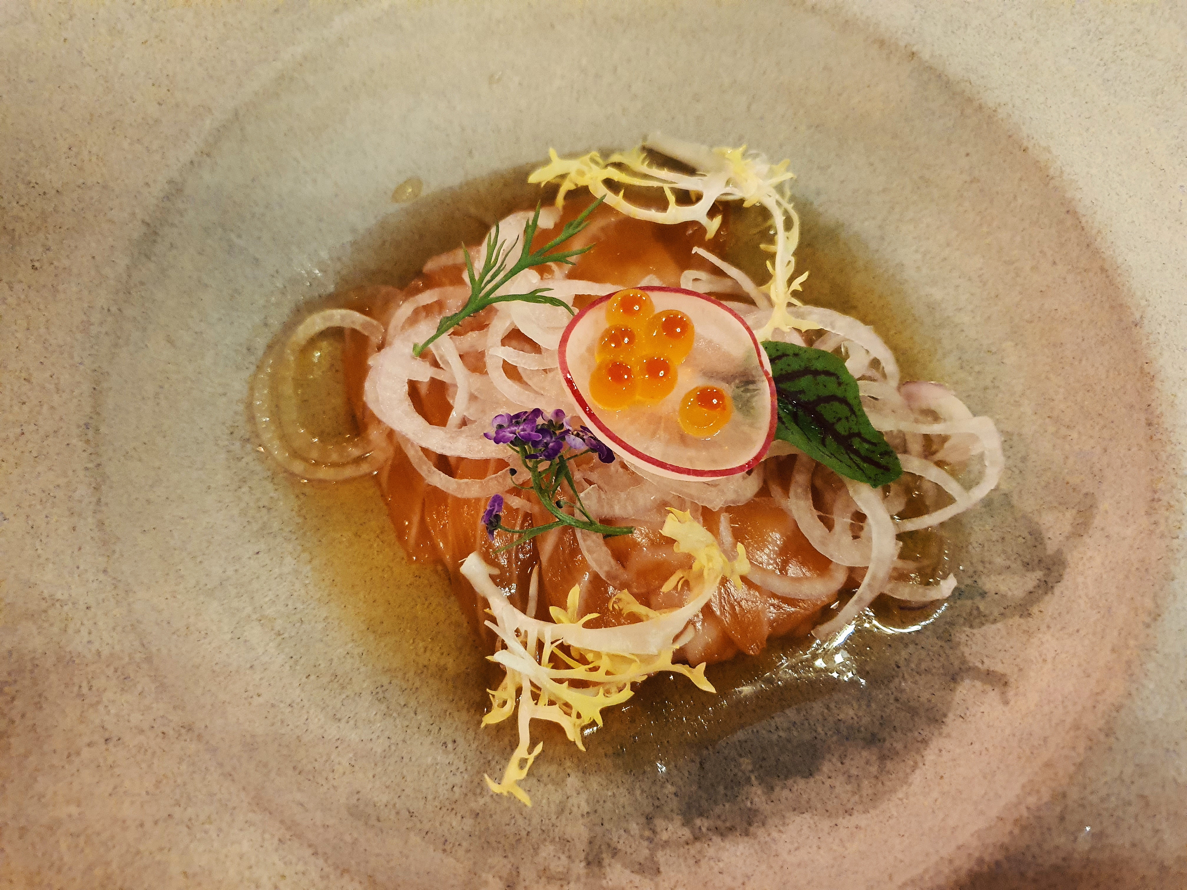 이어서 연어홍시폰즈가 나왔습니다. 폰즈는 유자나 감귤로 만든 일본 소스인데요, 살짝 연하게 만들어서 연어 위에 양파 등 채소와 함께 부어준 것 같습니다. 탱글탱글한 연어알을 위에 얹어 비주얼에 고급스러움을 더했습니다. 연어를 먹을 때마다 연어알 하나씩 얹어 먹었는데, 톡 터지면서 흘러나오는 연어알의 감칠맛이 좋았습니다. 다만, 연어알이 좀 더 많으면 좋았을 것 같아요.
