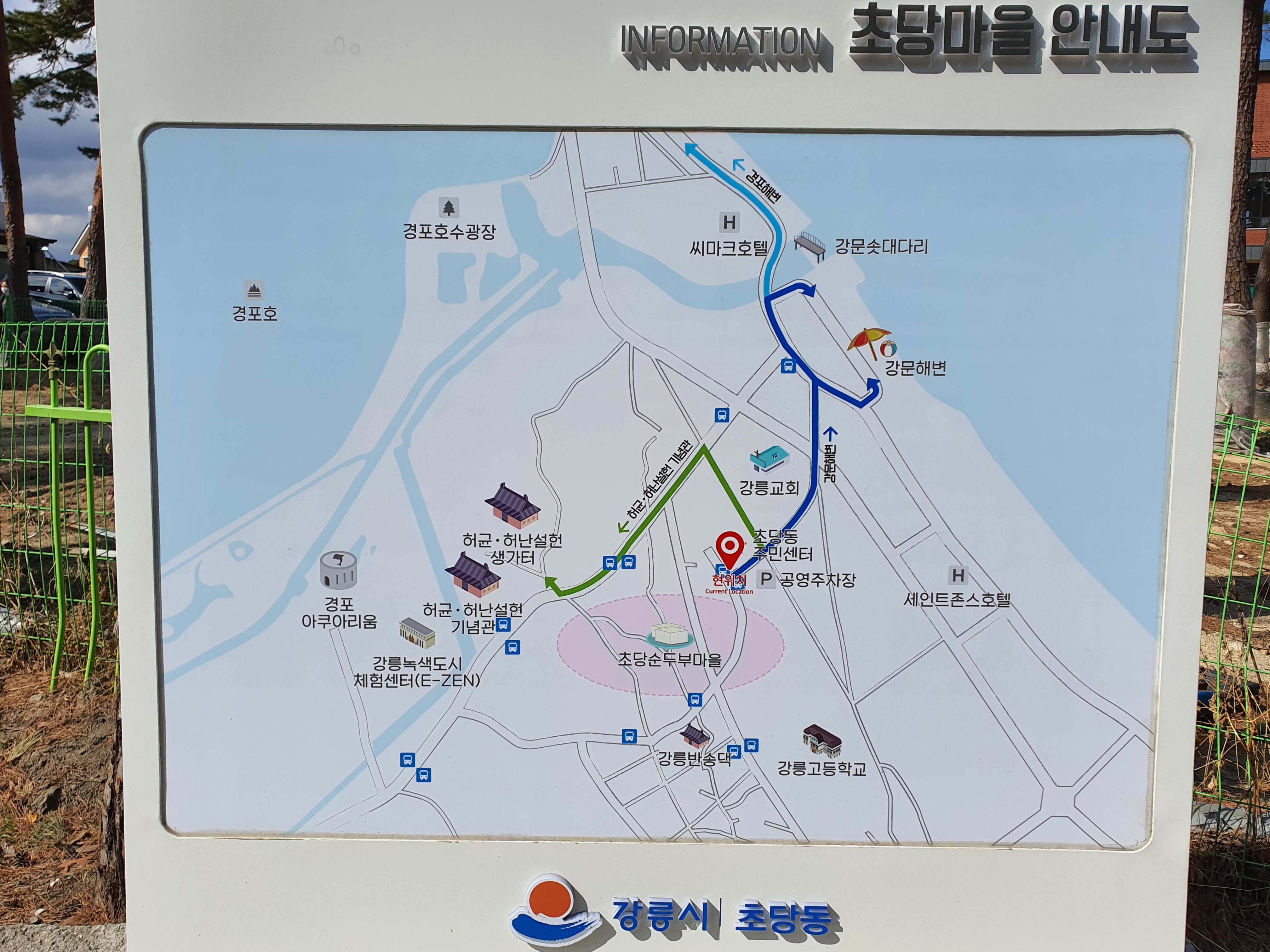 경포대 해수욕장에서 어느 정도 소화를 시킨 후, 초당순두부마을에 순두부 젤라또를 먹으러 갔습니다. 초당순두부마을은 경포대 해수욕장에서 차로 5분 정도 걸리는데, 아래 지도를 보시면 얼마나 가까운지 짐작하실 수 있어요.