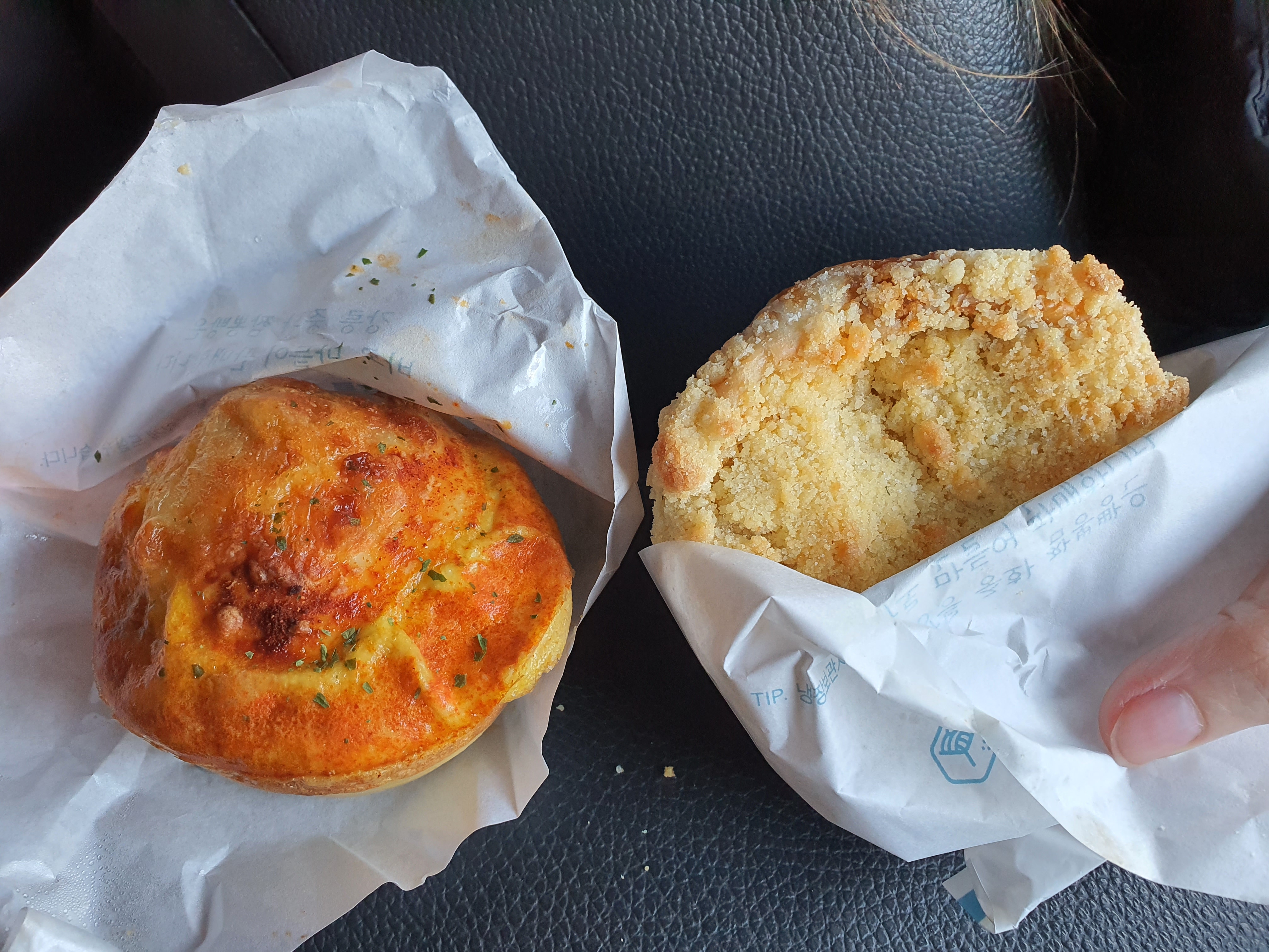 저희는 차에서 음식을 먹었어요. 불짬뽕빵은 진짜 맵습니다. 먹다 보면 점점 속에서 올라오는 매운맛인데, 약간 캡사이신이 들어간 것 같아요. 저는 개인적으로 고추잡채소보루가 더 맛있었어요. 꽃빵의 업그레이드 버전이랄까요? 소보루의 단 맛과 고추잡채의 매콤한 맛이 잘 어울리더라고요! 다만 소보루 부스러기가 많이 떨어져서 차에서 먹는 것은 별로 추천하고 싶진 않습니다.