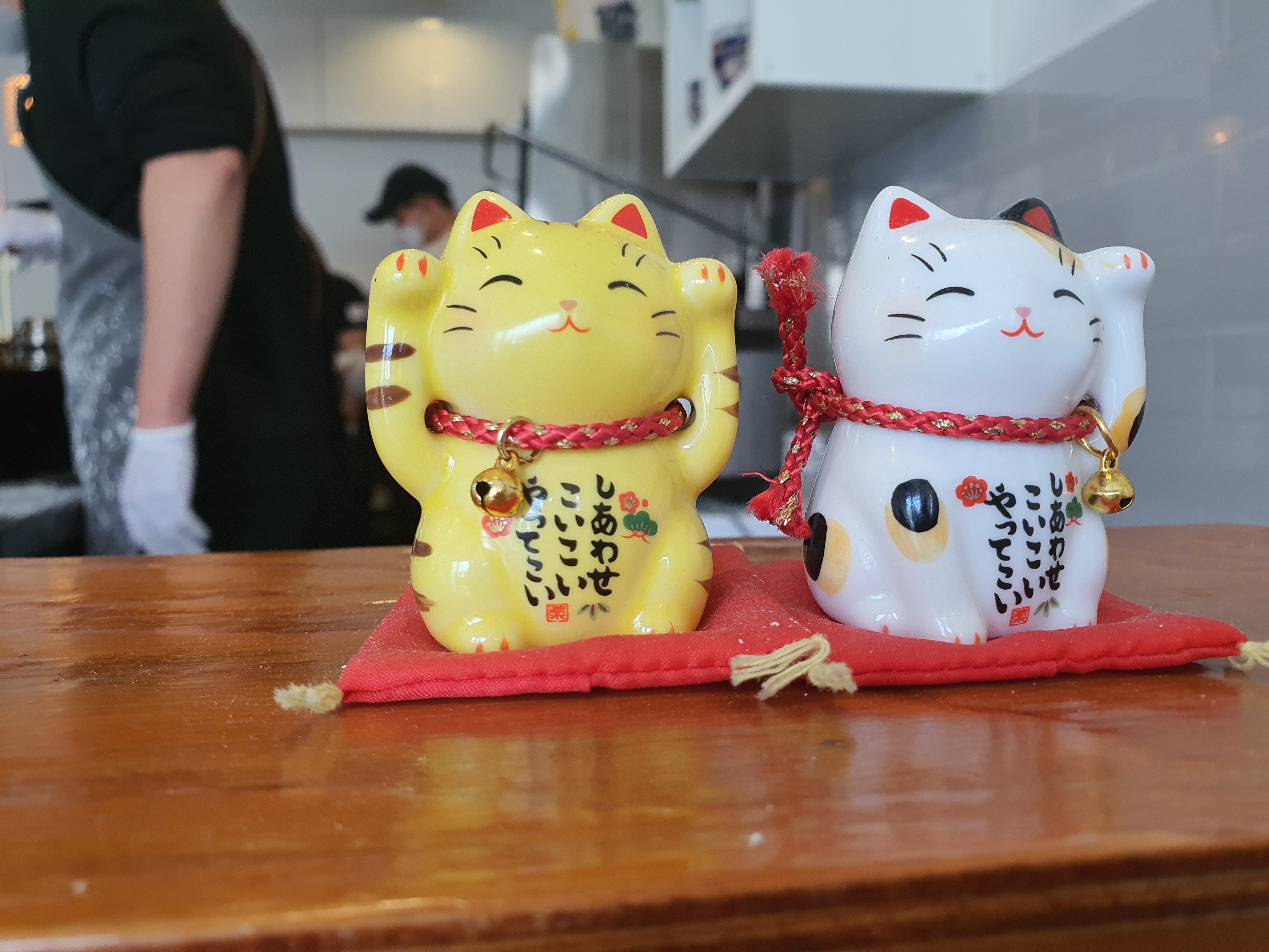 가게는 작지만 4분의 직원이 정성스럽게 튀김을 만들고 음식을 준비하였습니다. 가게 여기저기에는 귀여운 고양이 장식품이 있었는데, 수저 받침대도 고양이라 너무 귀여웠네요.