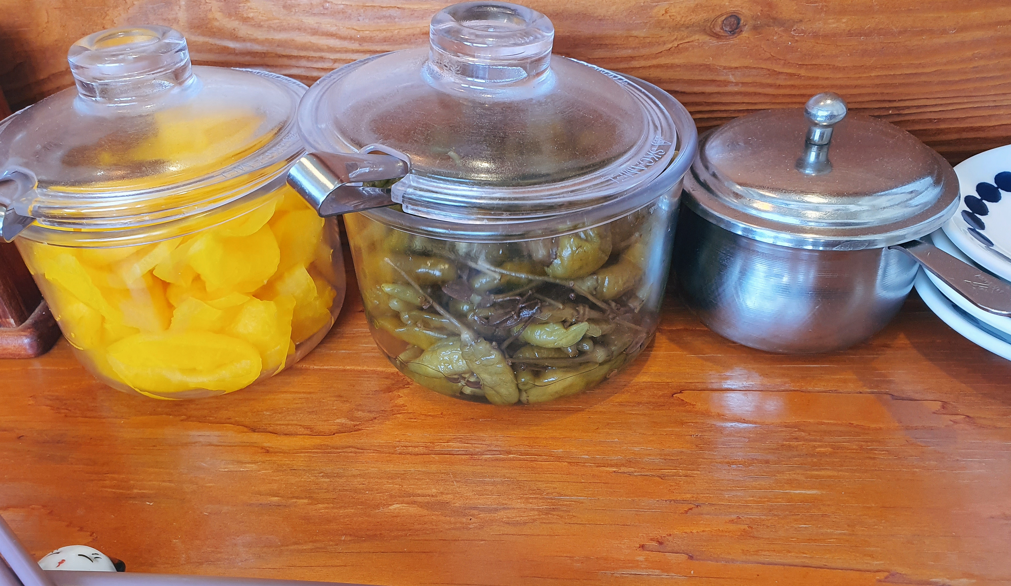 단무지와 산고추장아찌, 그리고 시치미가 들어있습니다. 옆에 있는 작은 앞접시에 덜어먹으면 되어요.