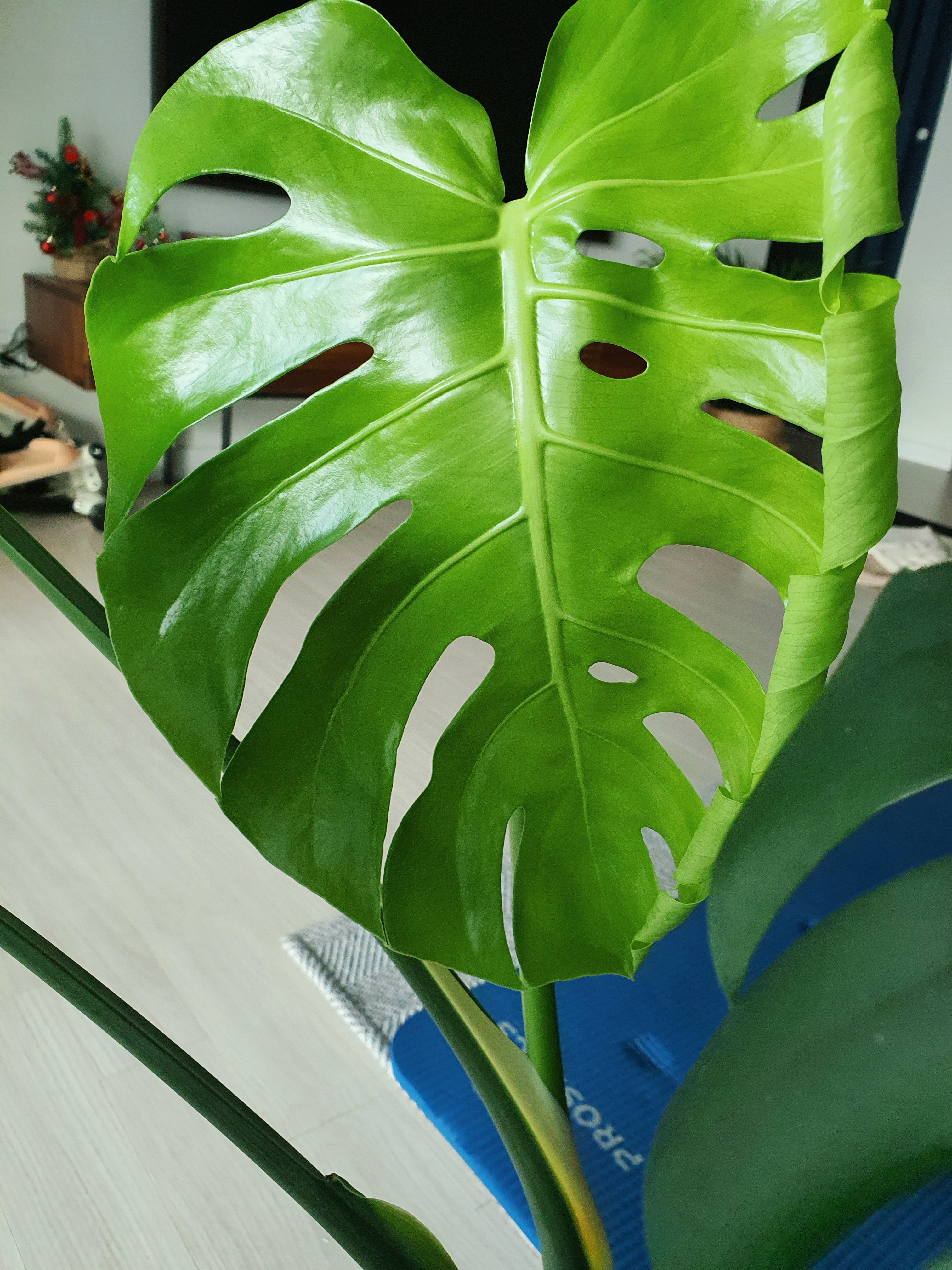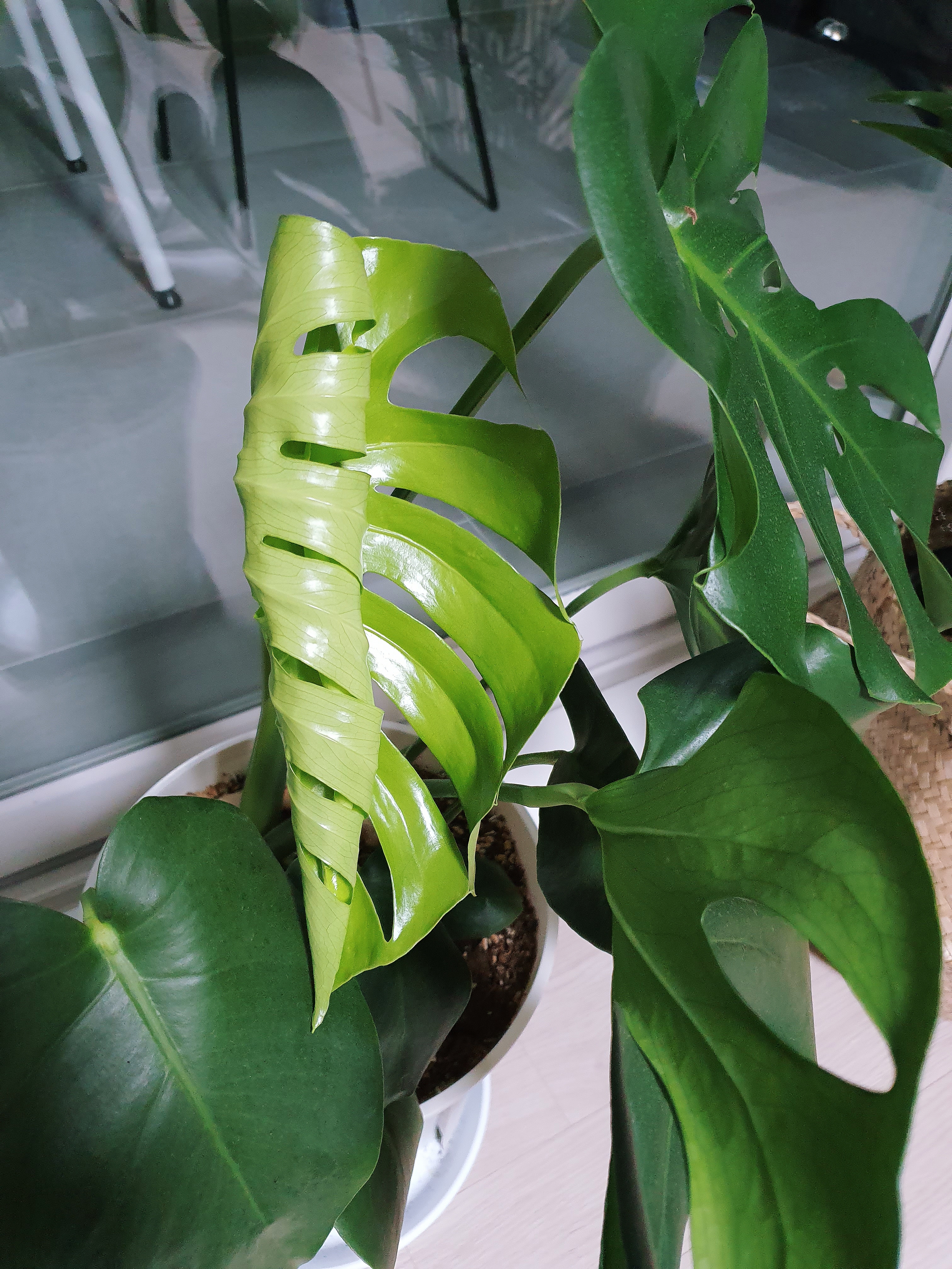 2019년 11월, 처음으로 새 잎을 내었습니다. 반질반질하고 연두연두한 게 정말 예쁩니다. 아래쪽 잎은 작고 구멍이 전혀 없거나 아예 없는데요, 몬스테라가 어느 정도 크면 찢어진 잎이 나오나 봅니다.