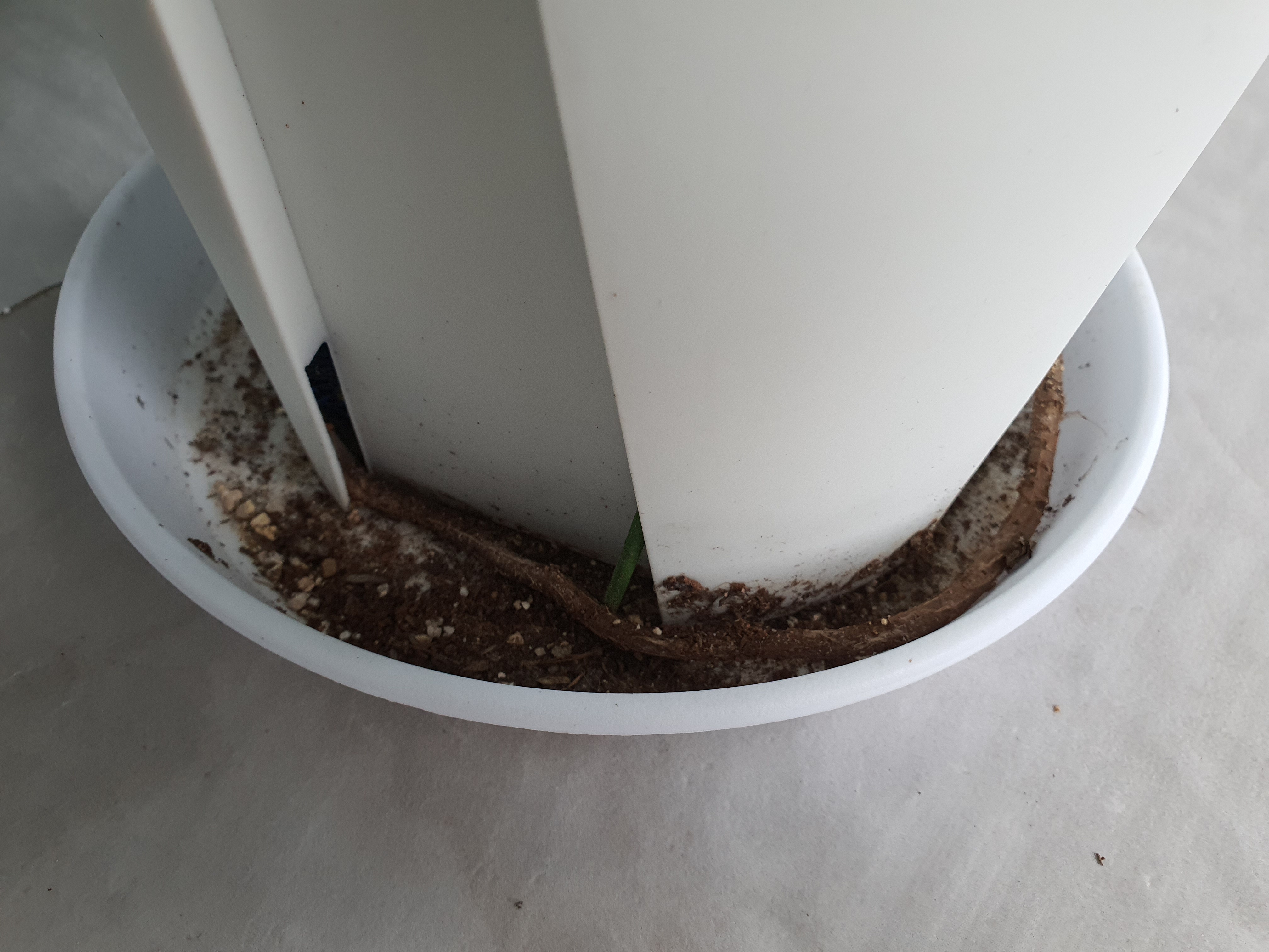 몬스테라는 식물에게 좋다는 슬릿 화분에 살고 있어요. 2020년 가을인가부터 화분을 뚫고 뿌리가 나왔습니다. 심지어 계속 길어지고 있어서 분갈이할 때 잘라야 되나 걱정이 들었습니다.