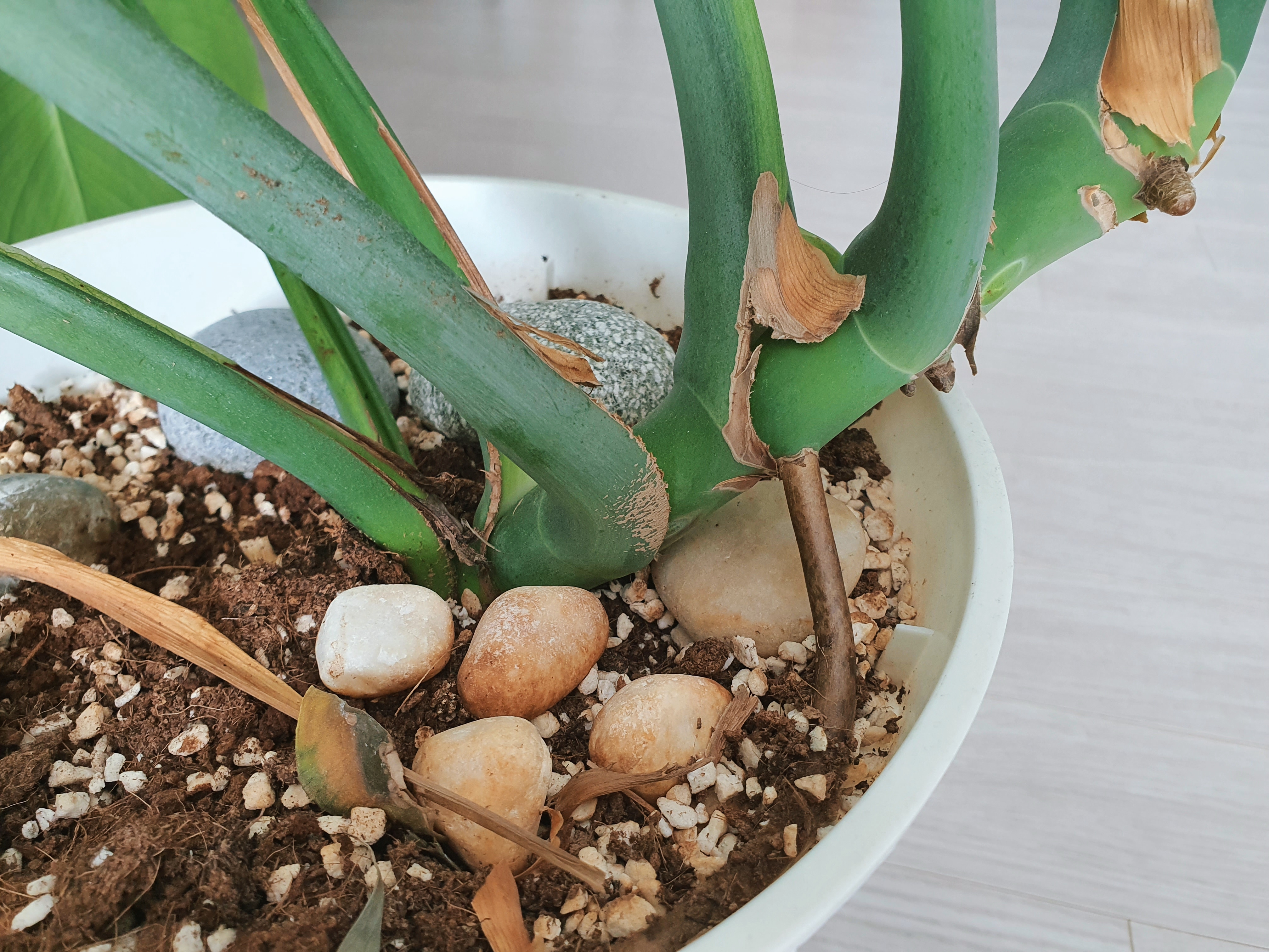 그런데 사진에서도 볼 수 있듯 잎 끝이 종종 타들어가곤 했습니다. 물은 1주~1주 반에 한 번씩 물받침대에 물이 흘러나올 때까지 줬어요. 나중에 알고 보니 흙이 물을 잘 머금지 못해서 물부족 증상이 나타난 것이었습니다. 흙을 너무 말리면 잔뿌리가 말라서 하엽이나 잎끝이 마르는 증상이 나타날 수 있다고 합니다. 흙이 충분히 젖을 수 있도록 천천히 세심하게 물을 줬어야 했습니다. ㅠㅠ