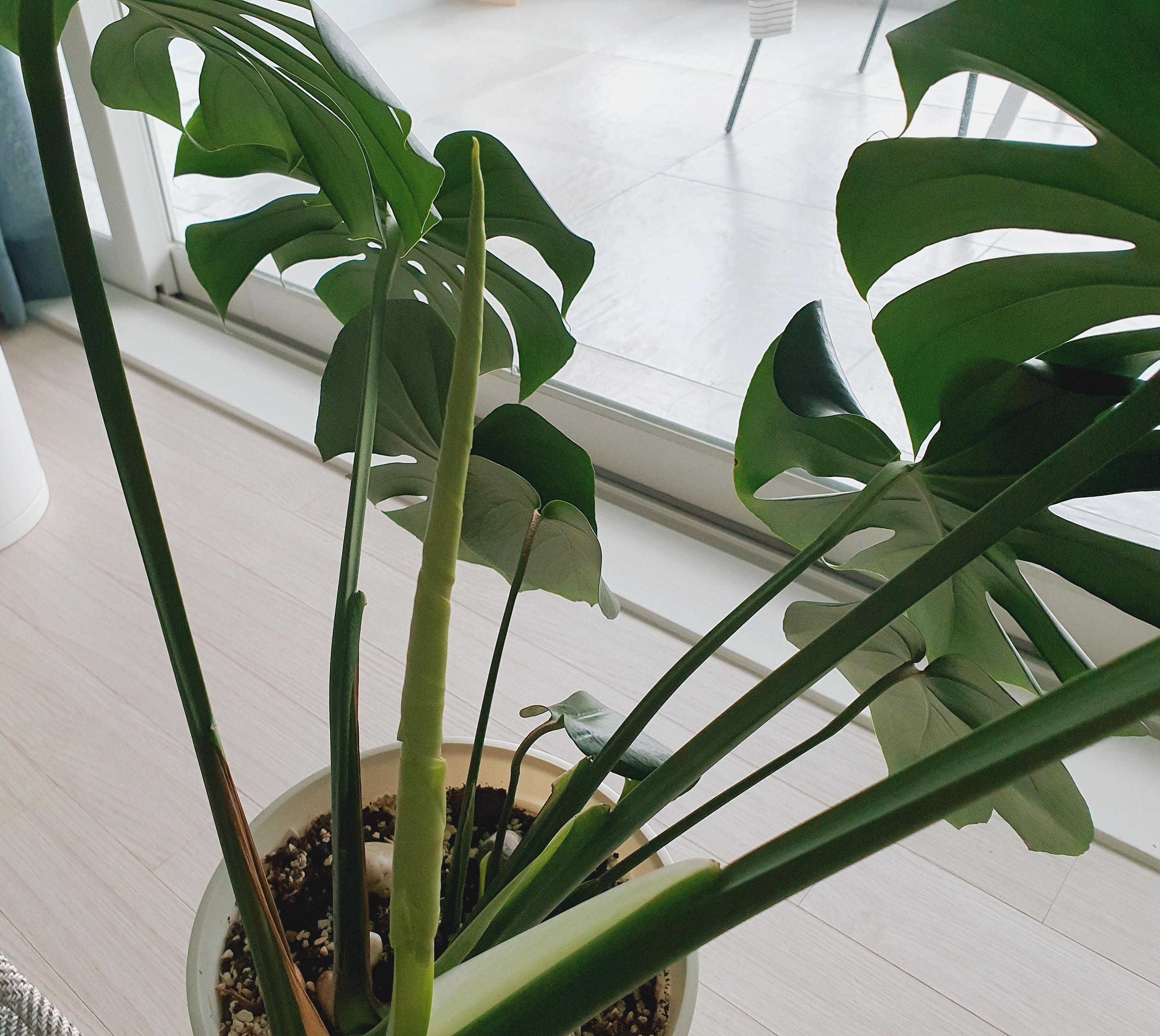 몬스테라는 마지막으로 난 잎 줄기의 옆구리에서 새 잎이 나옵니다. 제가 화분을 돌려가면서 키우지 않아서 그런가, 저희 집 몬스테라 뒷모습을 보면 이렇게 V자 형태를 띱니다.