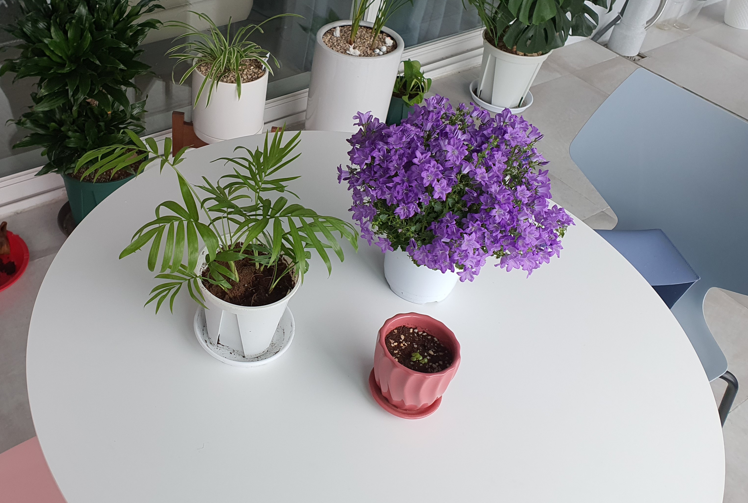 지는 꽃도 많고, 새로 피는 꽃도 많은 캄파눌라입니다. 시든 꽃은 정리해 가면서 키워야 더욱 풍성하게 꽃을 볼 수 있다고 하는데, 저는 그게 잘 안되더라고요. 그래서 그냥 자유롭게 키우고 있습니다. 저면관수만 해도 아주 잘 자라서 초보자 분들도 키우기 쉬운 식물인 것 같아요.