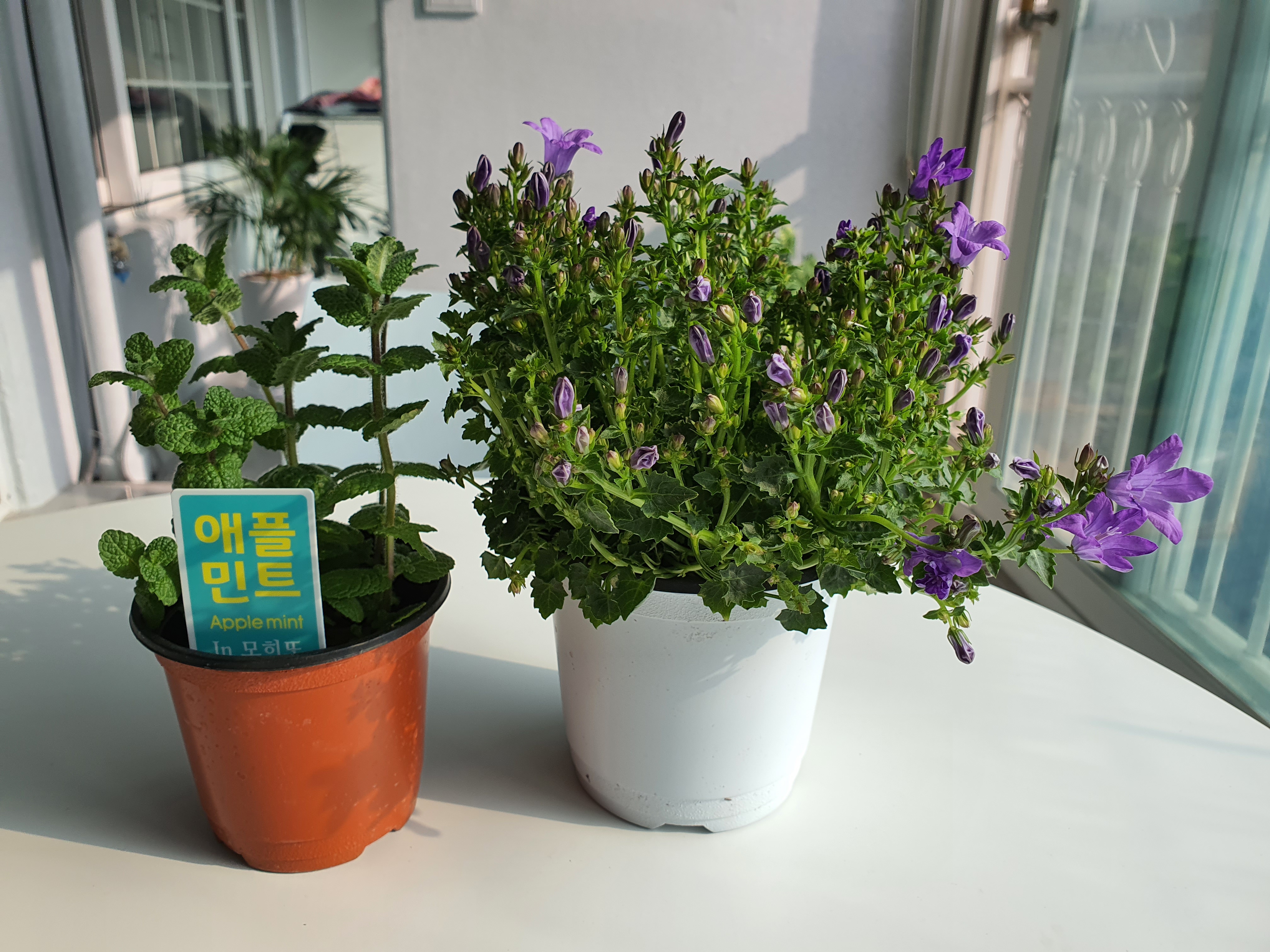 화원에서 꽃이 이제 막 피려고 준비 중인 캄파눌라로 데려왔습니다. 옆에는 같이 데려온 애플민트에요. 먹는 식물에 관심이 많은 남편이 골랐습니다.