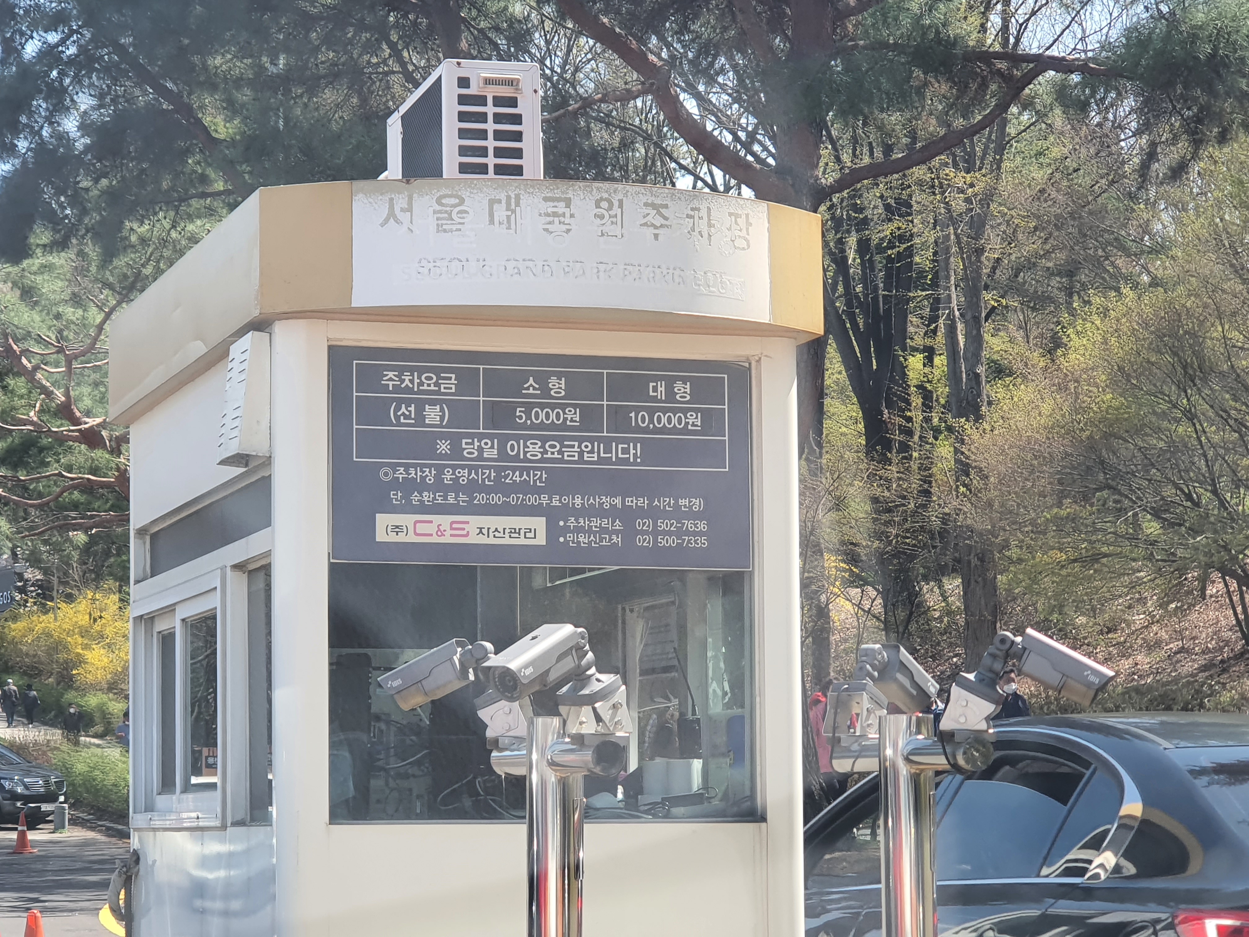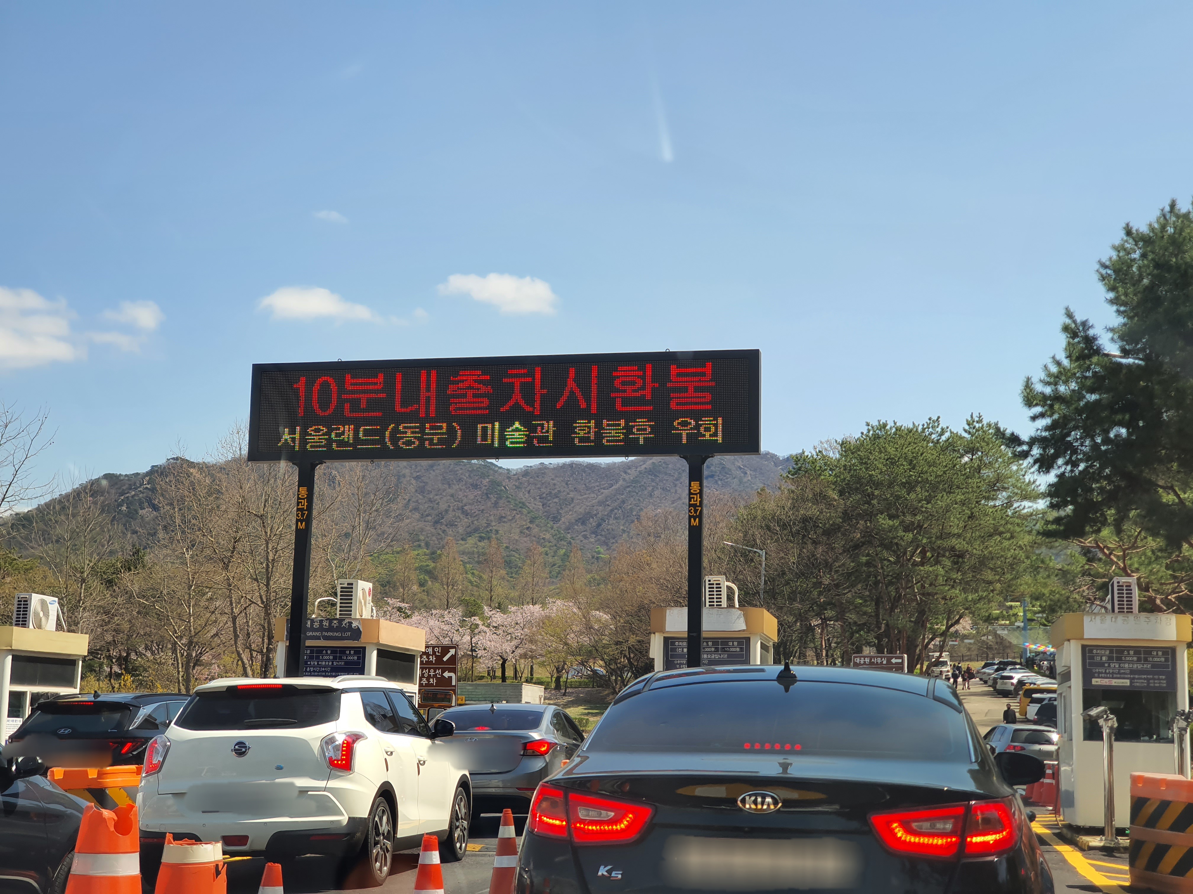 주차료는 5,000원입니다. 단 10분 내 출차하면 환불됩니다. 오후 1시쯤 도착했는데, 생각보다 주차 공간은 여유가 있었어요. 그런데 벚꽃 구경을 마치고 나갈 때는 들어오는 차가 정말 많았습니다. 오후 3시쯤이었는데, 고속도로에서 서울대공원 빠지는 쪽 도로부터 막히더라고요. 역시 놀 때는 일찍 놀고 일찍 집에 가는 게 좋은 것 같습니다.