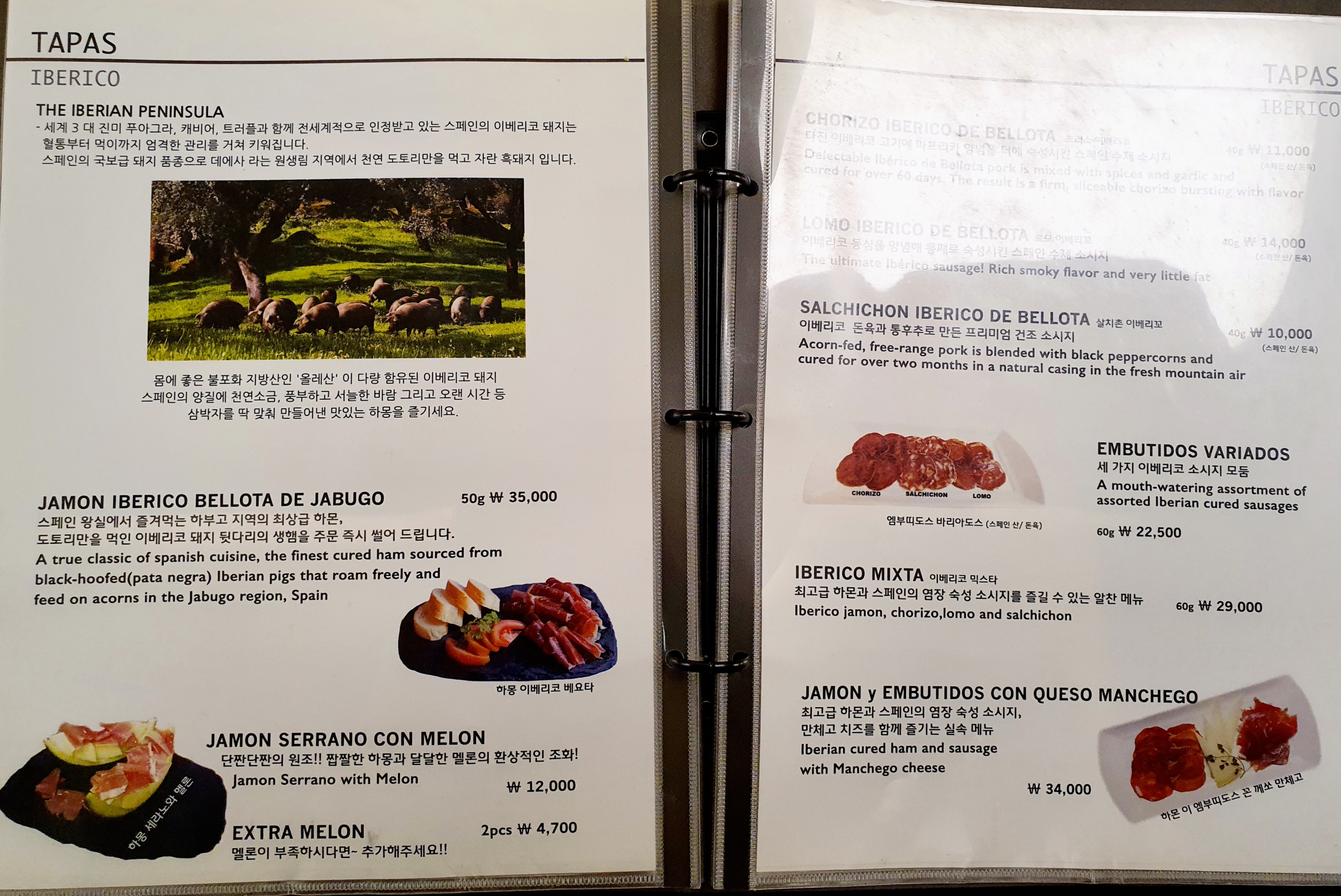 스페인하면 떠오르는 하몽입니다. 이베리코를 이용해 만든 하몽인데 가격은 50g에 35,000원입니다. 이 메뉴들은 식사라기보다는 술안주입니다. 와인과 곁들여 먹으면 너무 좋을 것 같습니다.