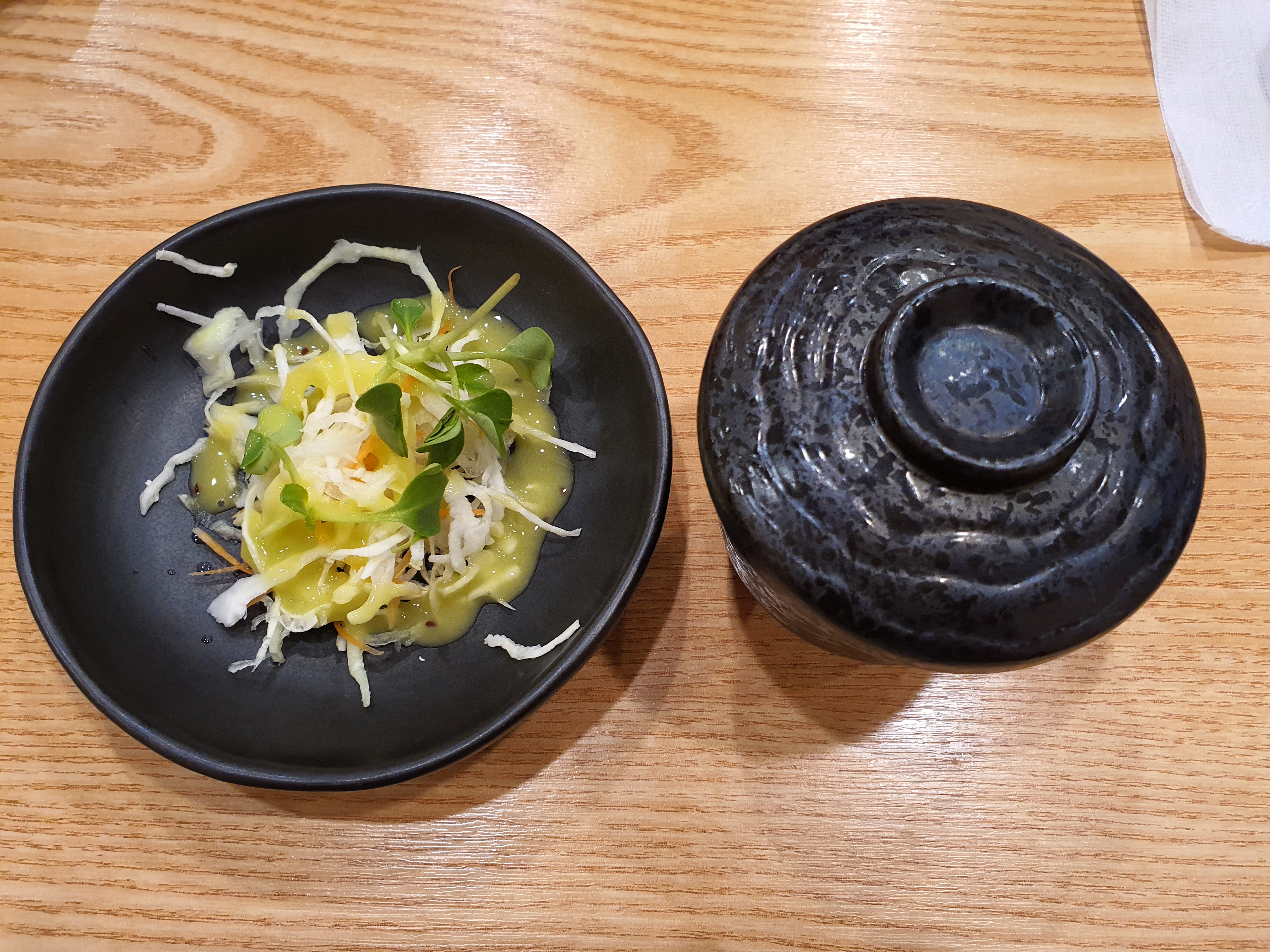 애피타이저로 양이 적은 샐러드와 표고버섯 한 조각이 들어간 계란 푸딩이 나왔어요. 계란 푸딩은 가쓰오부시 육수로 만든 듯, 가쓰오부시 향이 느껴졌고 아주 부드러웠습니다. 계란 푸딩은 제가 정말 좋아하는 애피타이저이기도 합니다 :)