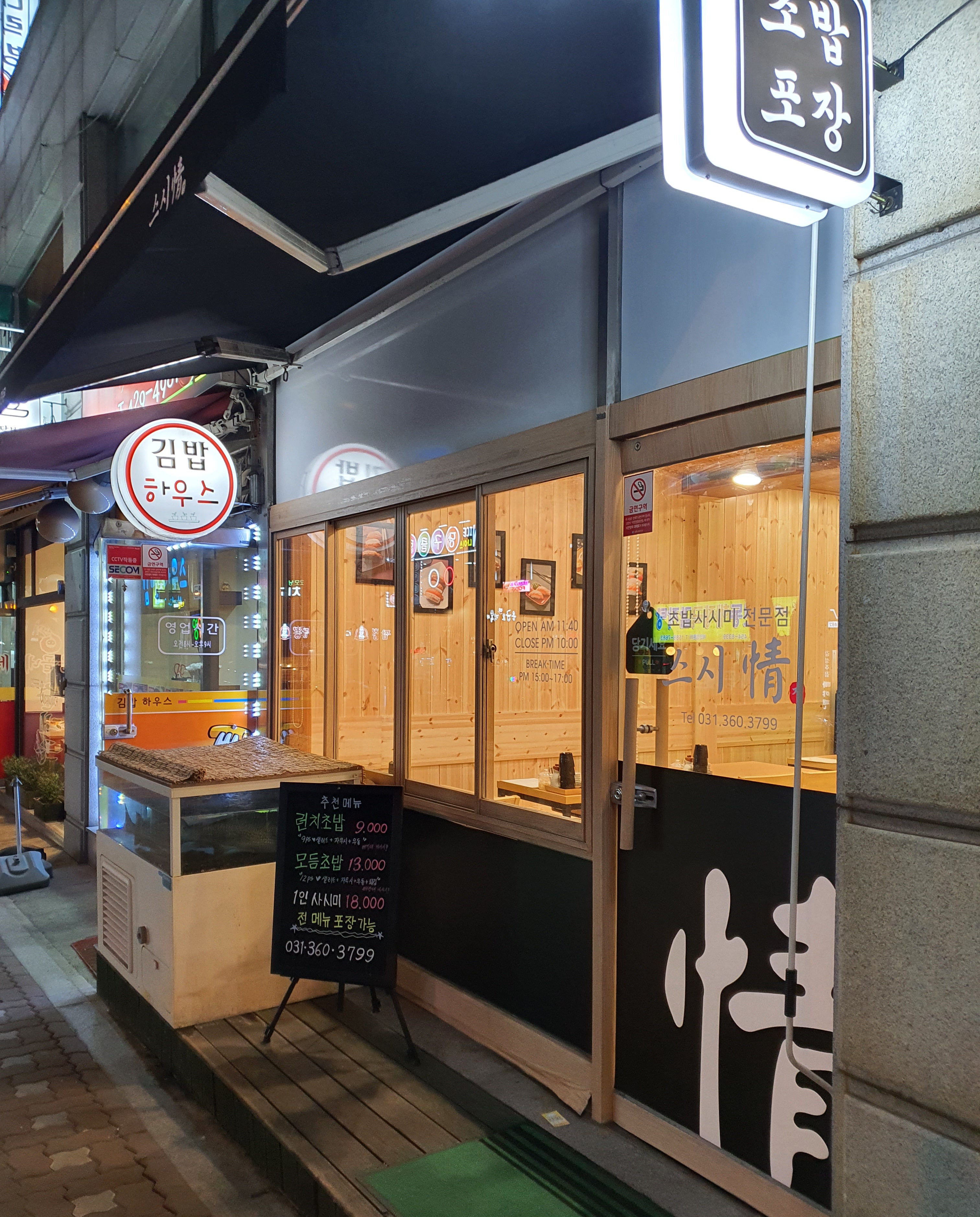 퇴근길에 저녁을 해결하러 동네에 새로 오픈한 초밥집, 스시정에 들렀습니다. 동네에 다양한 종류의 가게들이 왔다가 사라졌는데 초밥집은 처음입니다. 며칠 전부터 눈여겨보고 있었는데, 손님들이 제법 있는 것 같아서 가보기로 했습니다.