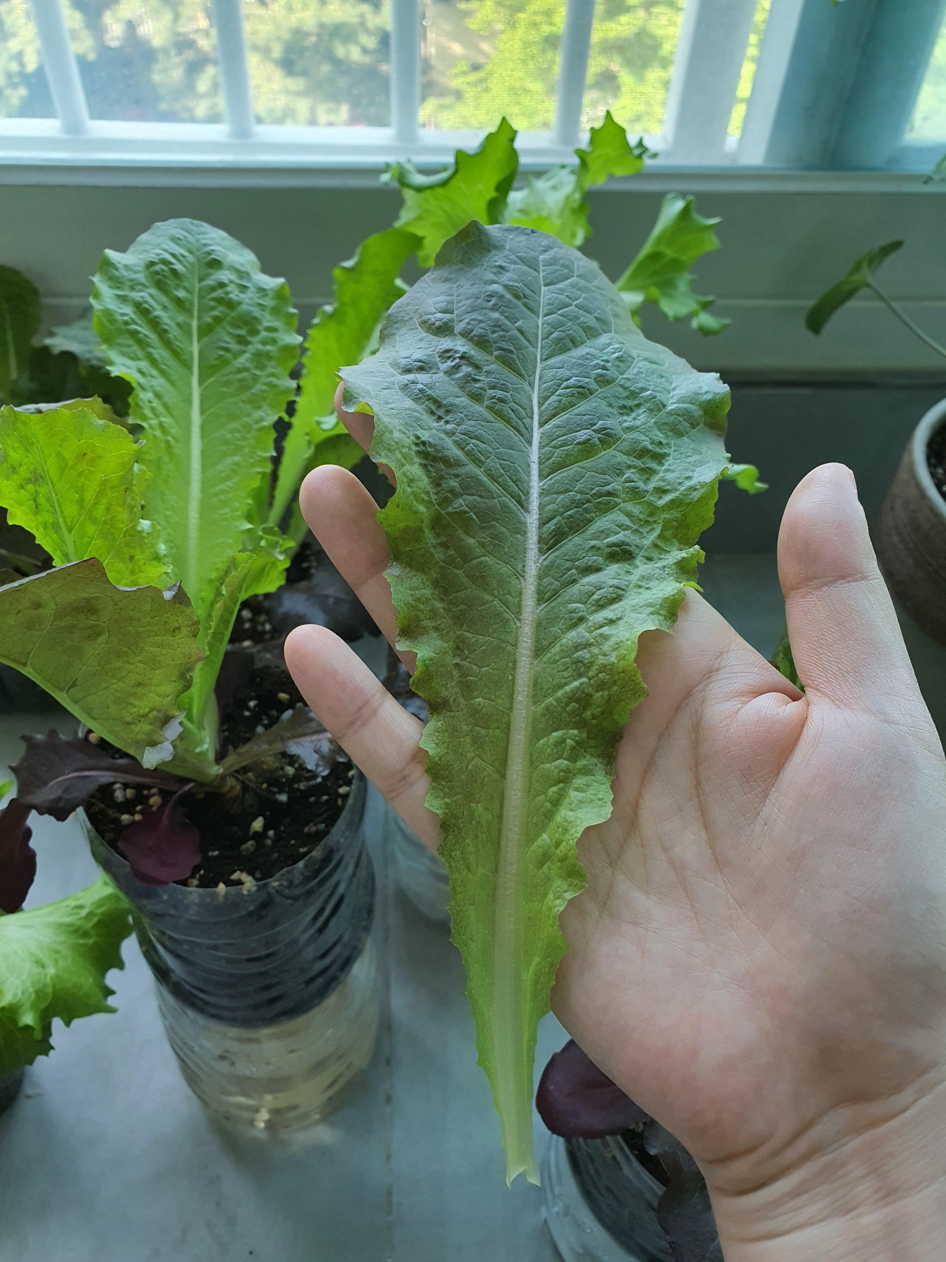 상추의 길이는 제 손바닥만 합니다. 그런데 상추가 좁고 길게 자라는 이유는 종자의 특성일까요? 저도 정확히는 모르겠습니다.