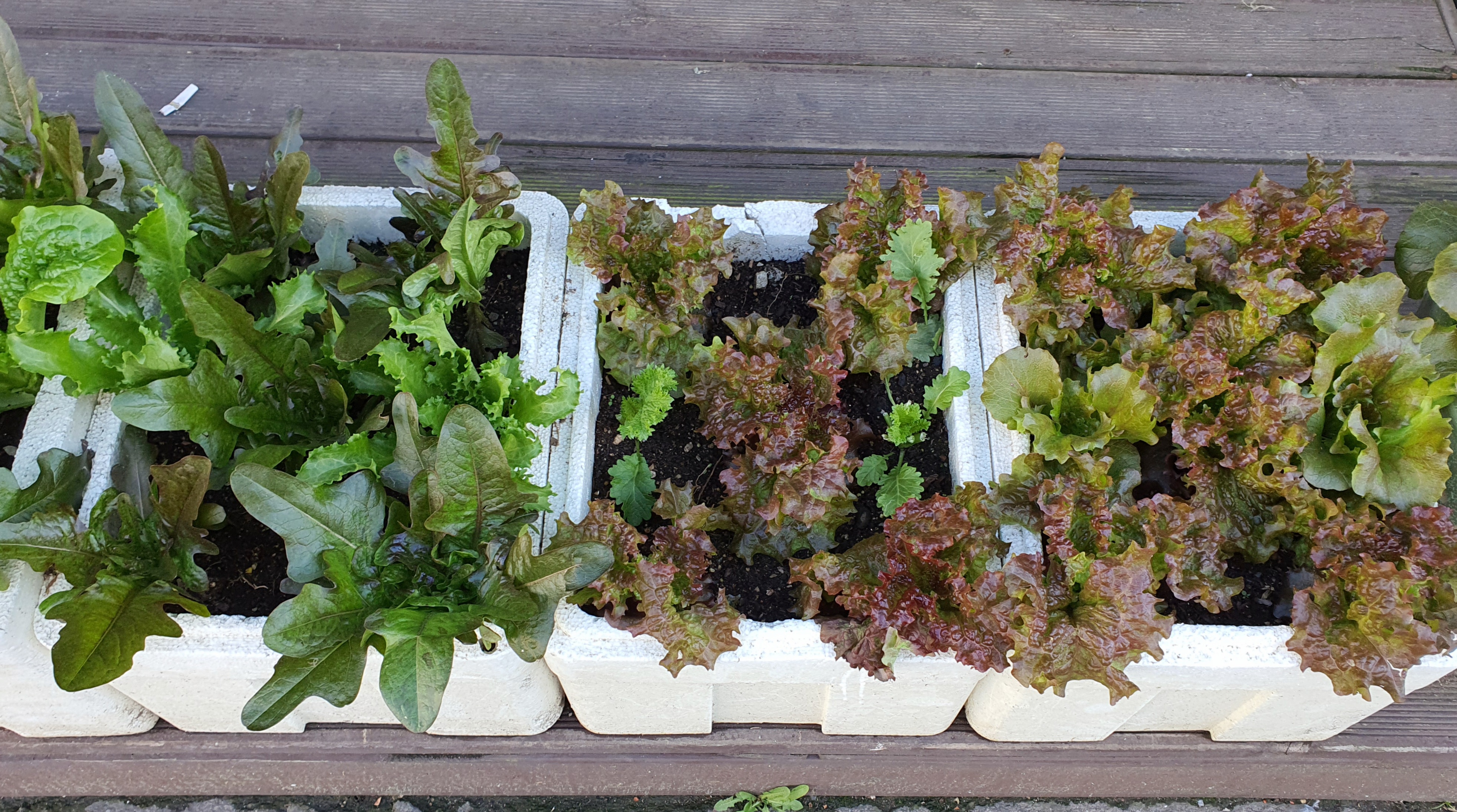 아래 사진은 저희 동네 음식점에서 데크 위에 내놓고 키우는 채소들인데요, 아침 출근길마다 마주칩니다. 남의 자식과 비교하며 키우면 안 된다지만, 진짜 싱싱하게 잘 자라서 괜히 마음이 쭈굴해집니다. 저와 거의 비슷한 시기에 키우신 것 같은데 훨씬 잘 자랐더라고요. 심지어 여기는 해가 잘 드는 곳도 아니고, 북동향입니다. 저희 집은 남서향이고요.
